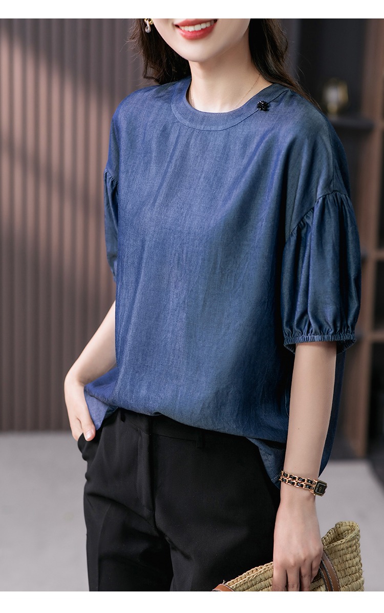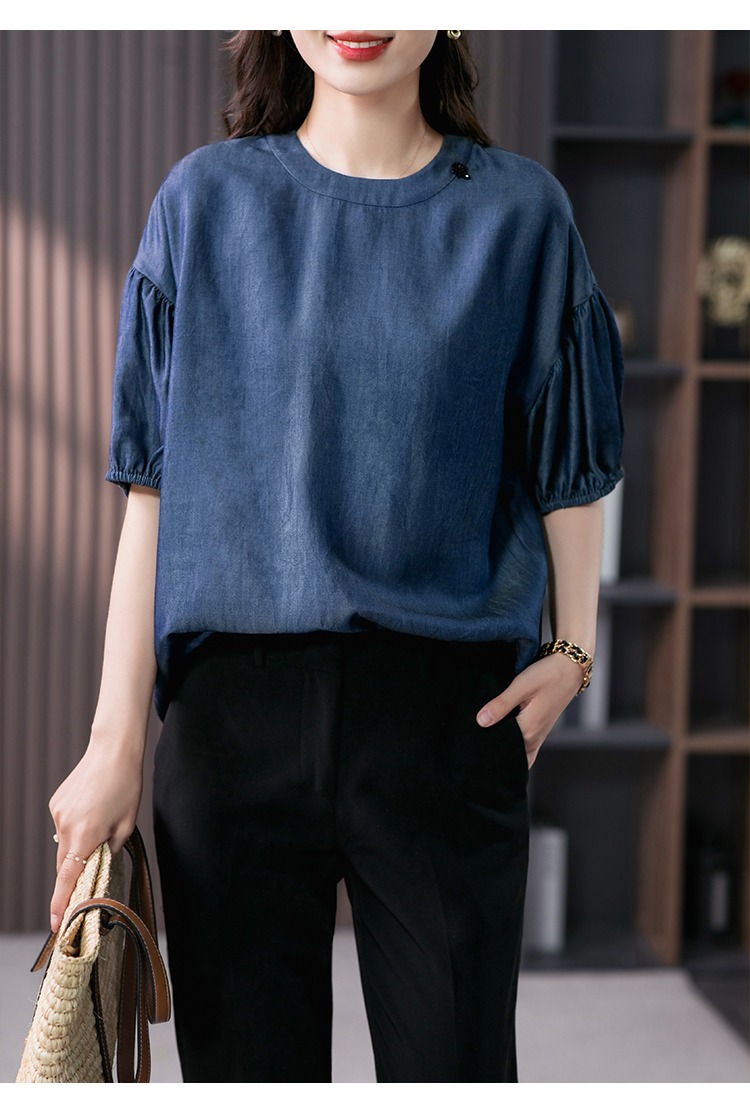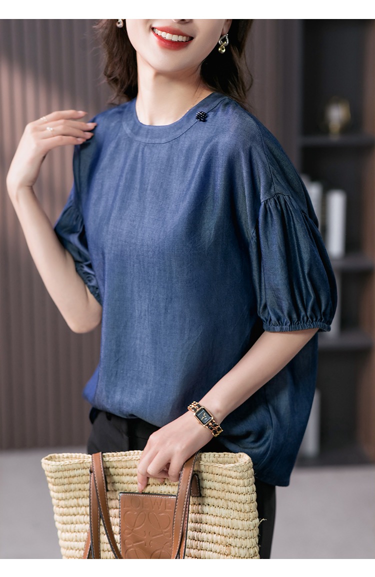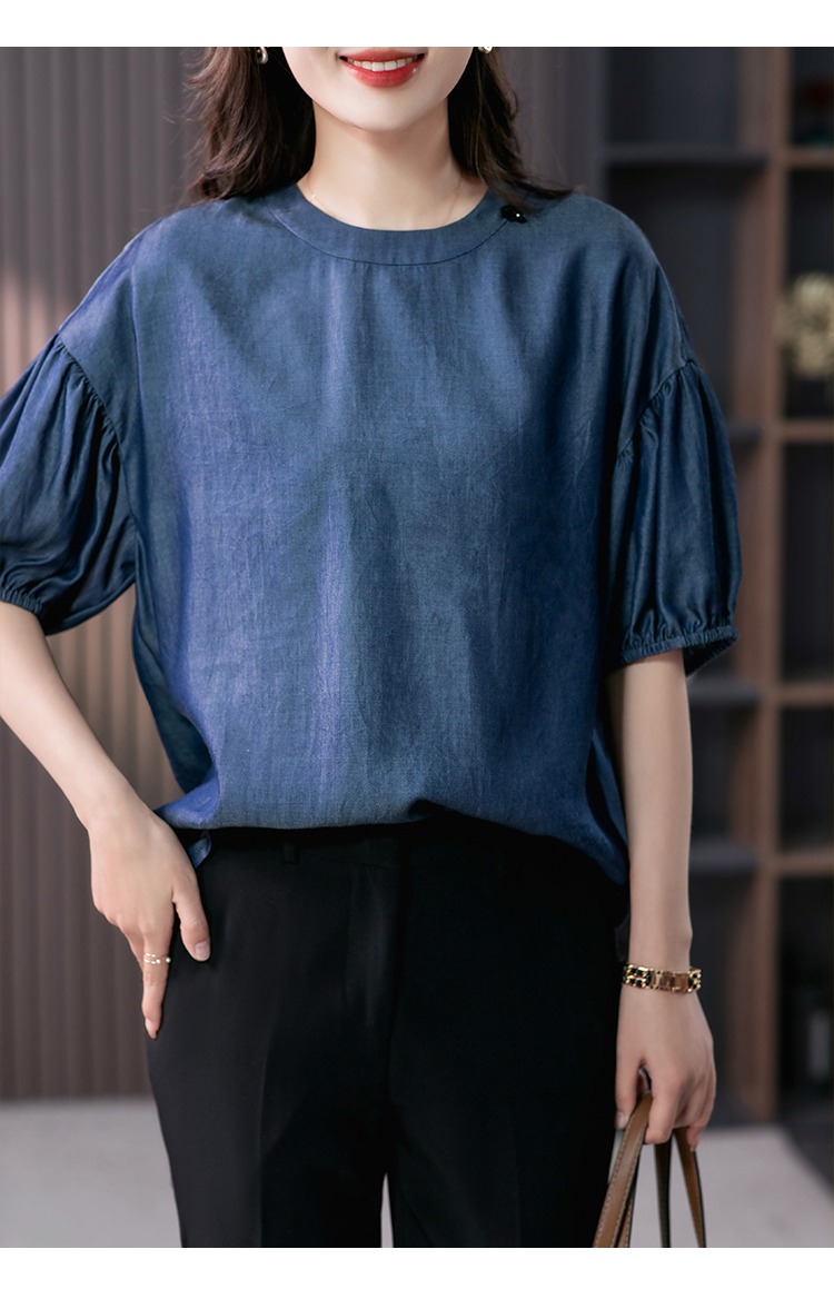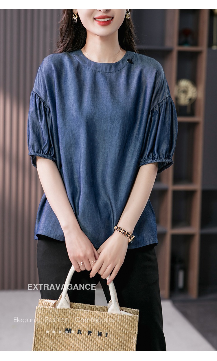 YX【现货7天】宽松休闲圆领短袖t恤韩版设计感灯笼袖上衣