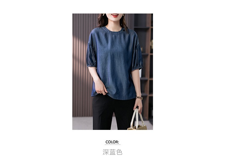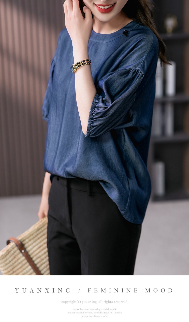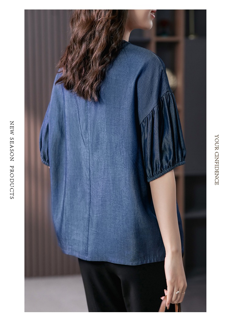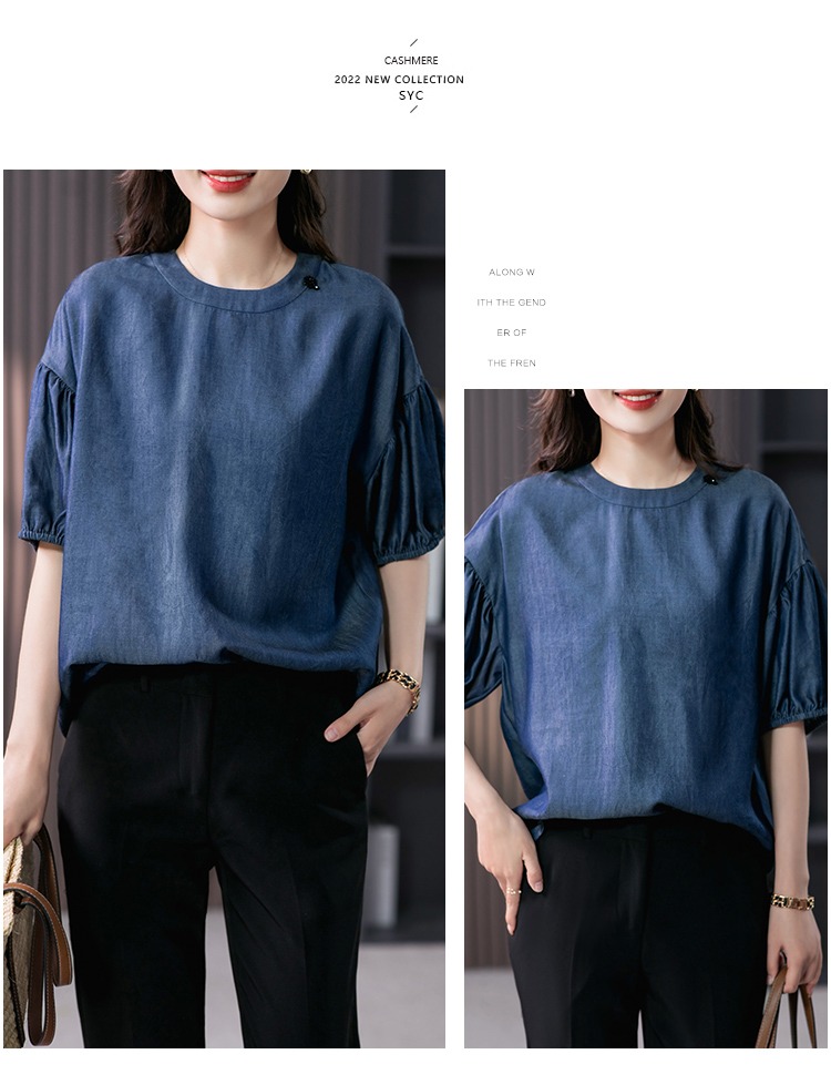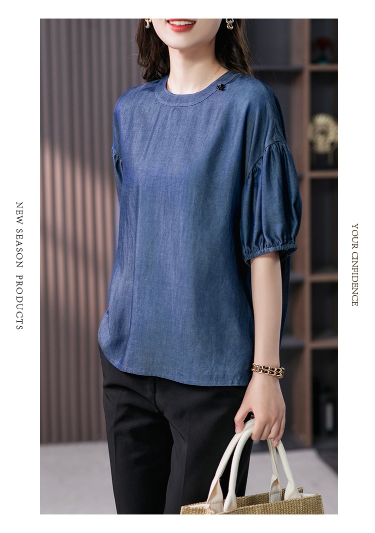 YX【现货7天】宽松休闲圆领短袖t恤韩版设计感灯笼袖上衣