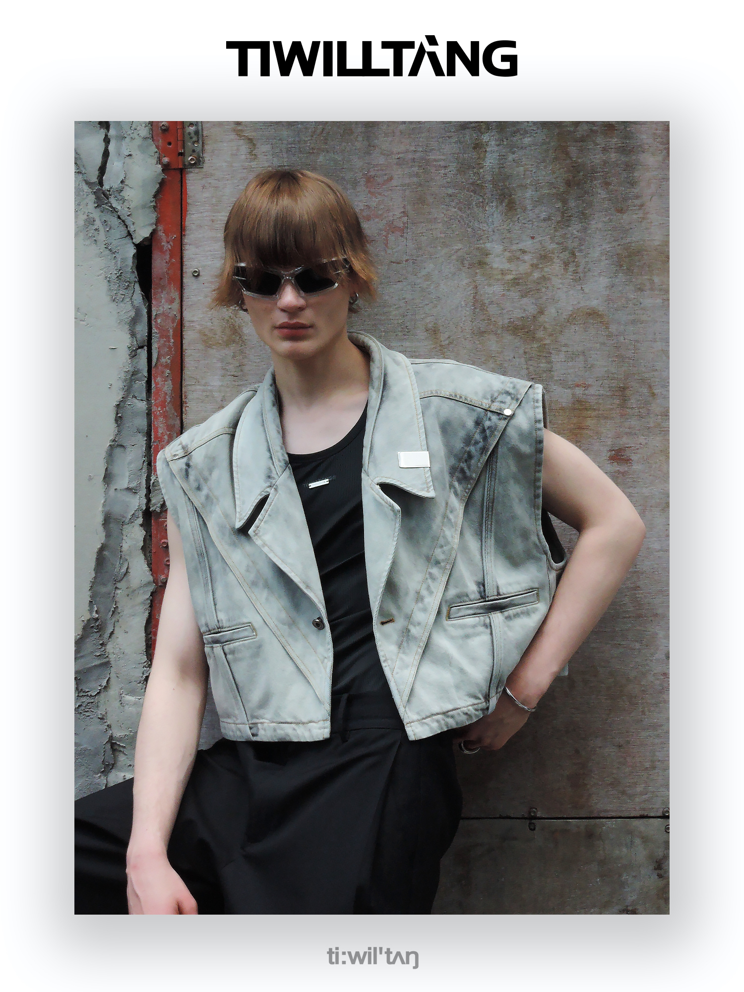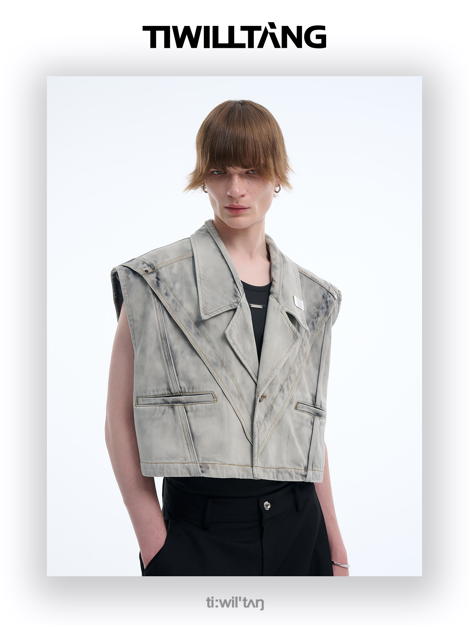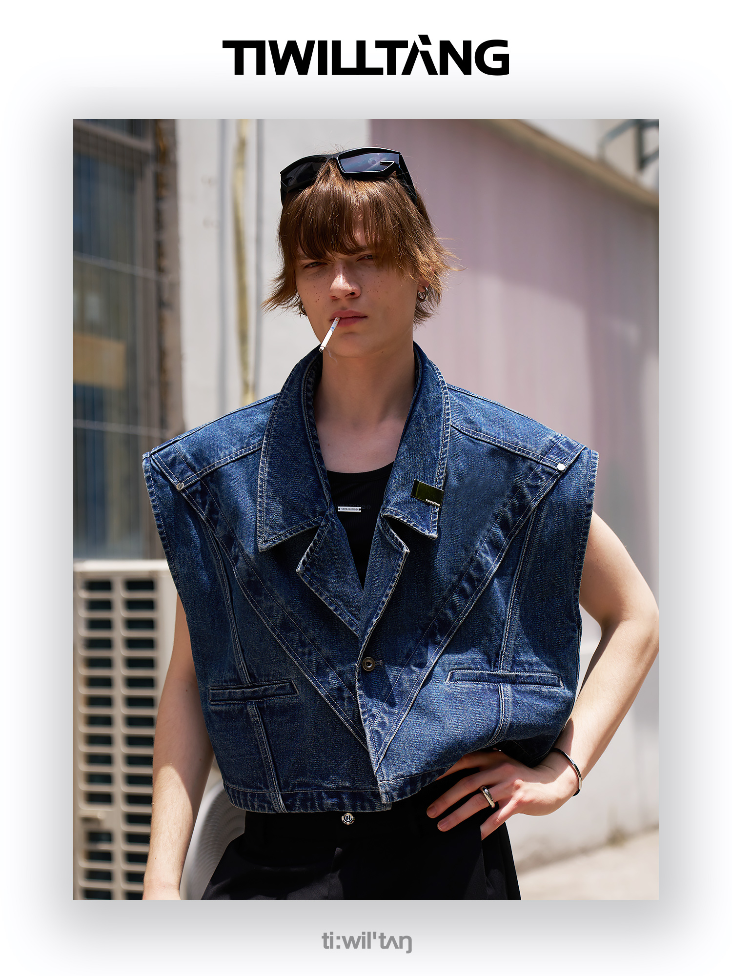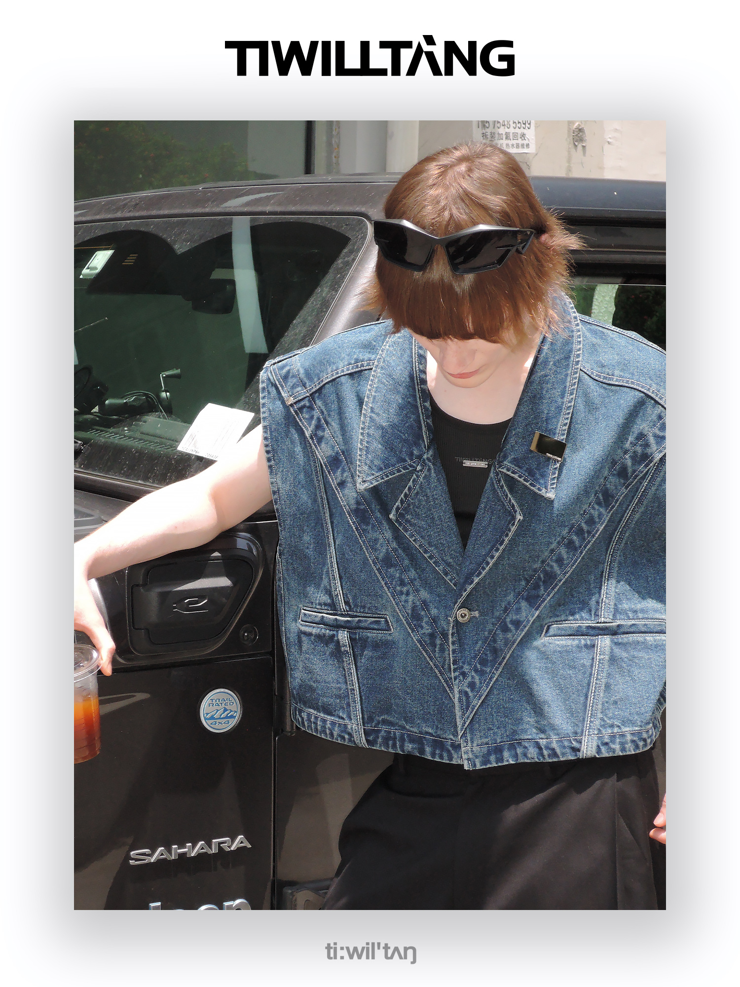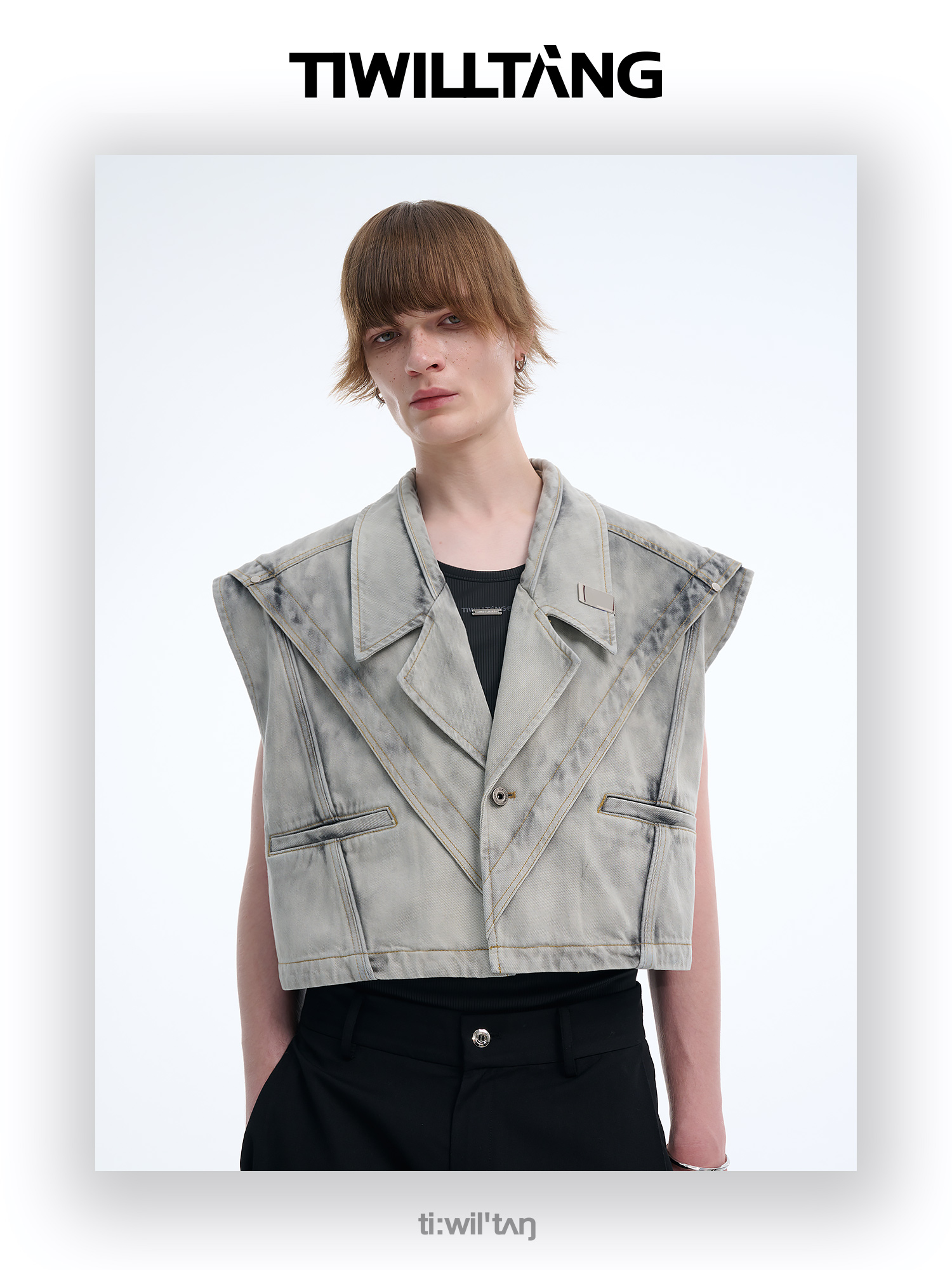 TIWILLTANG 启世录“锛淳”翻领水洗复古牛仔马甲上衣短款宽松男