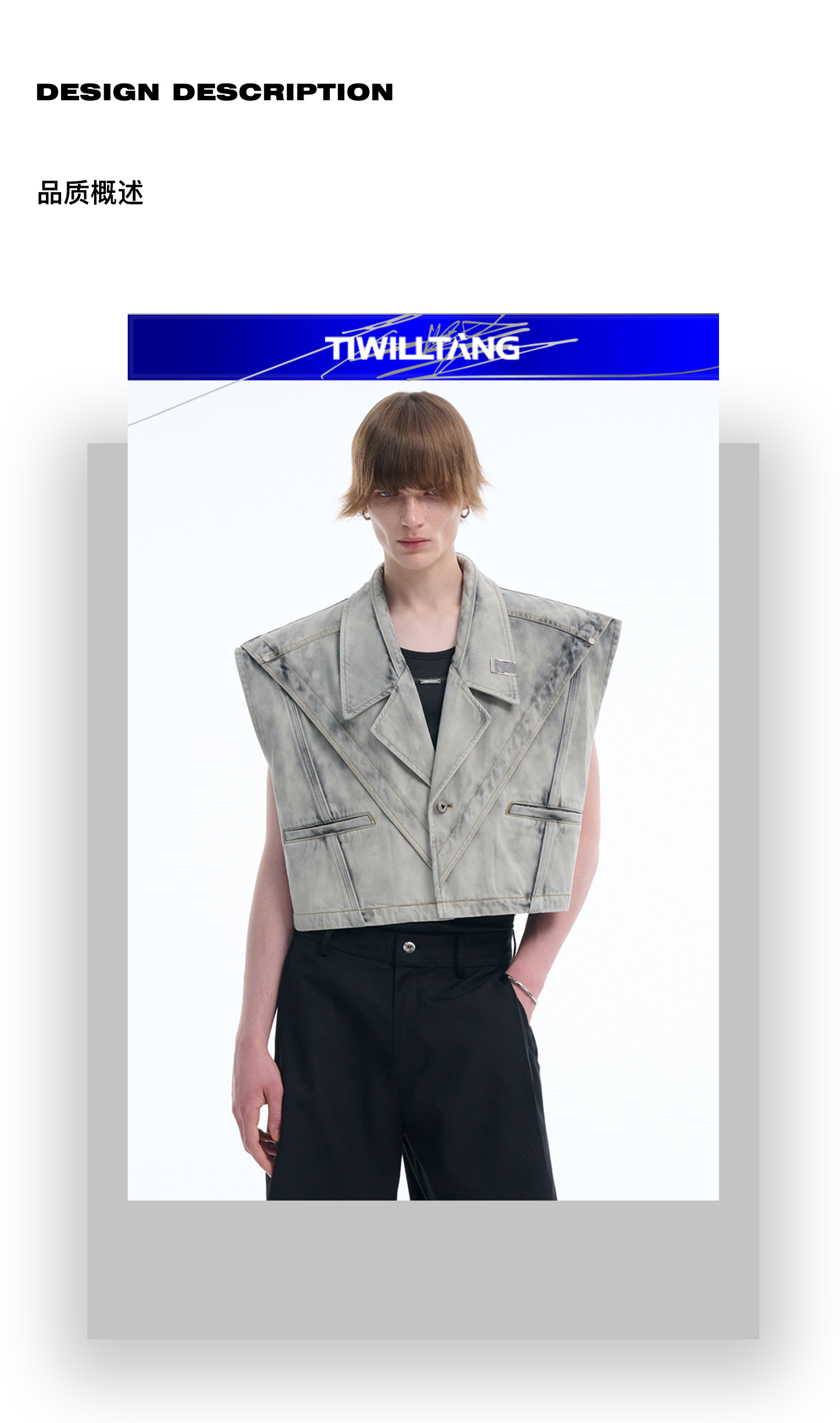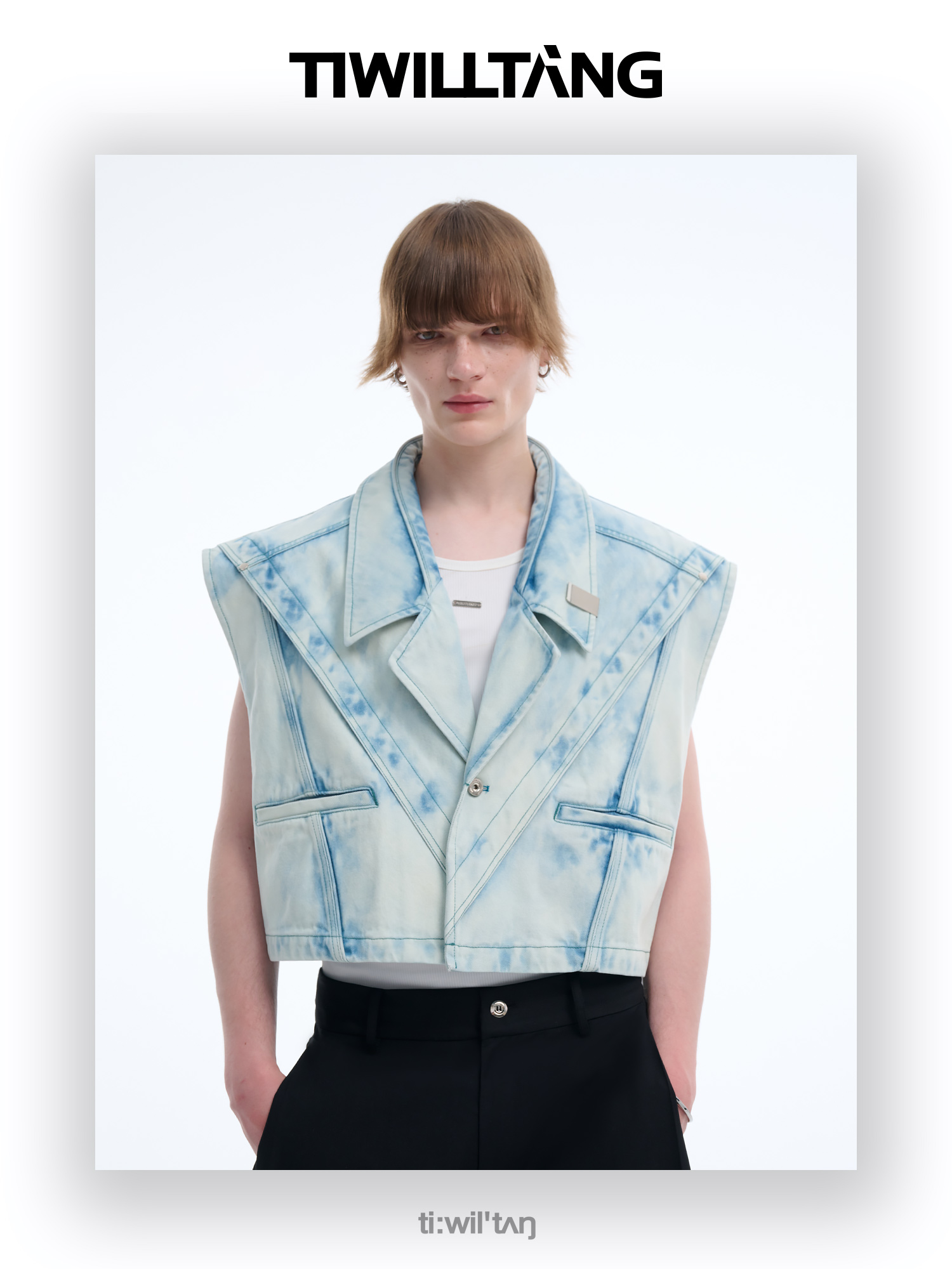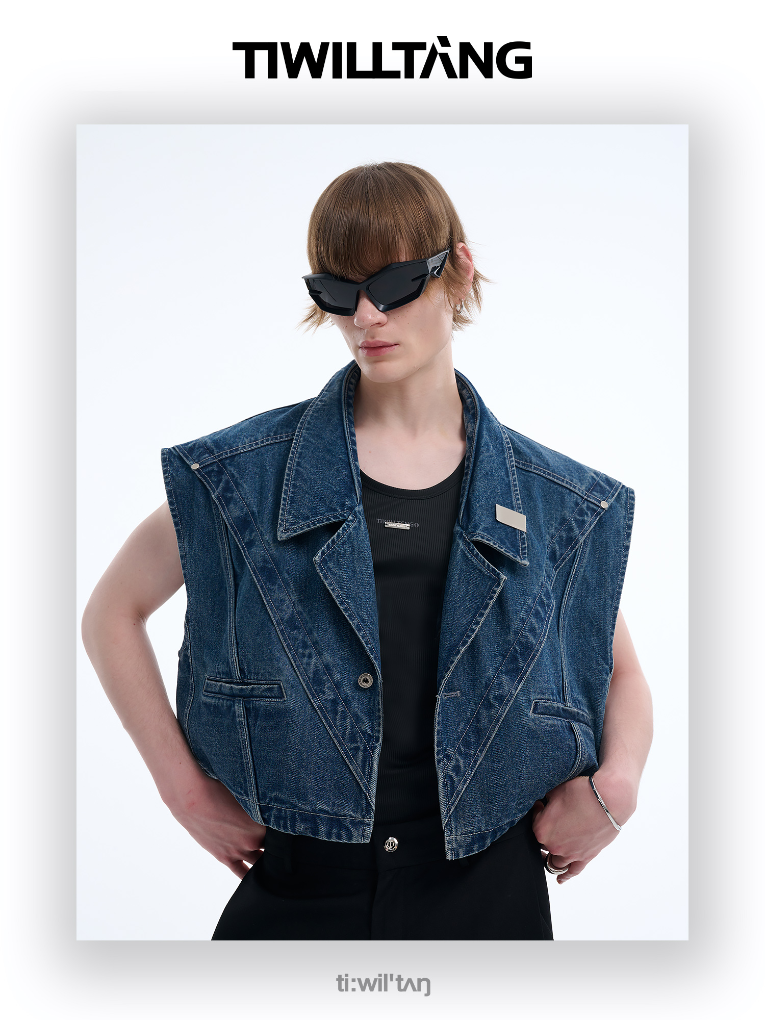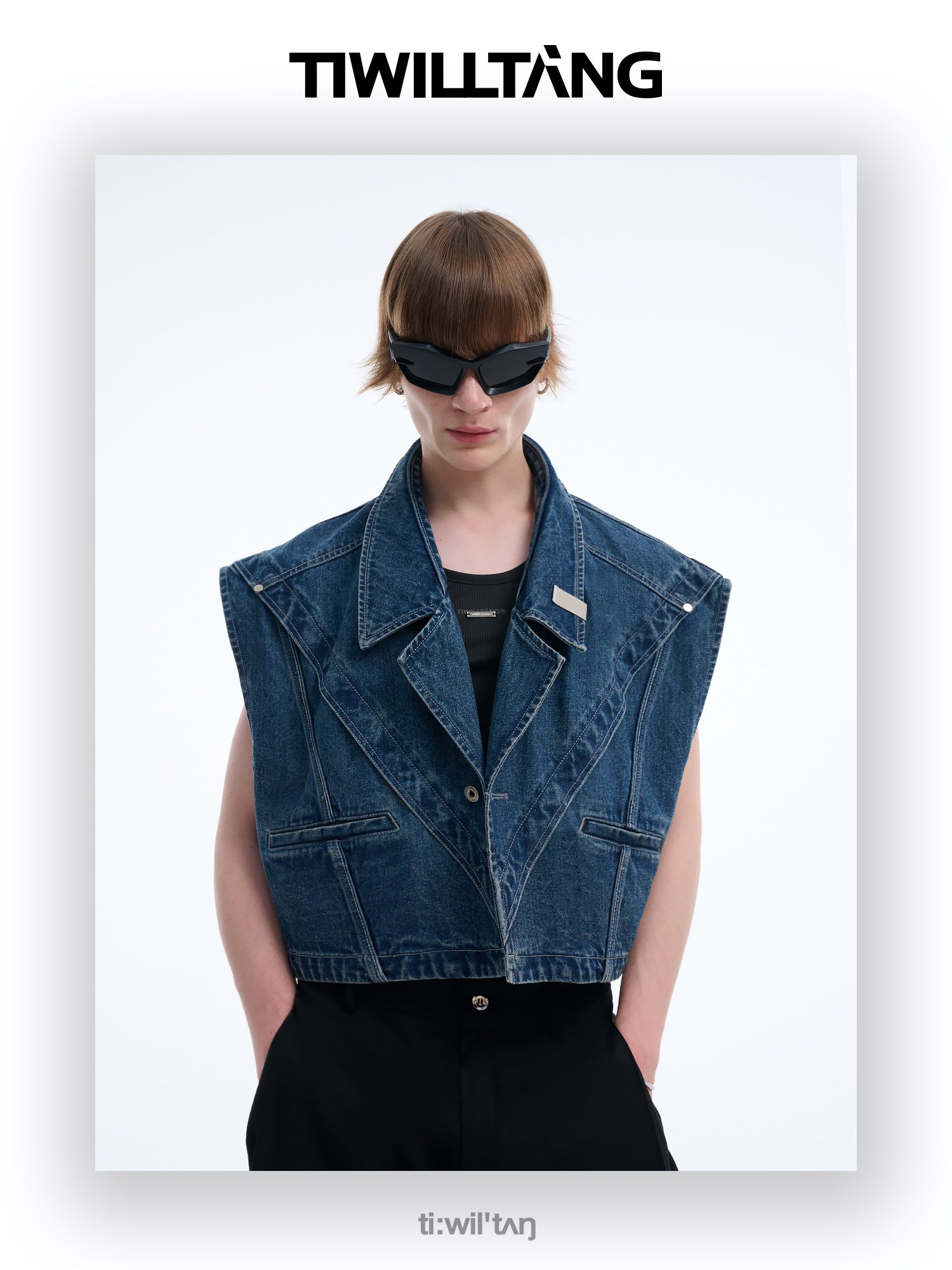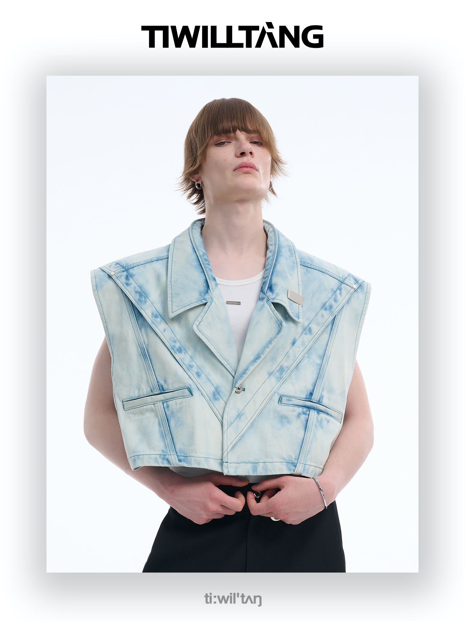 TIWILLTANG 启世录“锛淳”翻领水洗复古牛仔马甲上衣短款宽松男
