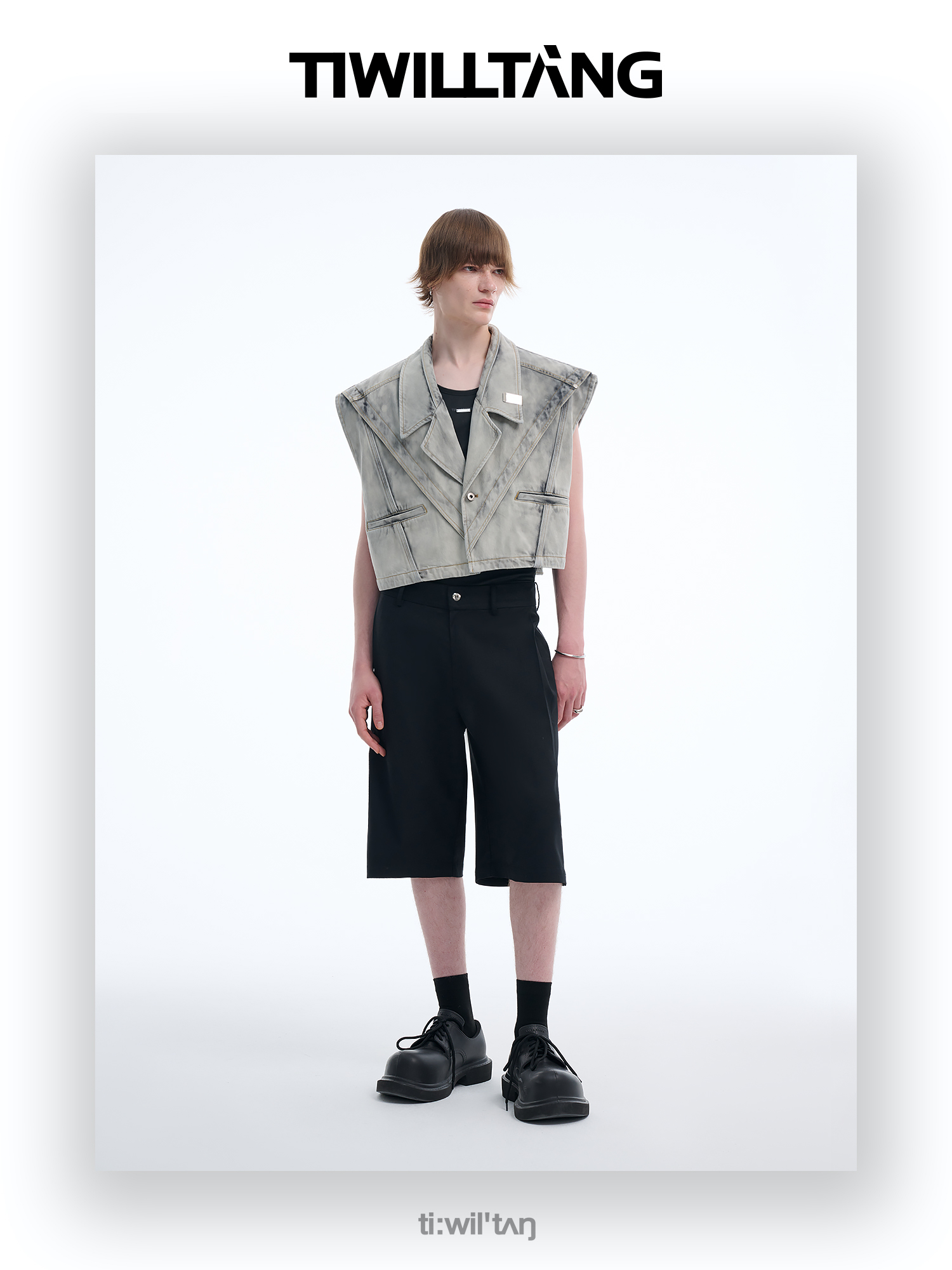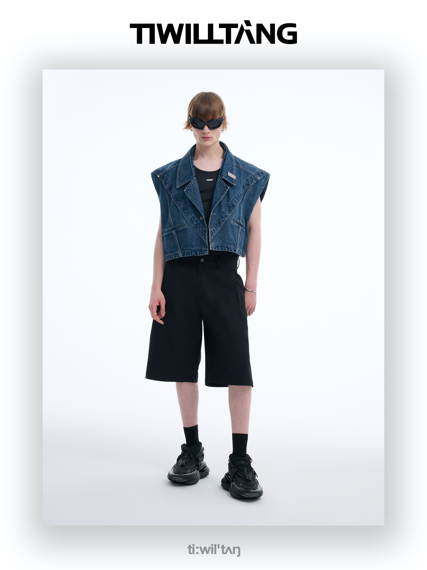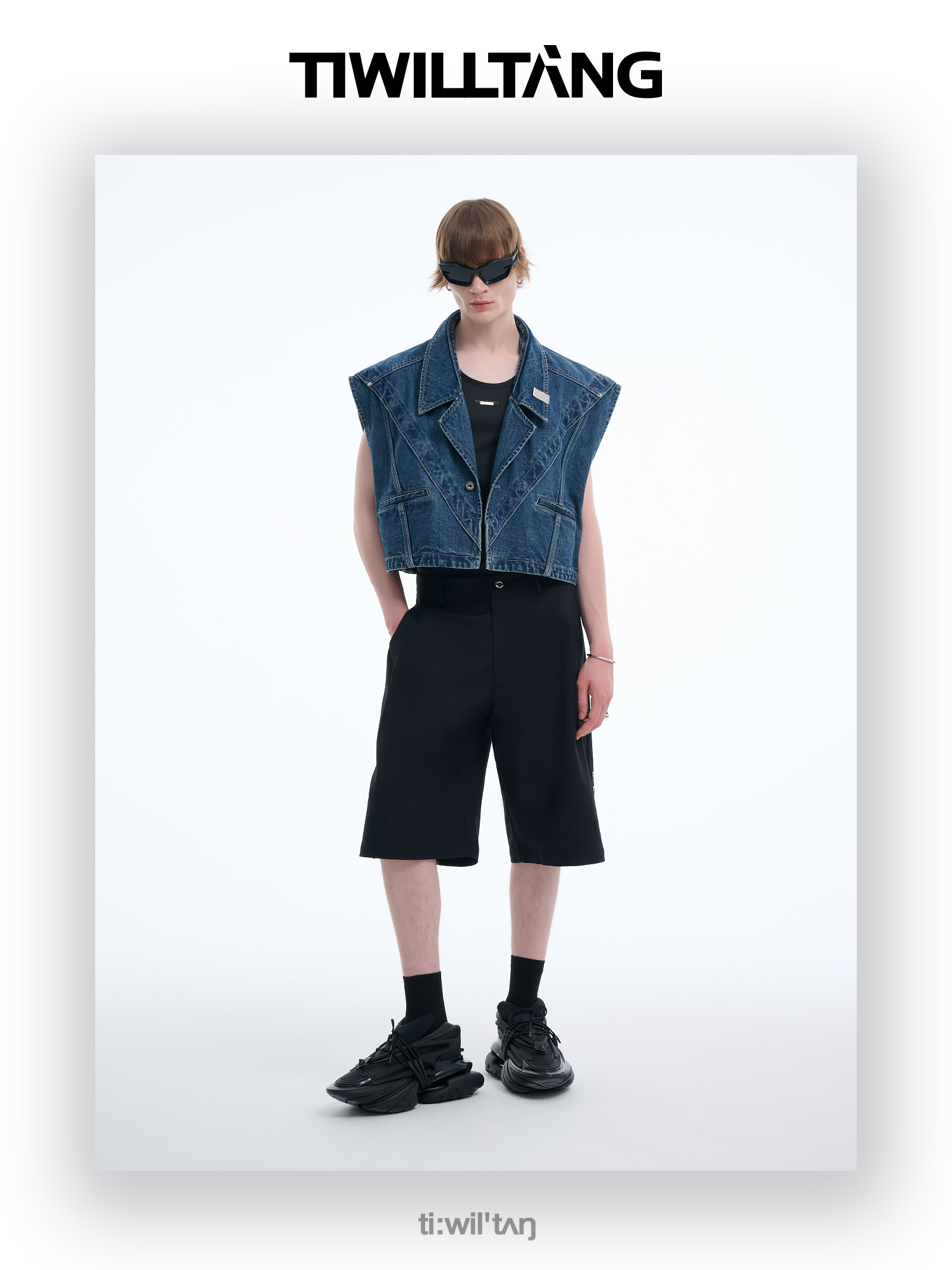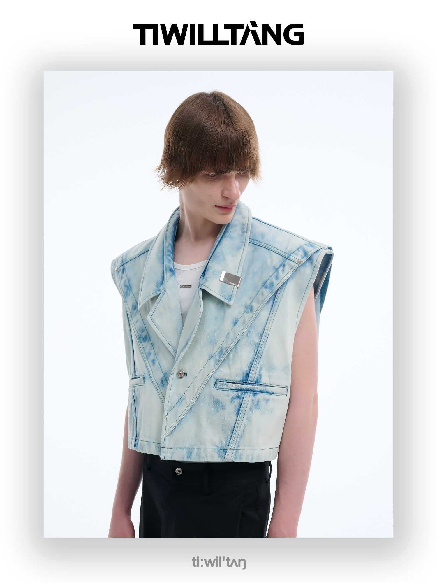 TIWILLTANG 启世录“锛淳”翻领水洗复古牛仔马甲上衣短款宽松男