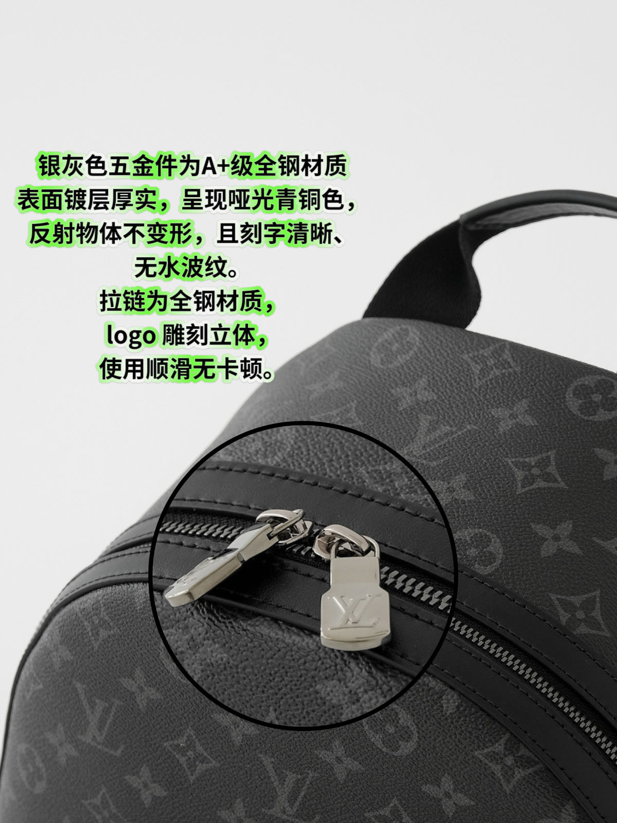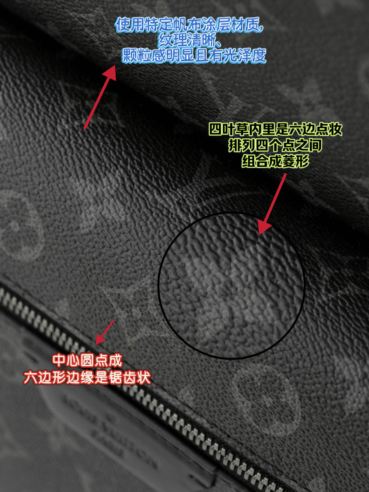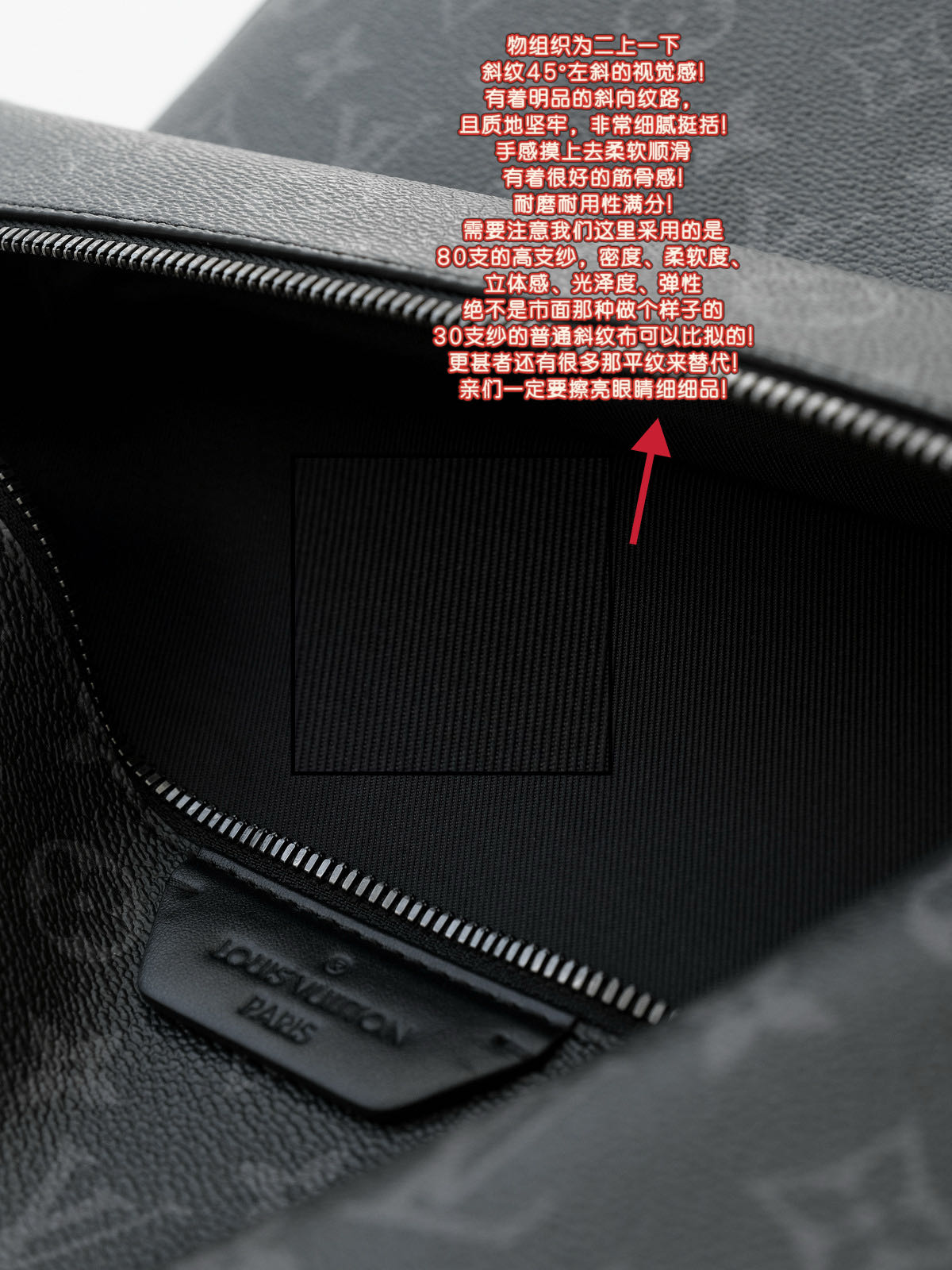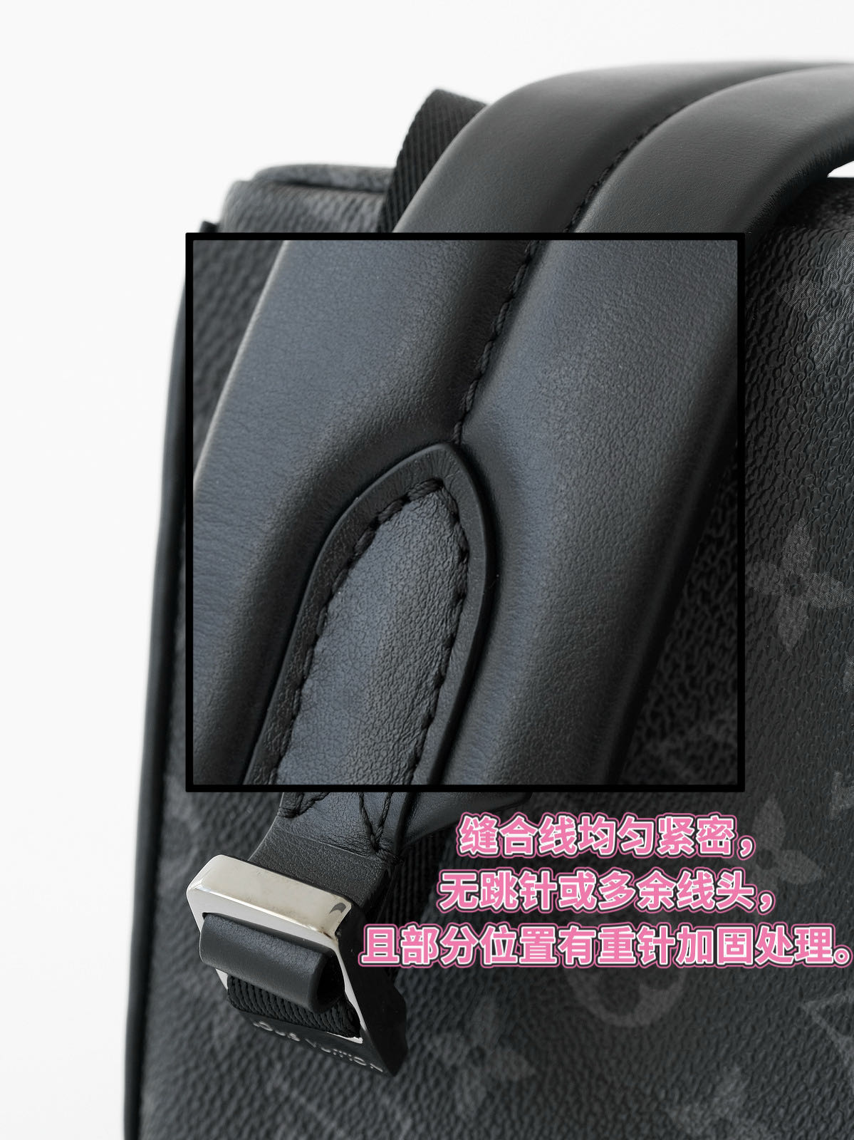 客供Monogram Eclipse 涂层帆布,黑灰同色系碰撞出来的给人最直观感觉就是酷!比表面有着细腻自然的纹理,小水泡颗粒饱满、间隙分明!颗粒之间的沟的宽度都很平均!防水防刮十分耐用,会越用越有味道!图片看不太清楚,拿到实物就一目了然,完全是那种能让你轻轻松松进出专柜的感觉..
