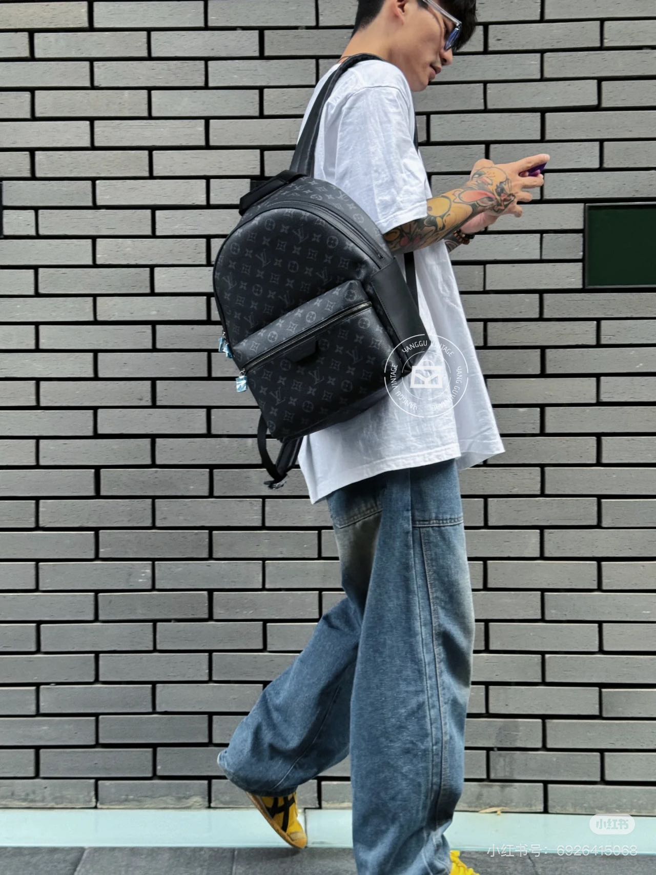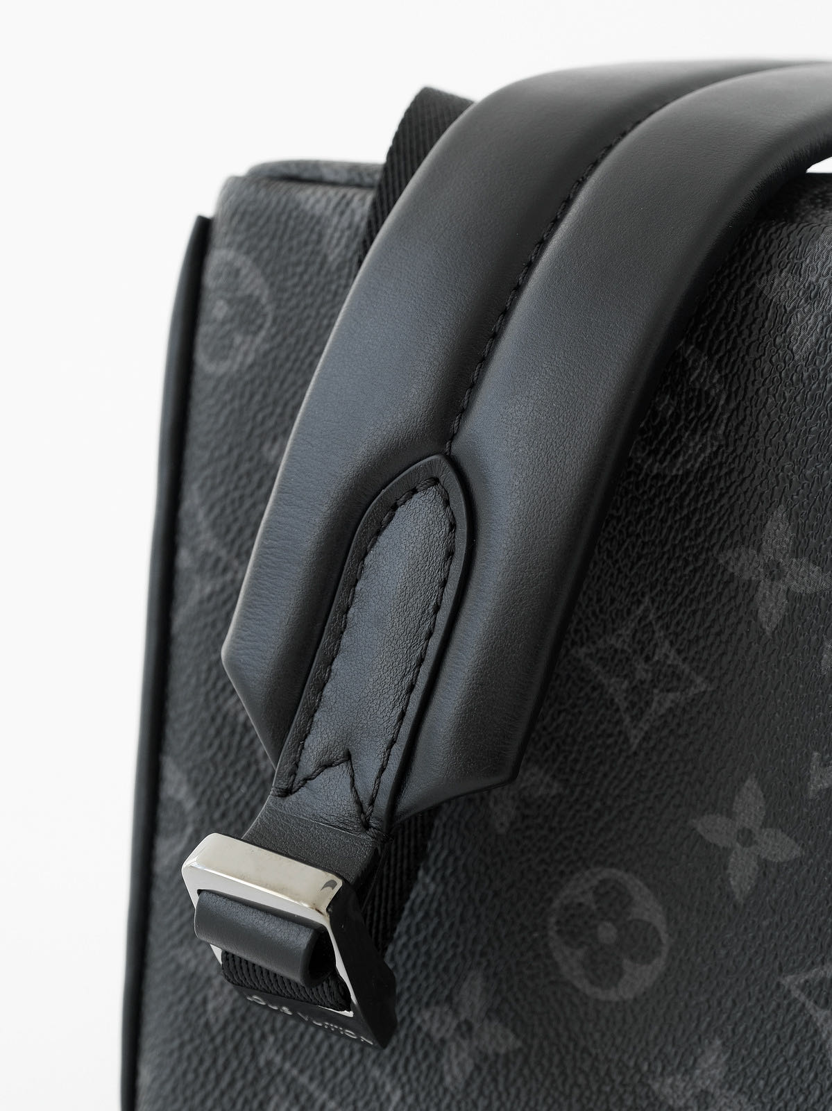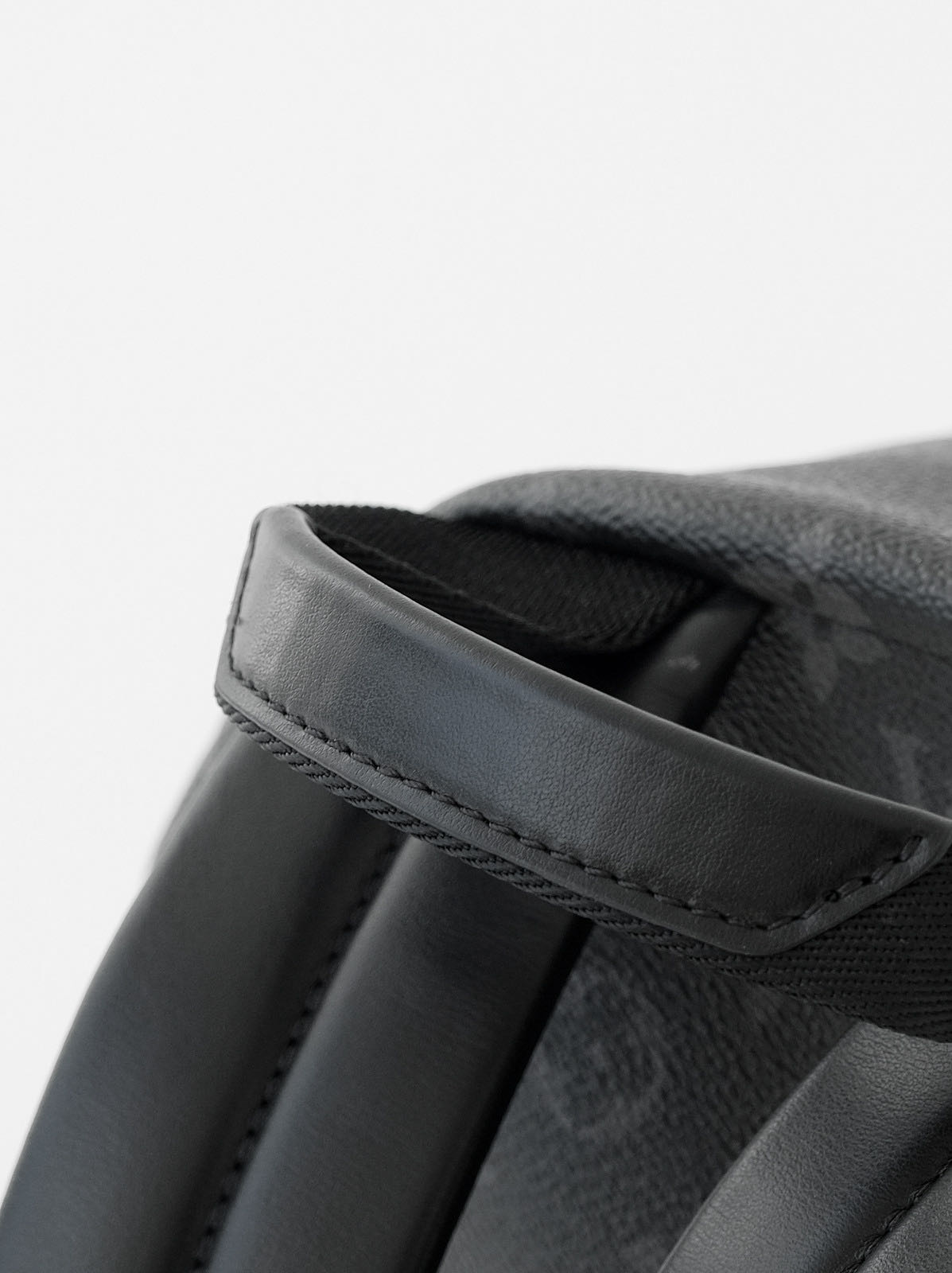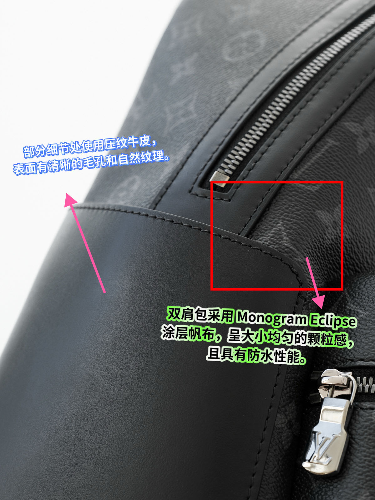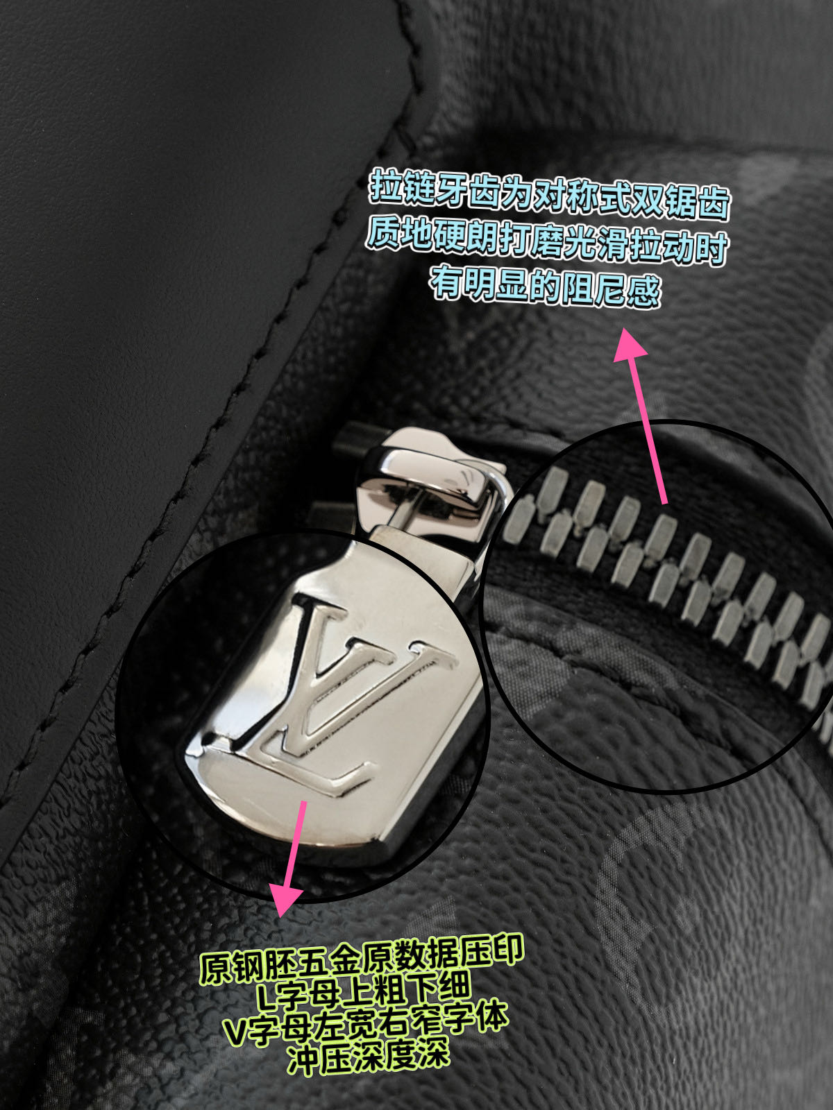 客供Monogram Eclipse 涂层帆布,黑灰同色系碰撞出来的给人最直观感觉就是酷!比表面有着细腻自然的纹理,小水泡颗粒饱满、间隙分明!颗粒之间的沟的宽度都很平均!防水防刮十分耐用,会越用越有味道!图片看不太清楚,拿到实物就一目了然,完全是那种能让你轻轻松松进出专柜的感觉..