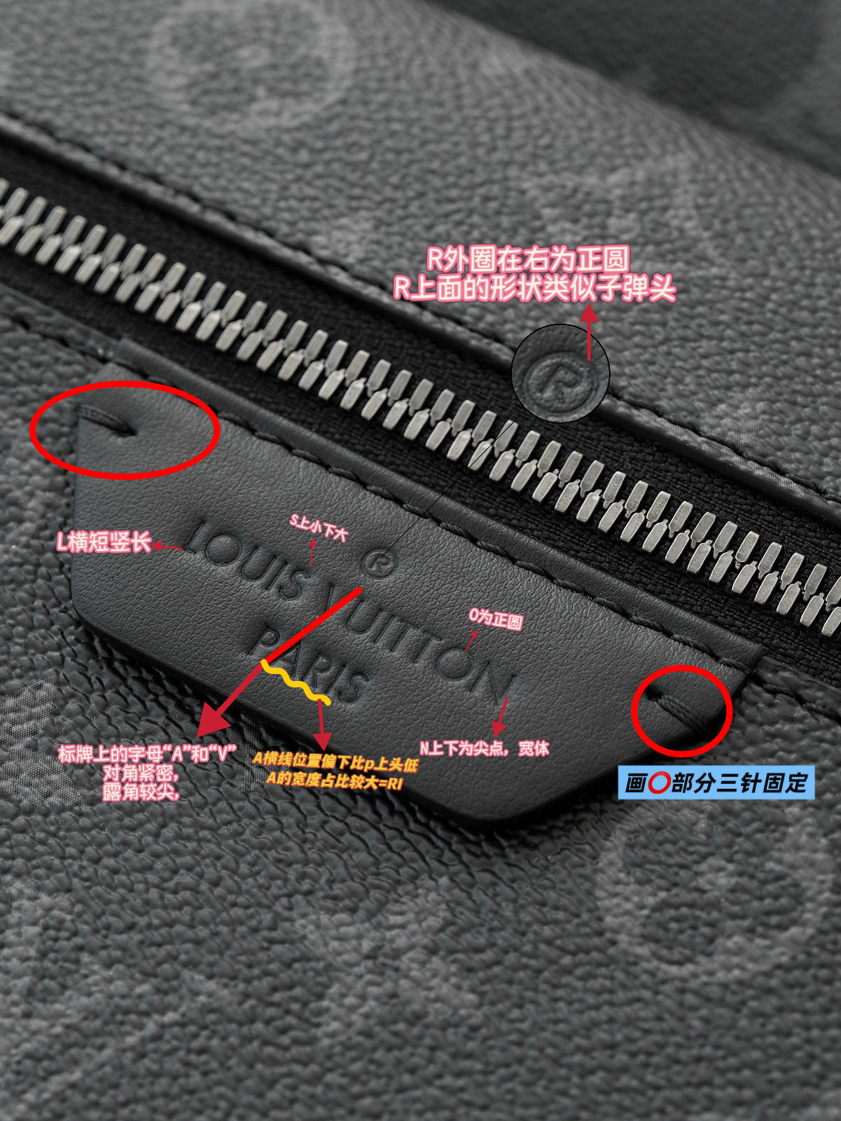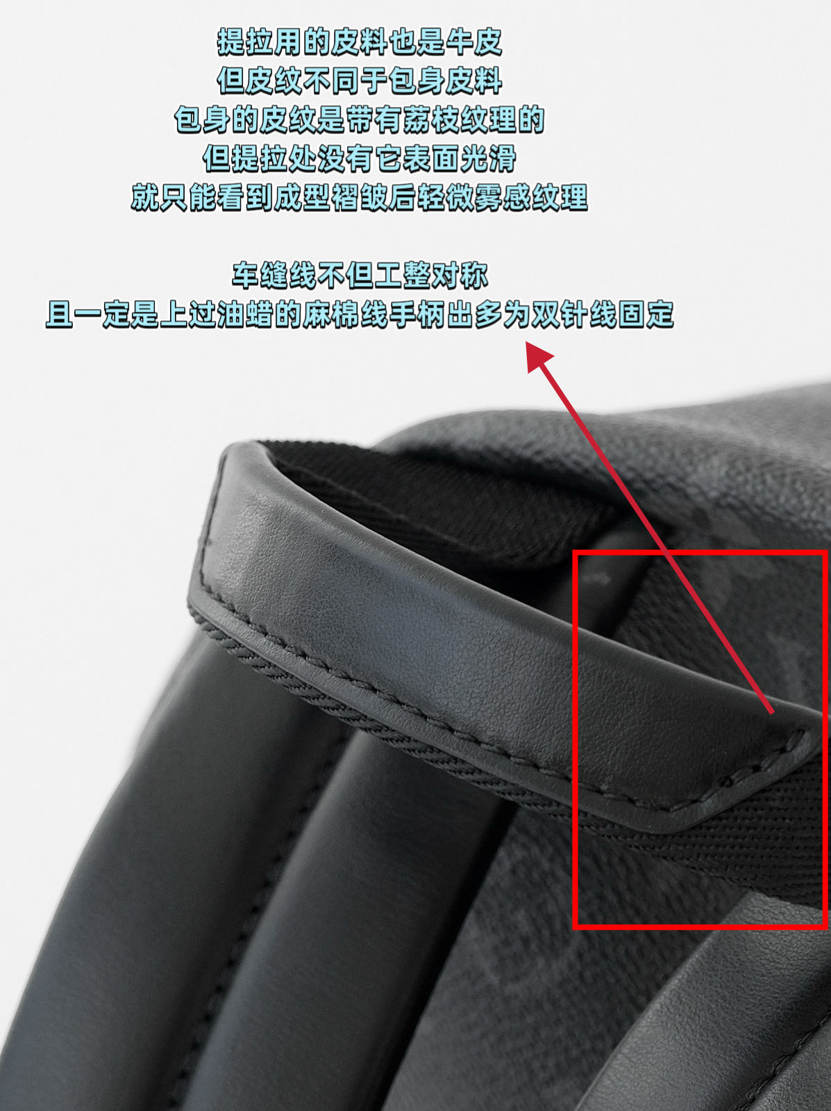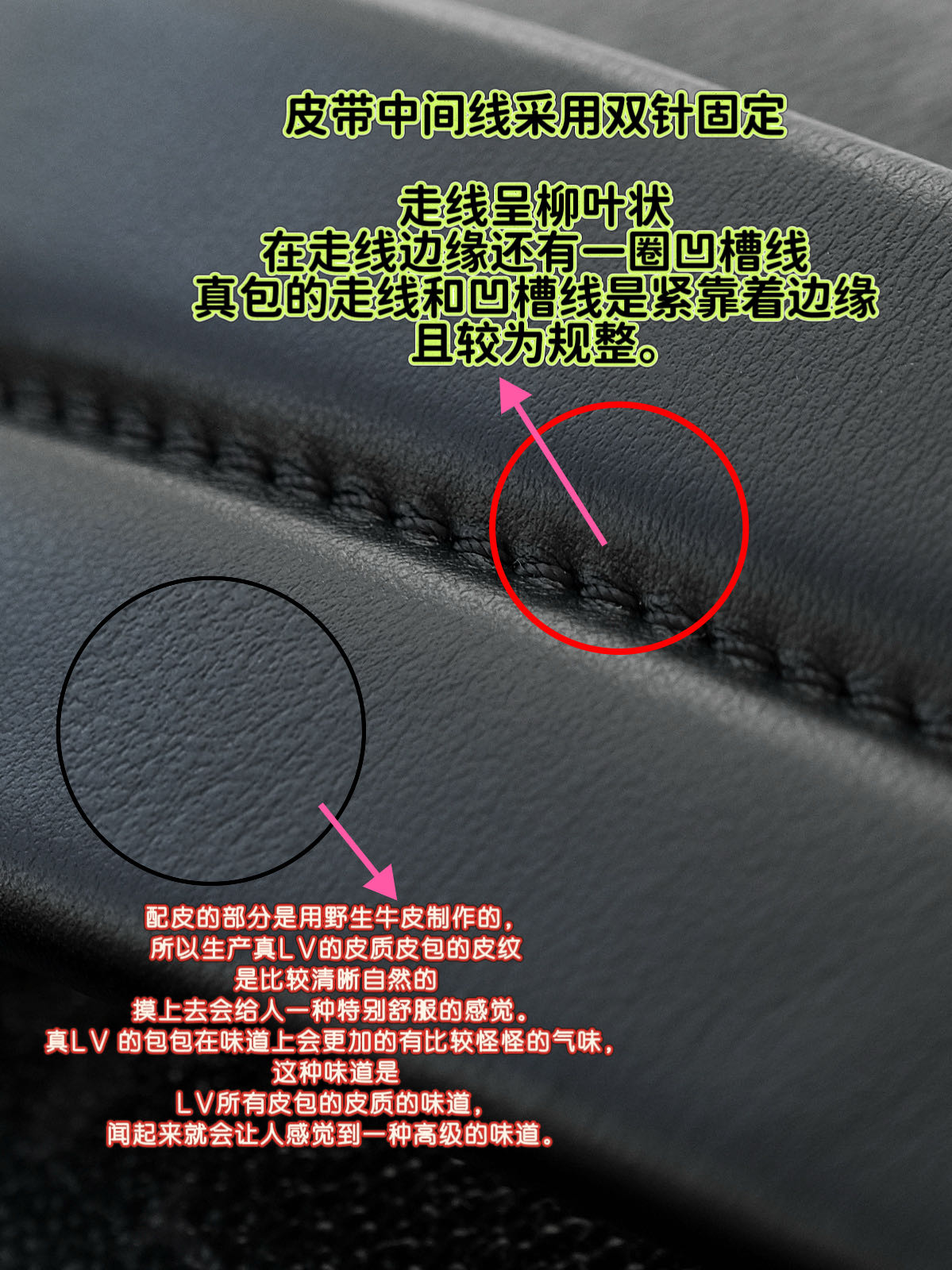 整個包身缝线工整对称,使用的是上过油蜡的麻棉线,每英寸的针脚数严格规定!LV走线呈柳叶状,在走线边缘还有一圈凹槽线,真包的走线和凹槽线是紧靠着边缘且较为规整。