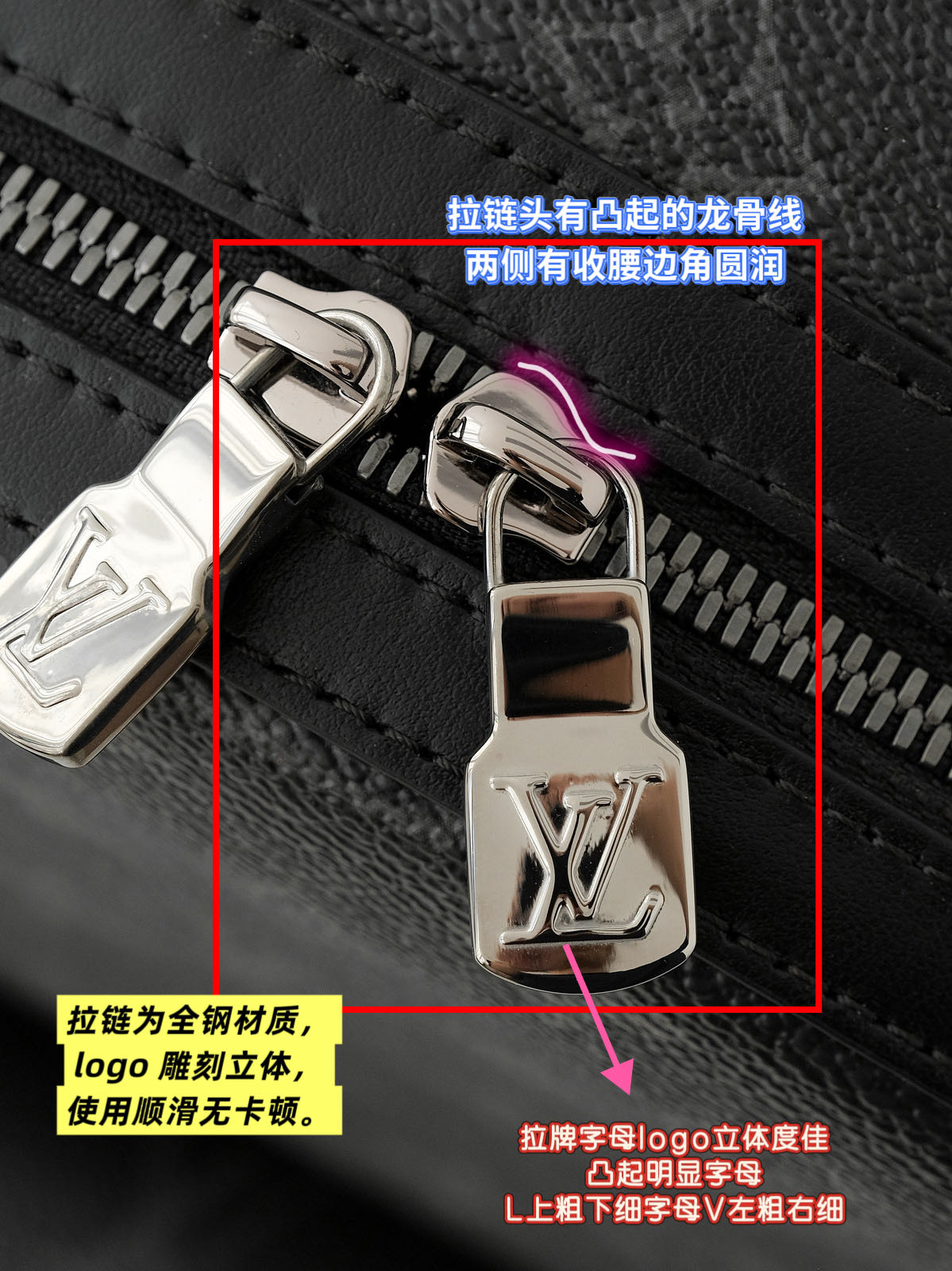 五金采用铜镶金材质,五金刚性很高所以刻字会很清晰,但在该铆钉上字体会有所变化。过多次提炼锻造的弹性和光泽度极高,表面光滑平整,有着完美的镜面效果!纯钢材质的胚体硬度非常之高,在使用过程中不易刮坏,但是在铸造、抛光、刻印过程中的成本是要比普通的五金高好几倍的!logo字母的立体感和字母形态,每一个小细节都同步ZP的数据库,正品才有这样的高级感。