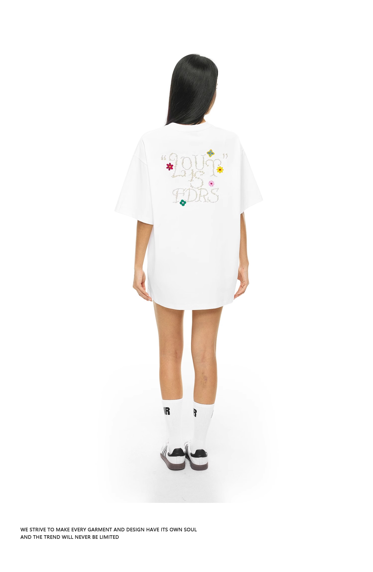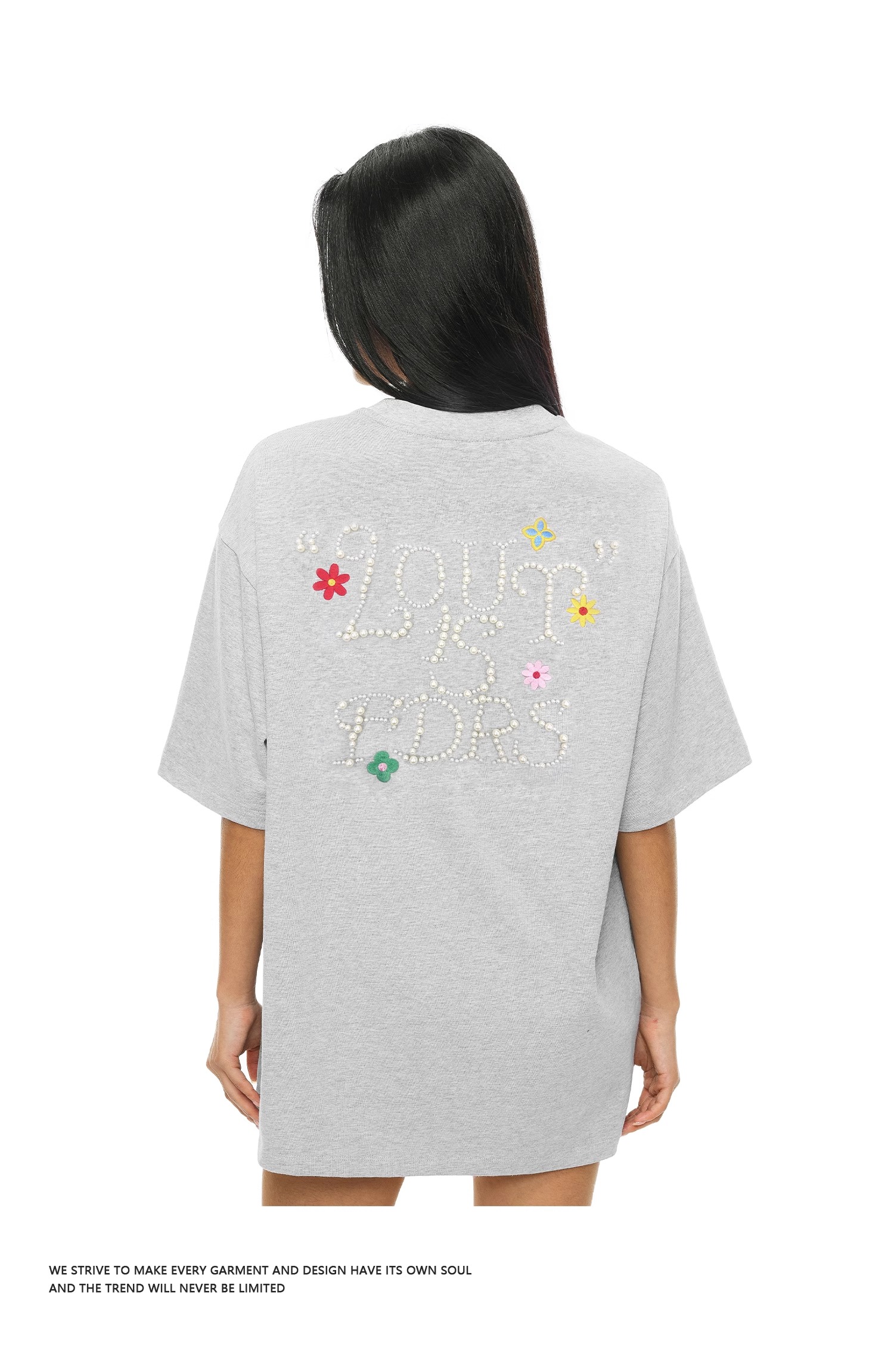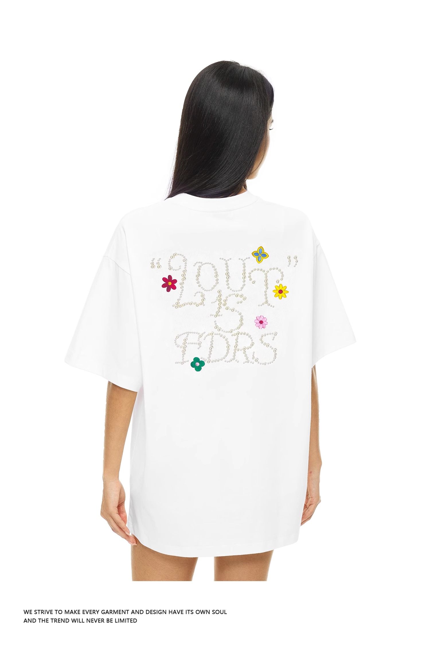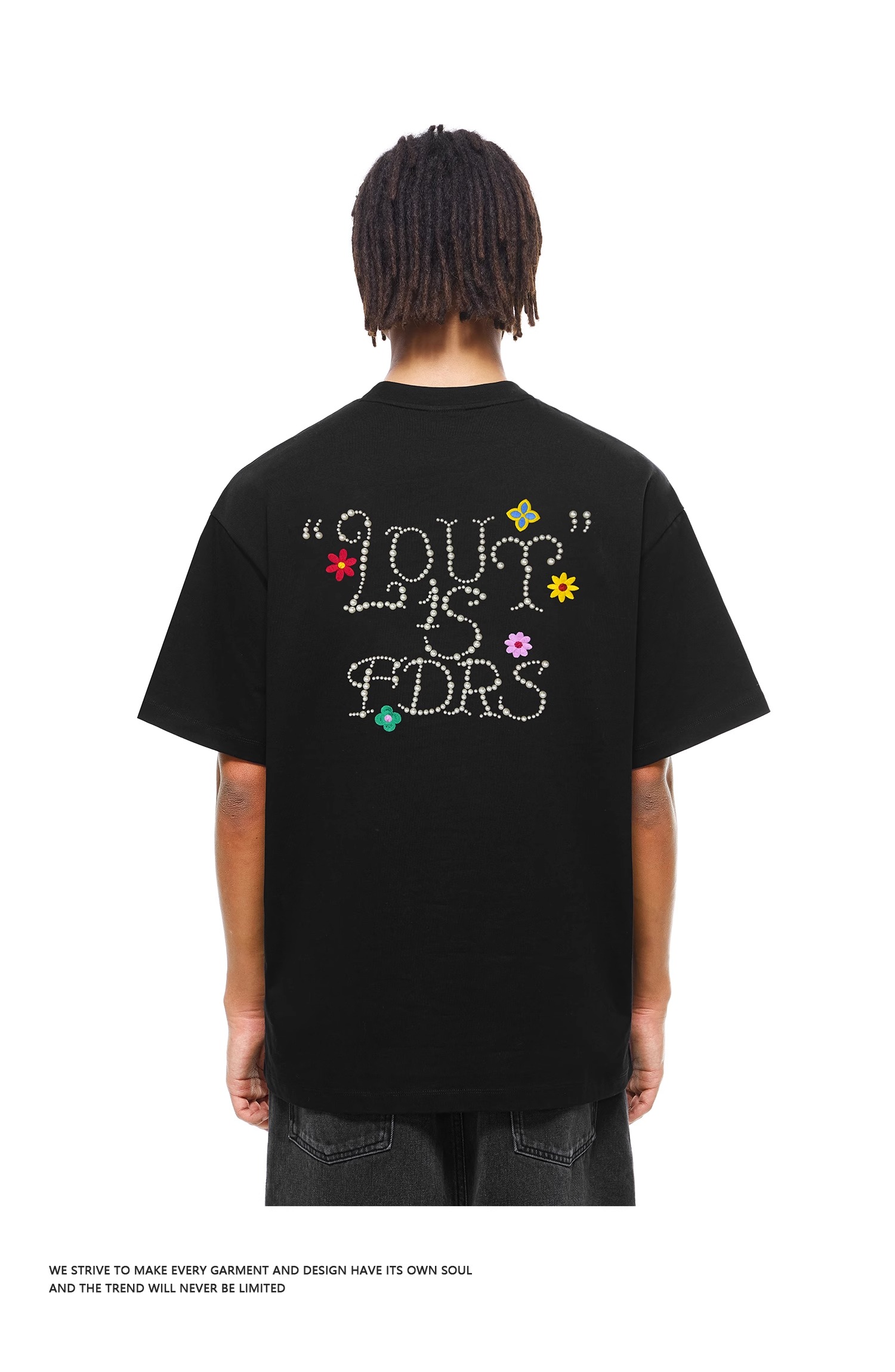 FDR官方店 珍珠绣花字母排版宽松短袖男女夏季潮牌情侣装体恤上衣