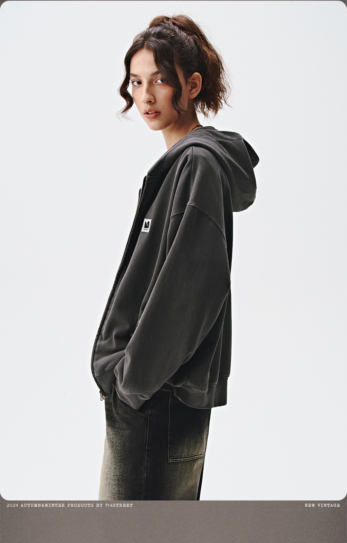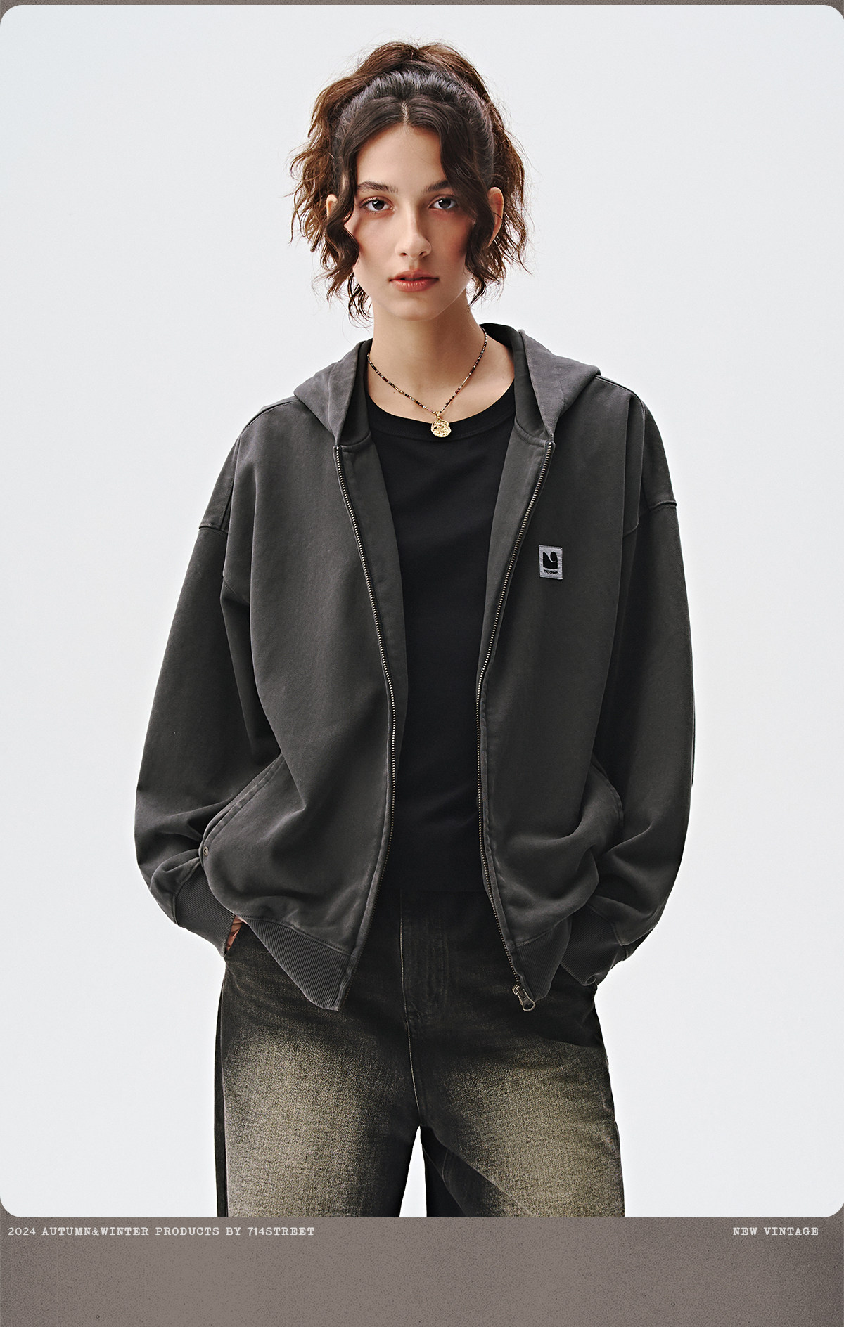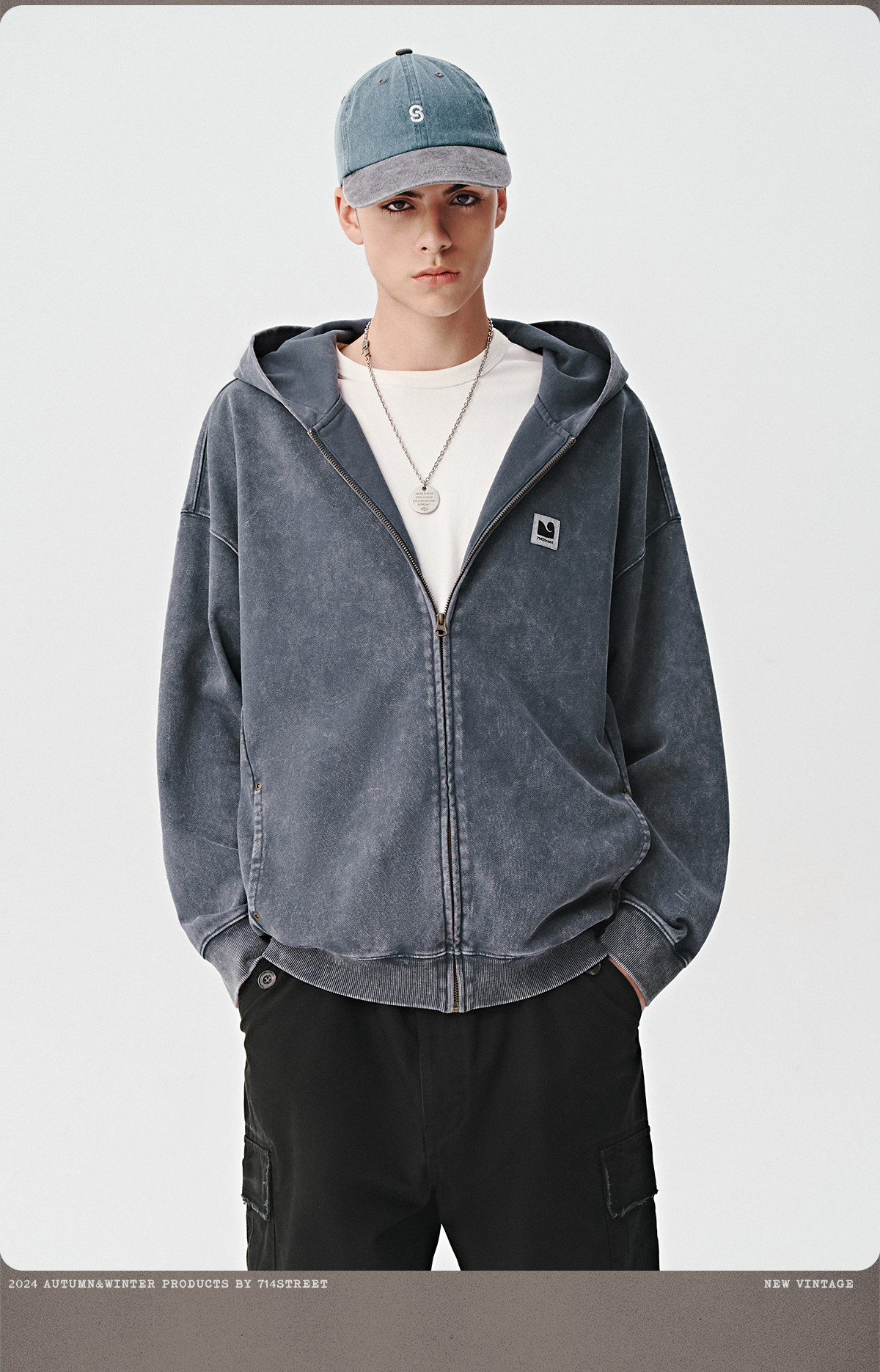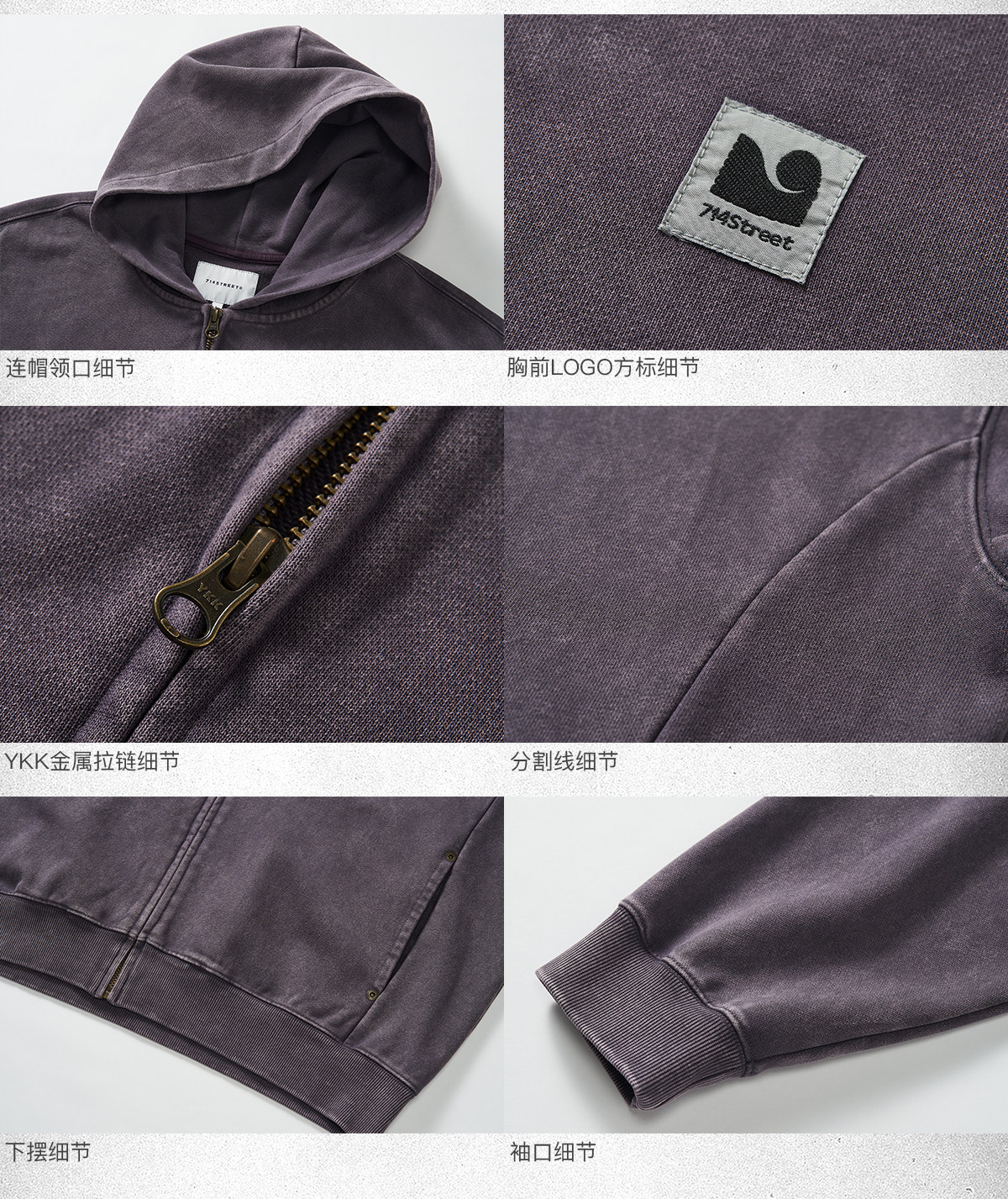 714street重磅水洗做旧连帽卫衣开衫男2024秋季新款针织外套女款
