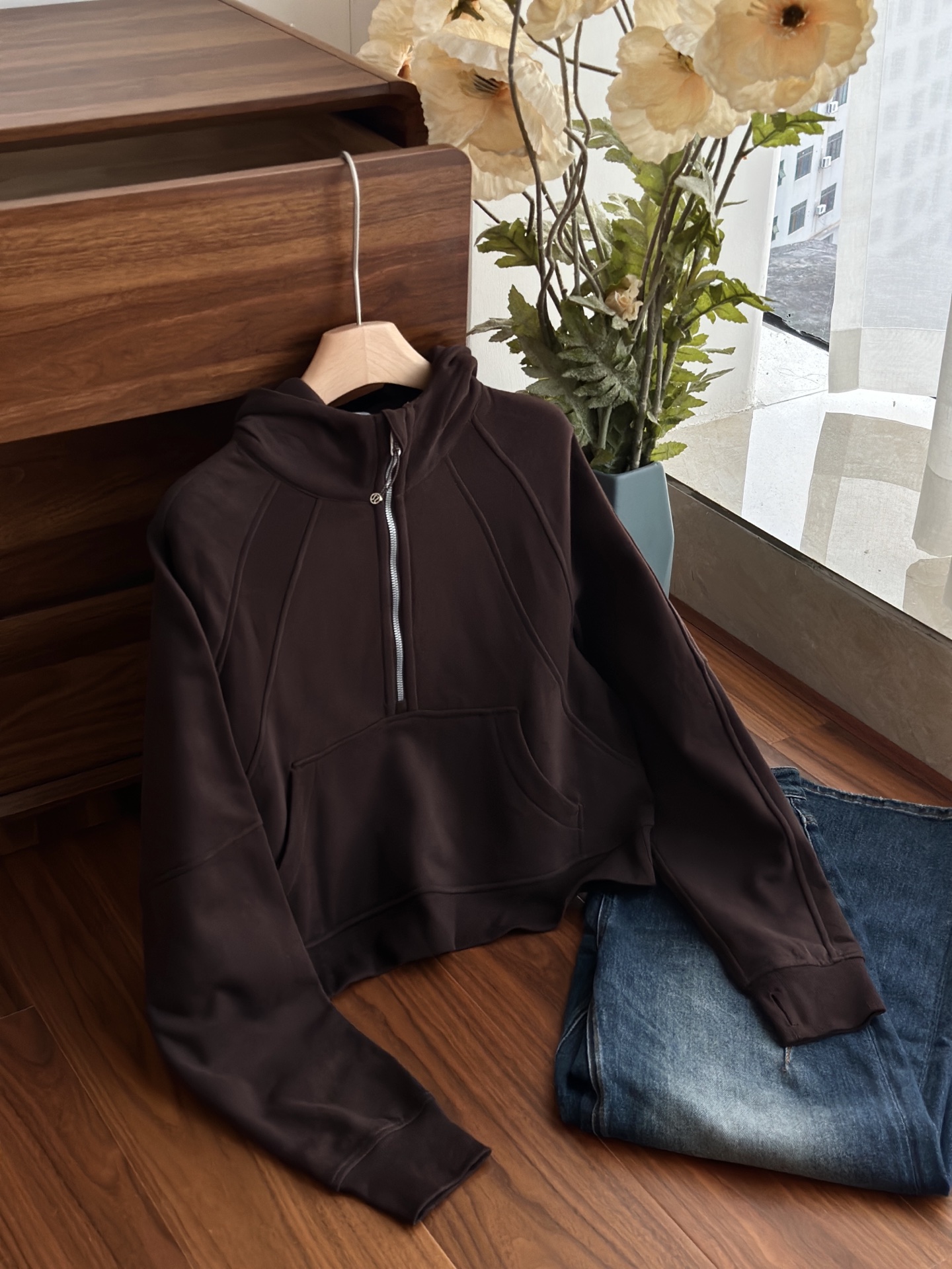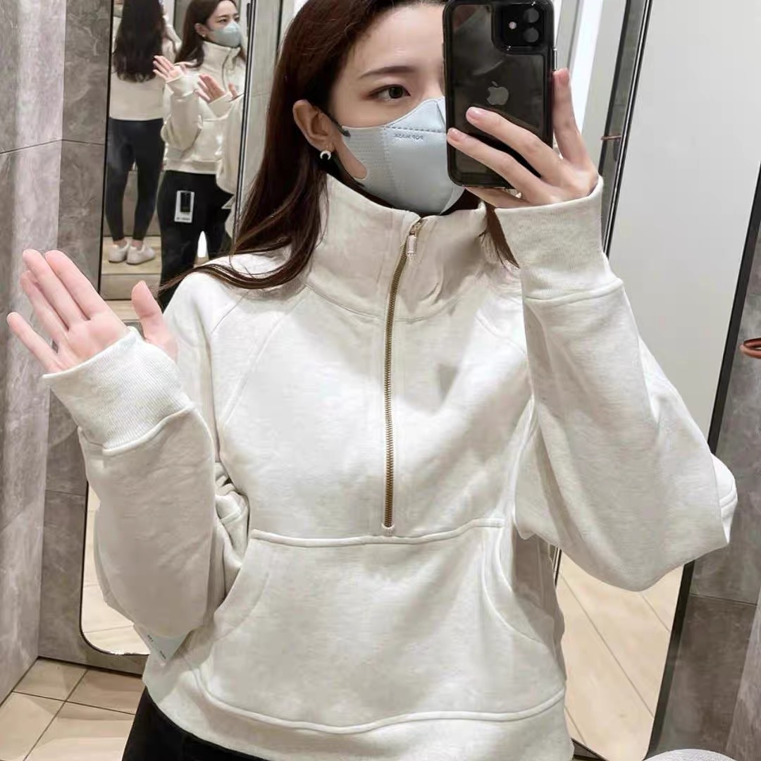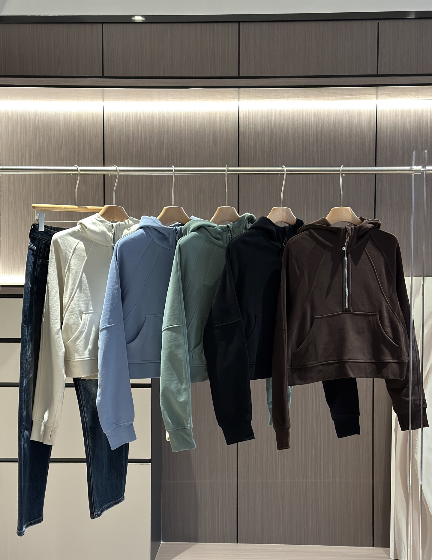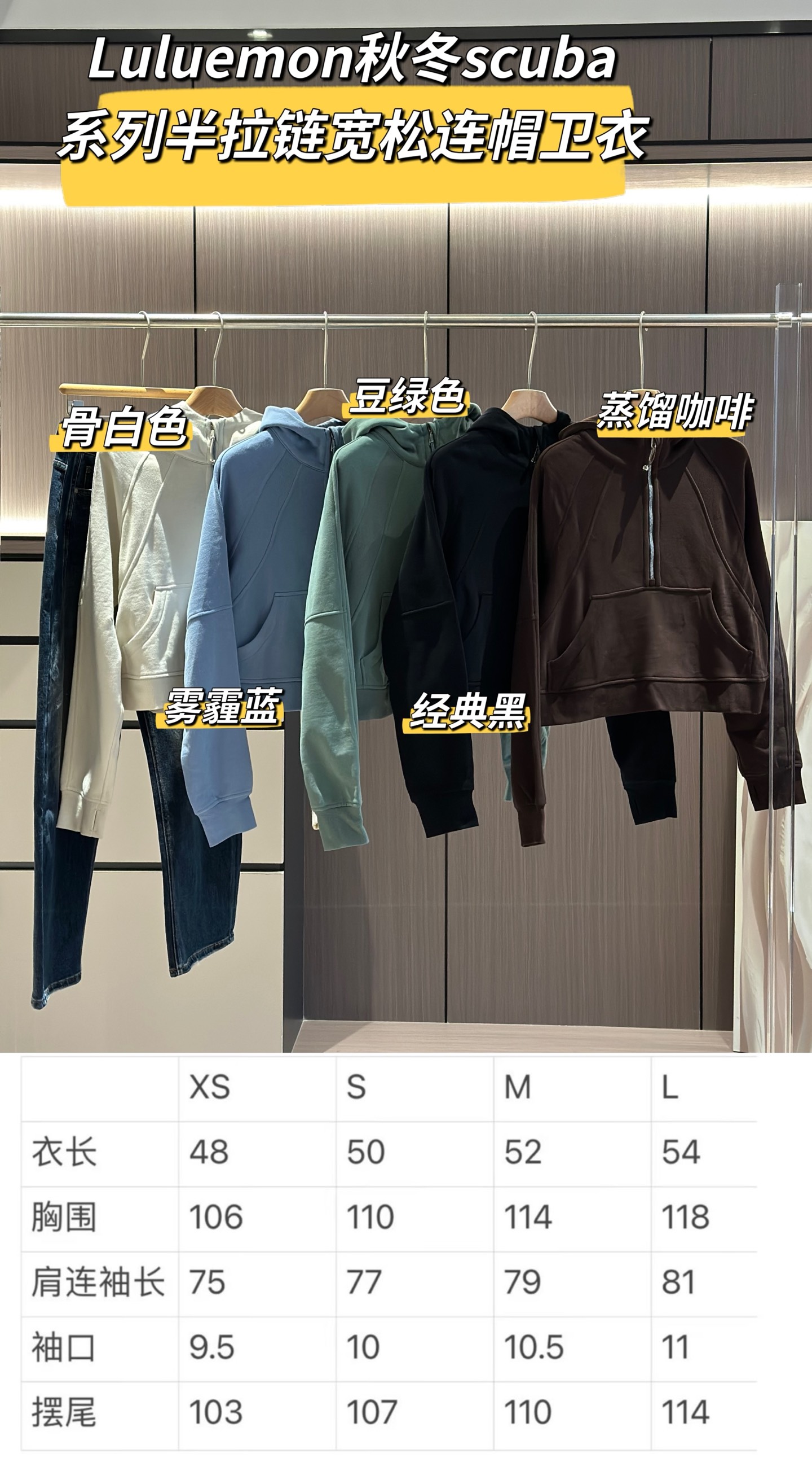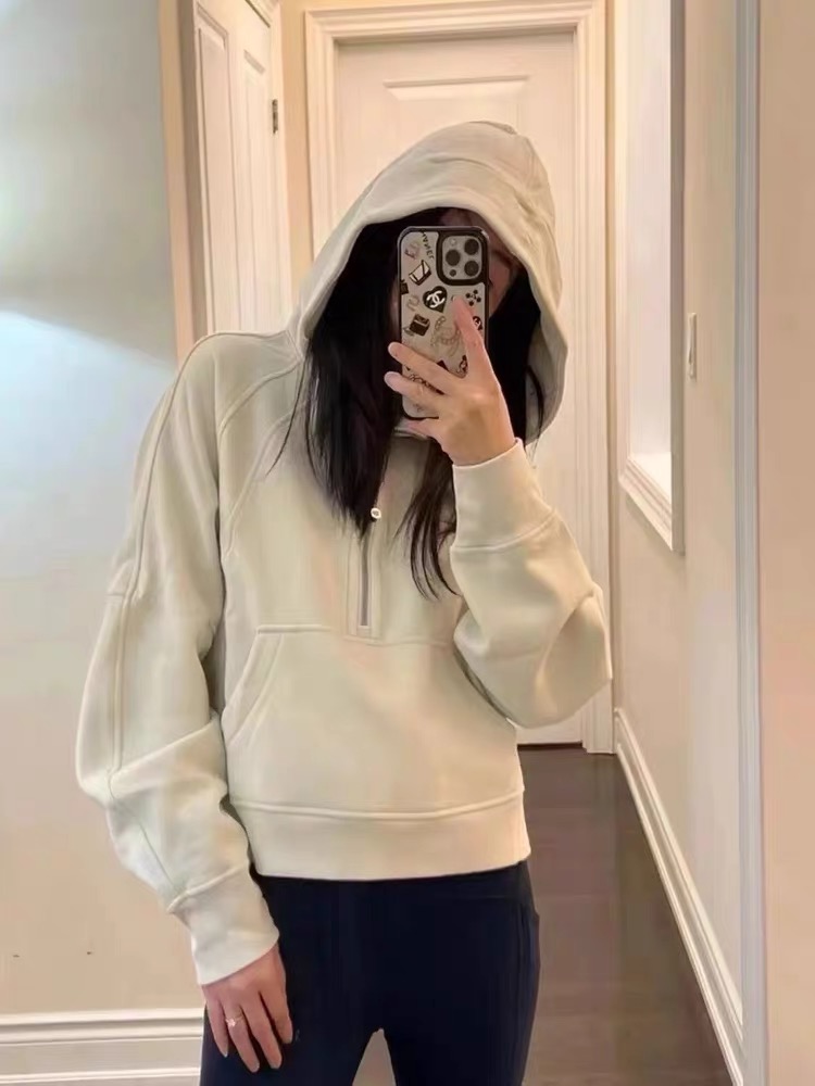 Luluemon秋冬scuba系列半拉链宽松连帽卫衣 整件卫衣多道裁片拼接的!显的头身比特别协调!两个袖管大大的!然后长短也很完美!帽子也是大大的!真的是秋冬衣橱必不可少阿! scuba的侧面和下摆都做了螺纹弹力针织,很聪明的设计点,一般女孩子的身材就是这几个地方会有区别,做成弹力针织就能完美适配每一种体型!谁穿都是又瘦又好看的 尺码:xs s m l