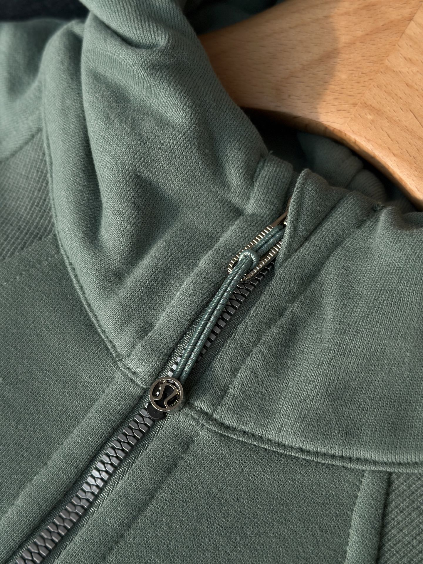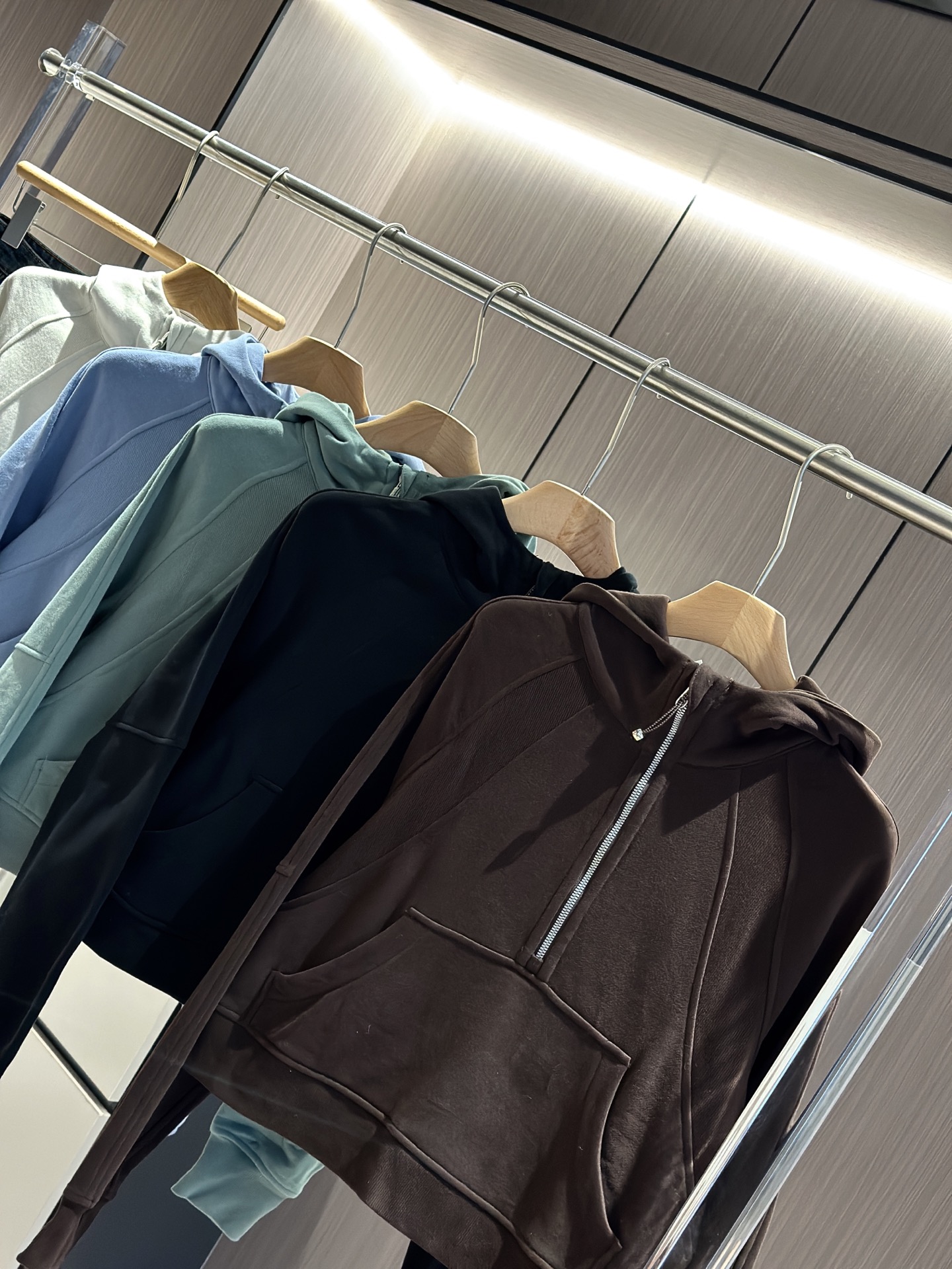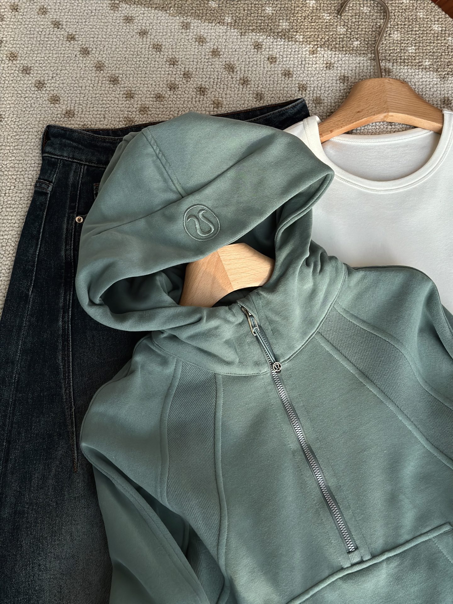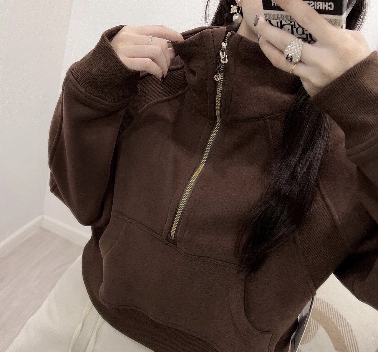 Luluemon秋冬scuba系列半拉链宽松连帽卫衣 整件卫衣多道裁片拼接的!显的头身比特别协调!两个袖管大大的!然后长短也很完美!帽子也是大大的!真的是秋冬衣橱必不可少阿! scuba的侧面和下摆都做了螺纹弹力针织,很聪明的设计点,一般女孩子的身材就是这几个地方会有区别,做成弹力针织就能完美适配每一种体型!谁穿都是又瘦又好看的 尺码:xs s m l