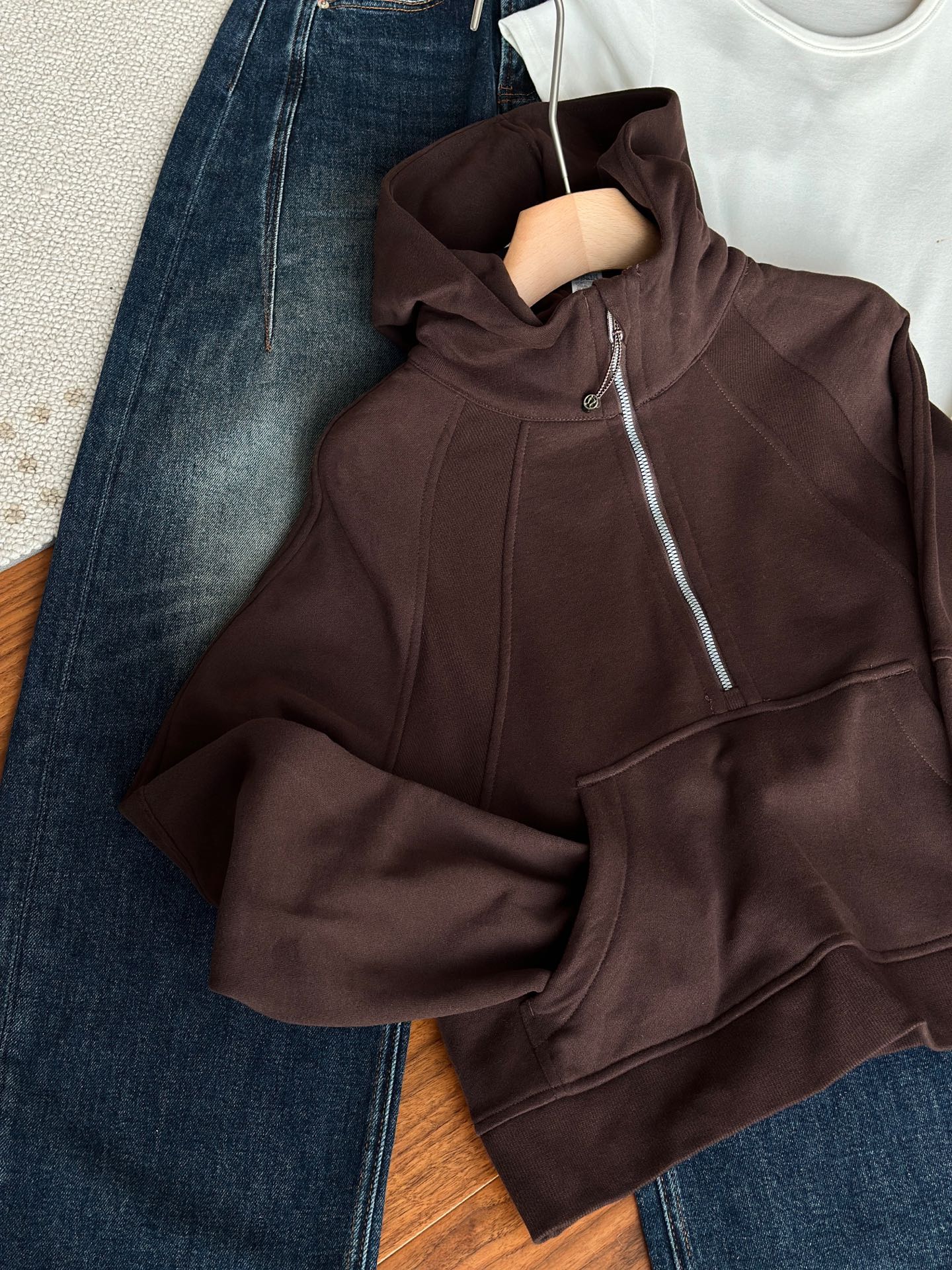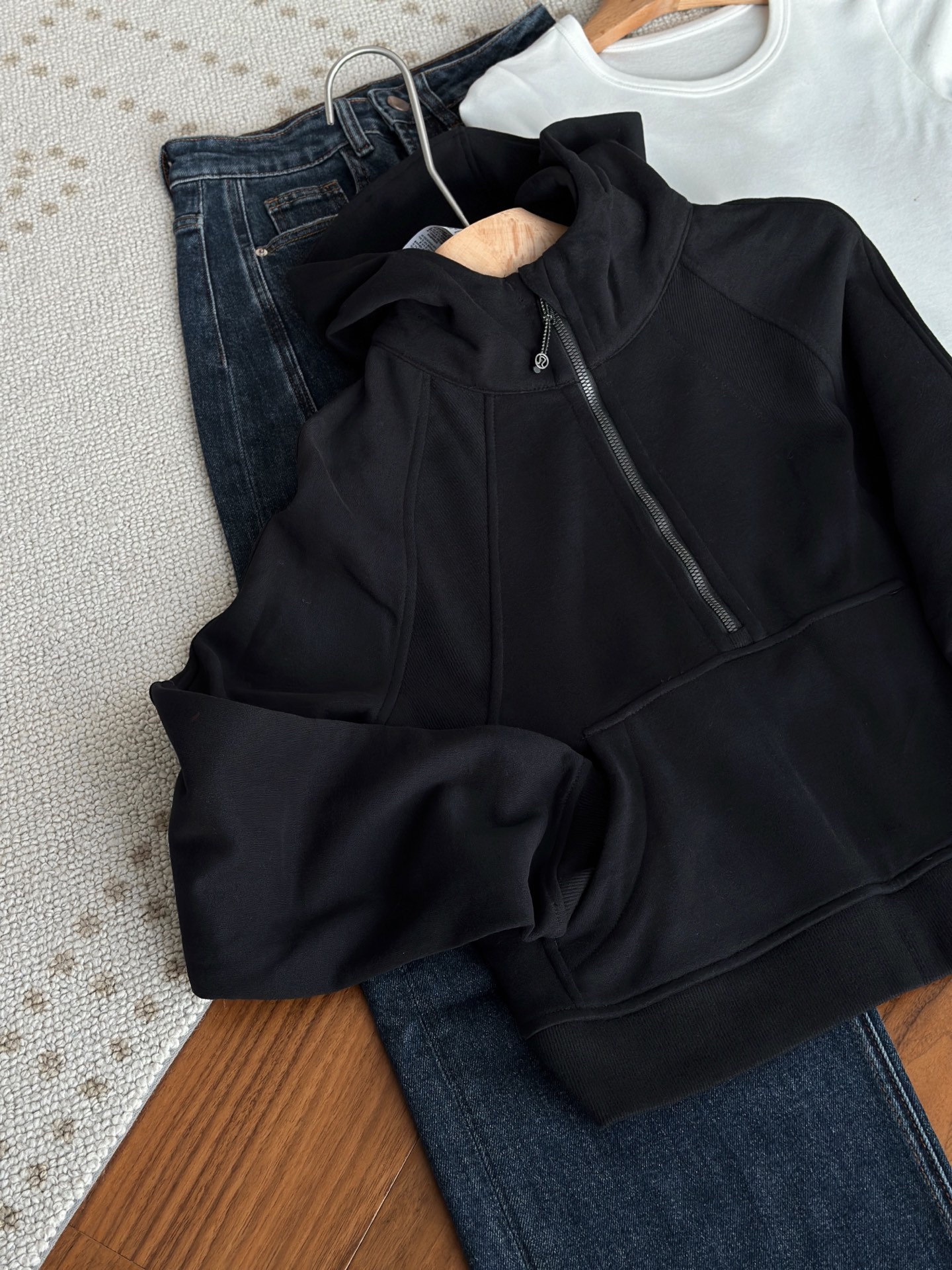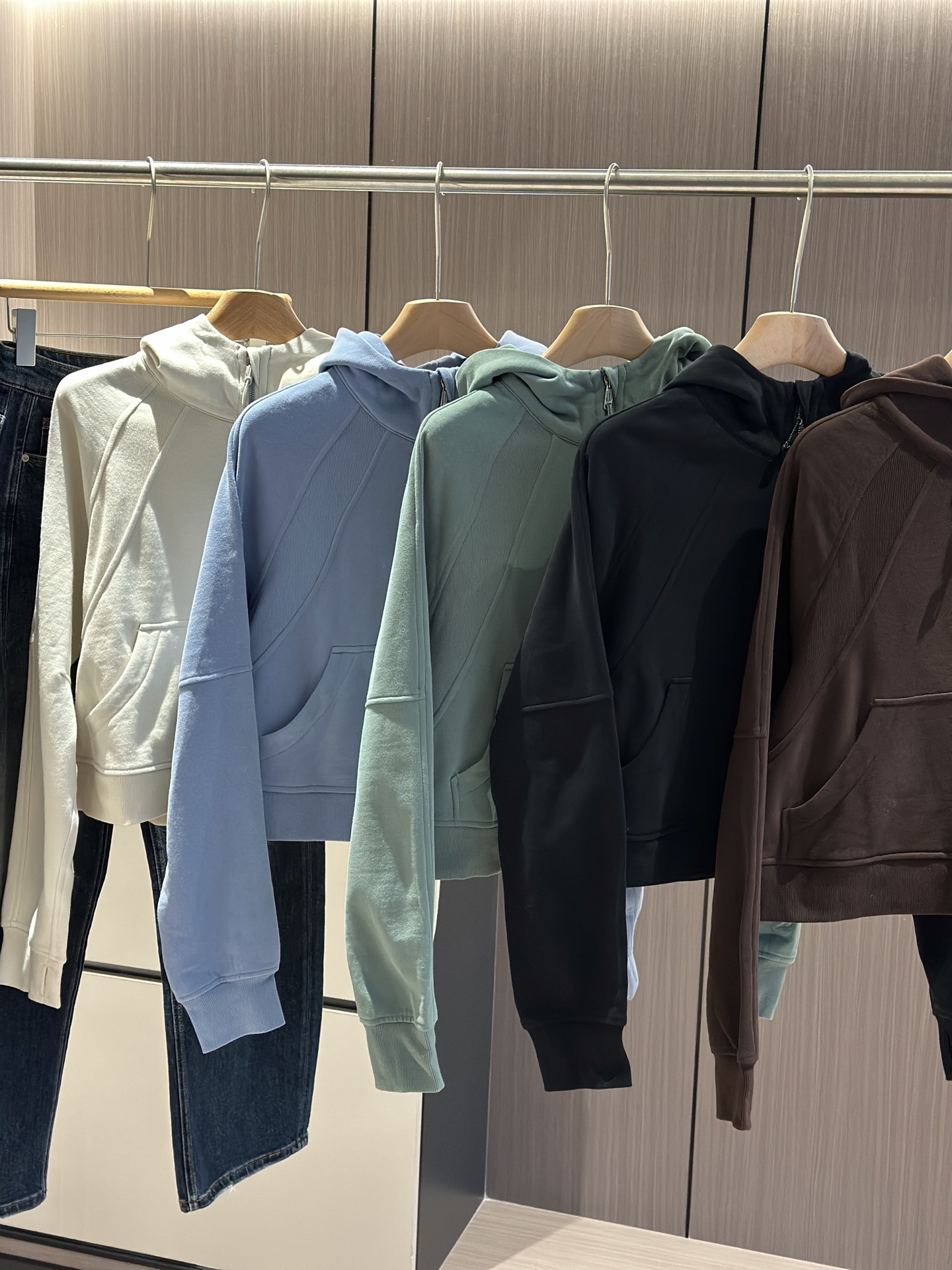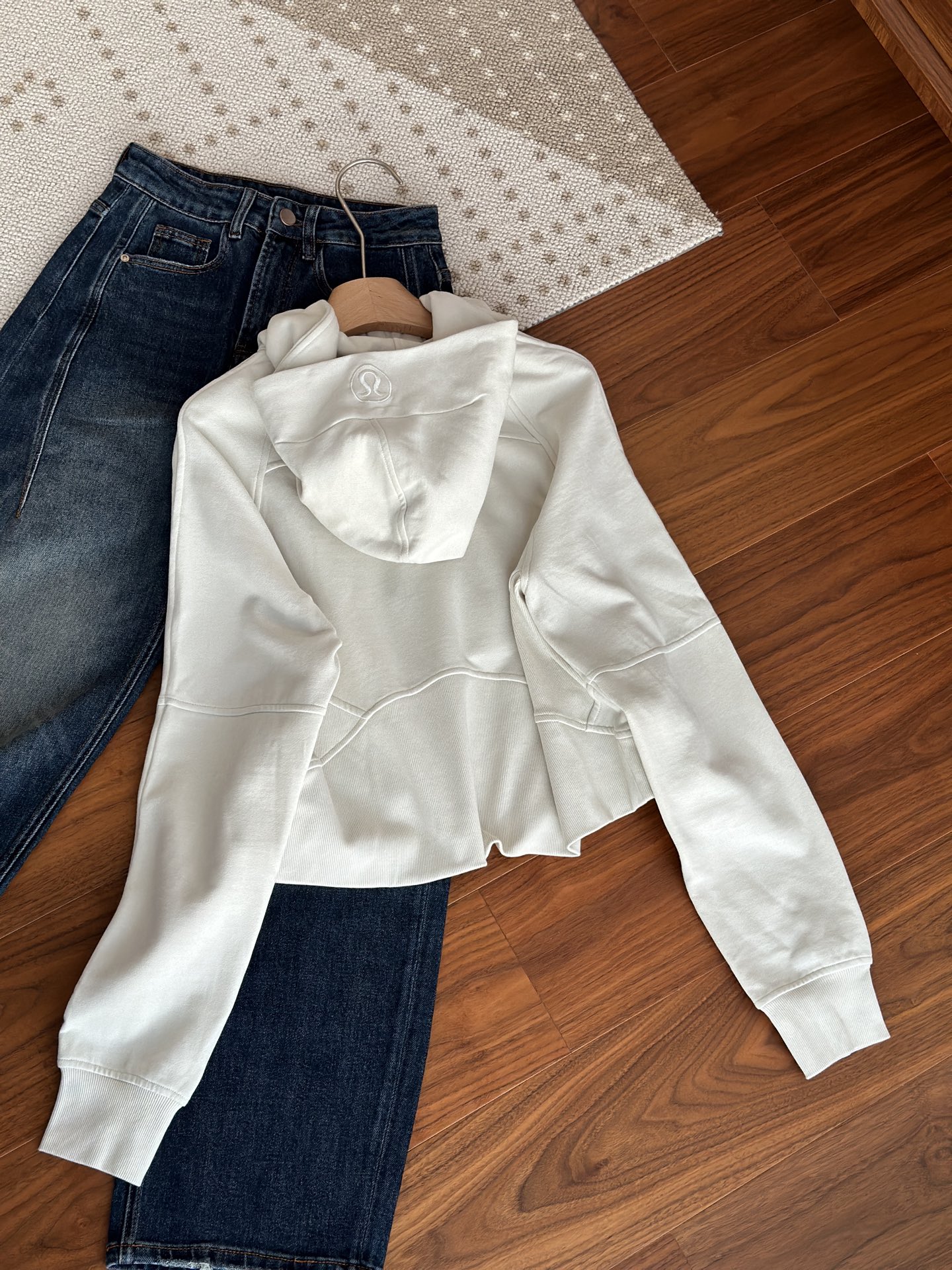Luluemon秋冬scuba系列半拉链宽松连帽卫衣 整件卫衣多道裁片拼接的!显的头身比特别协调!两个袖管大大的!然后长短也很完美!帽子也是大大的!真的是秋冬衣橱必不可少阿! scuba的侧面和下摆都做了螺纹弹力针织,很聪明的设计点,一般女孩子的身材就是这几个地方会有区别,做成弹力针织就能完美适配每一种体型!谁穿都是又瘦又好看的 尺码:xs s m l
