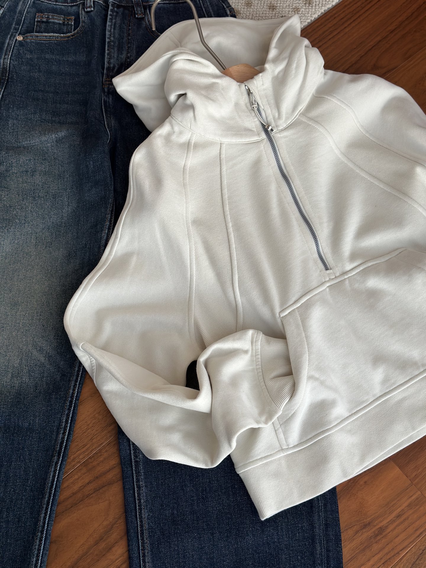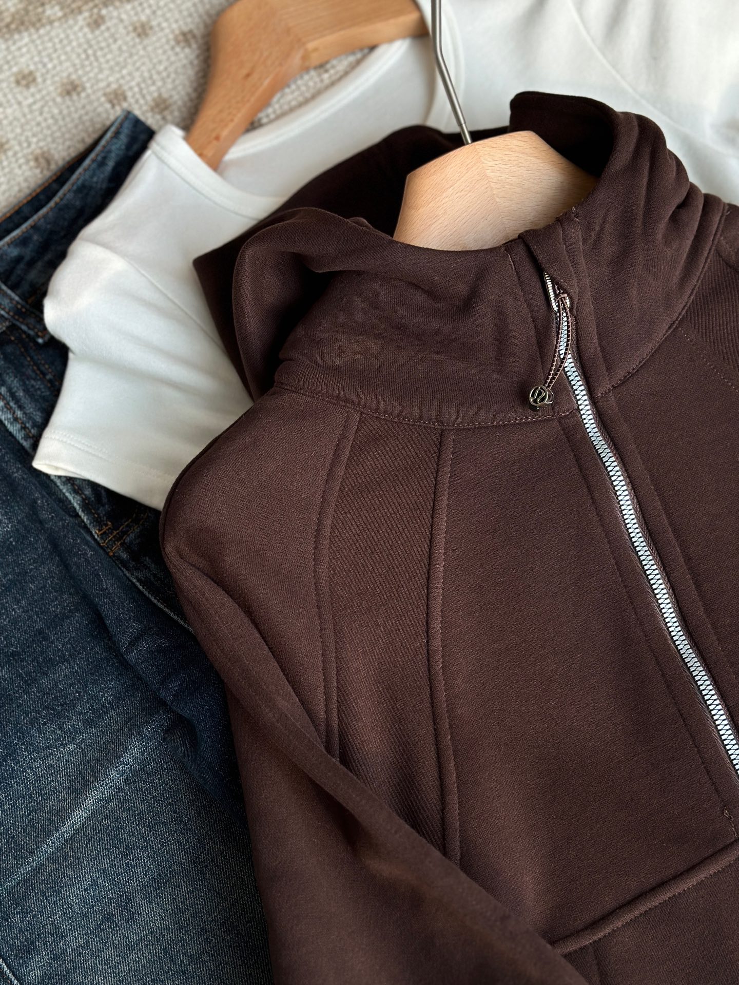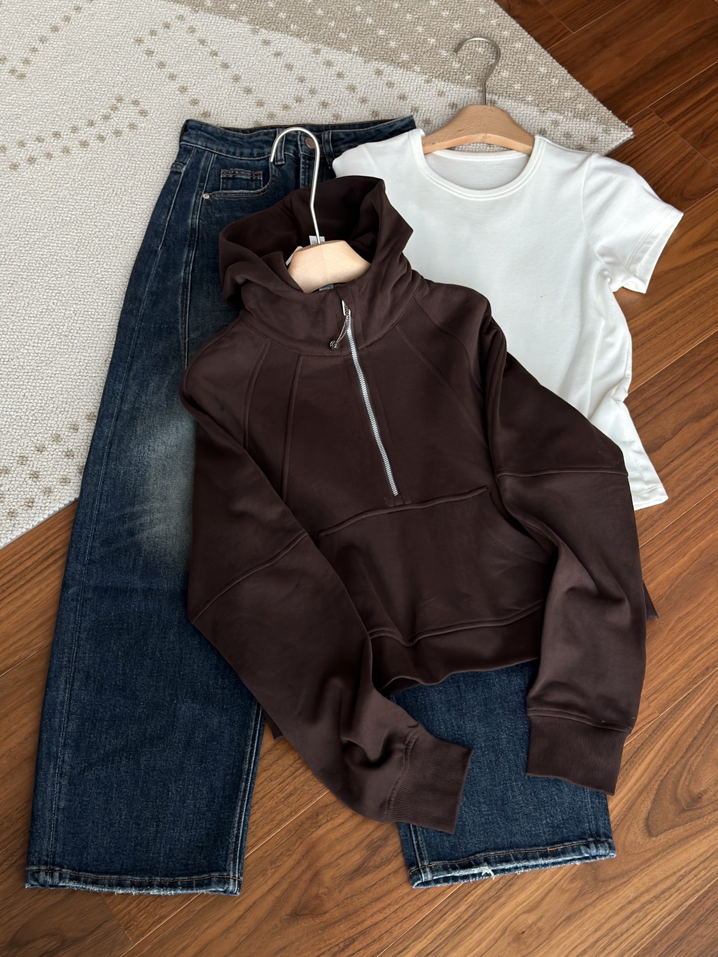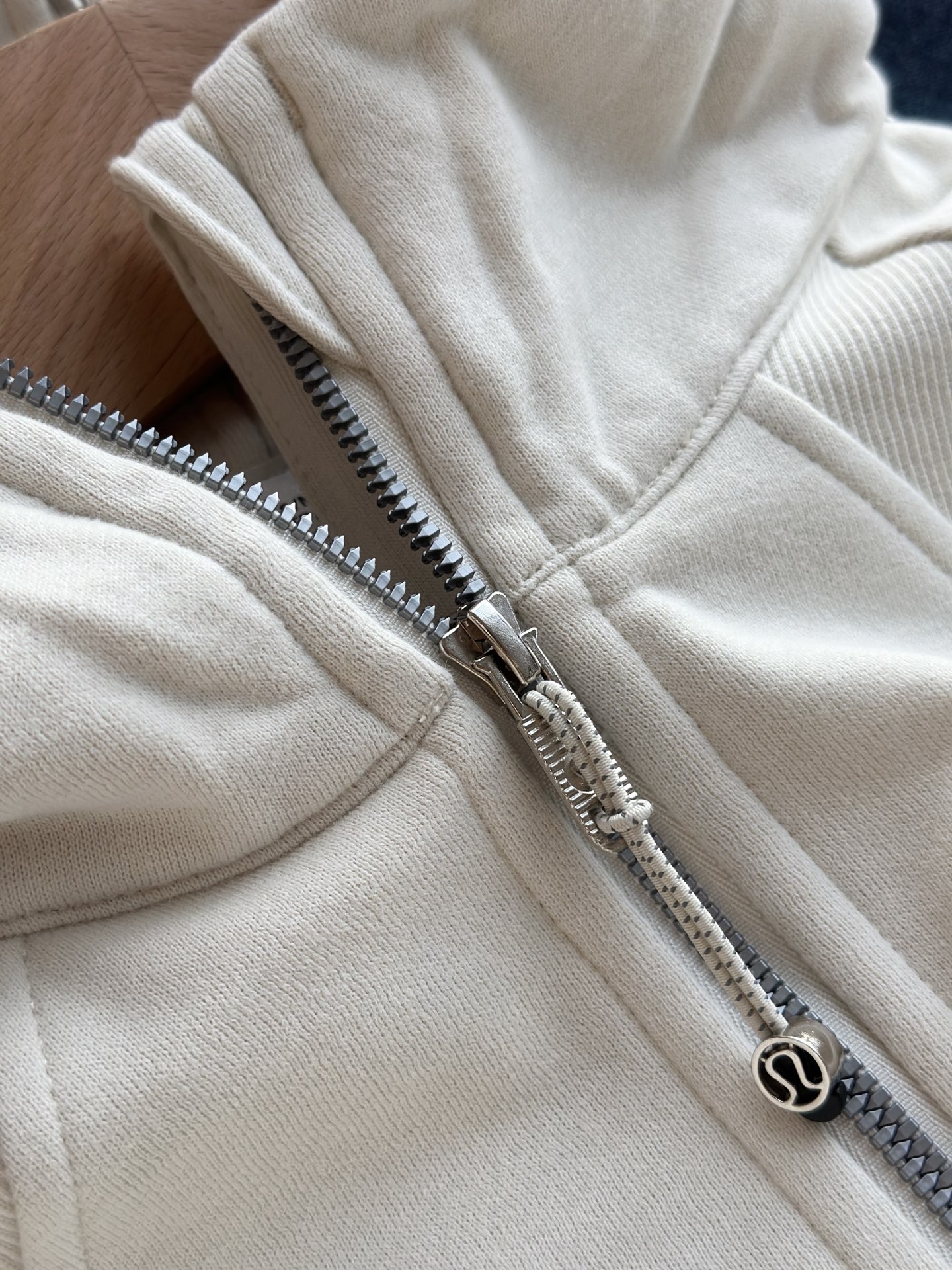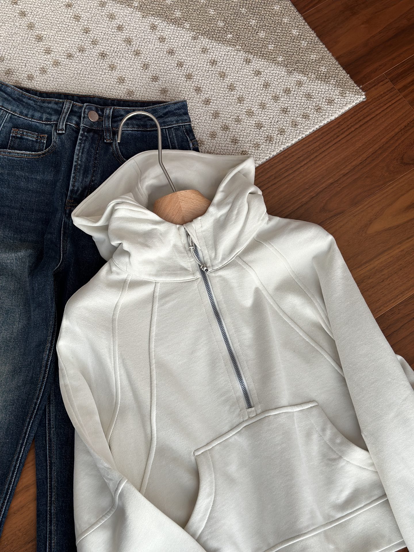 Luluemon秋冬scuba系列半拉链宽松连帽卫衣 整件卫衣多道裁片拼接的!显的头身比特别协调!两个袖管大大的!然后长短也很完美!帽子也是大大的!真的是秋冬衣橱必不可少阿! scuba的侧面和下摆都做了螺纹弹力针织,很聪明的设计点,一般女孩子的身材就是这几个地方会有区别,做成弹力针织就能完美适配每一种体型!谁穿都是又瘦又好看的 尺码:xs s m l