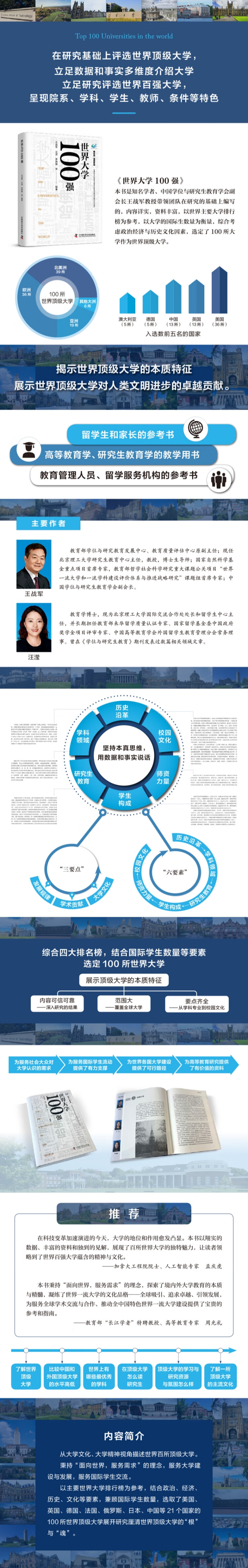 《世界大学100强》是知名学者、中国学位与研究生教育学会副会长王战军教授带领团队在研究的基础上编写的,是以世界主要大学排行榜为参考,以大学的国际生数量为衡量,综合考虑政治经济与历史文化因素,选定了100所大学作为世界顶级大学。其中,北美洲39所、欧洲36所、亚洲19所、其他大洲6所;美国(36所)、英国(13所)、中国(13所)、德国(5所)、澳大利亚(5所)为入选数前三名的国家。