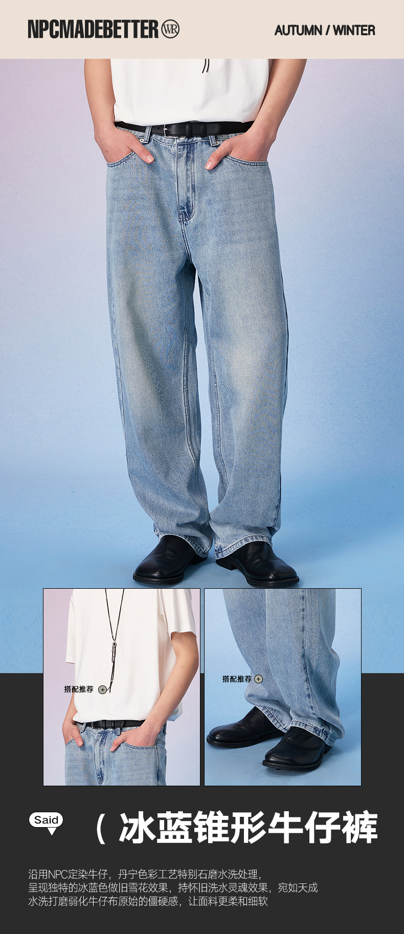 NPC潮牌重磅水洗猫须锥形牛仔裤男复古定制皮标秋季新款NP57DT11