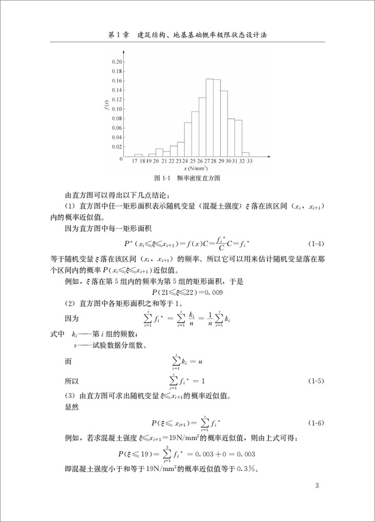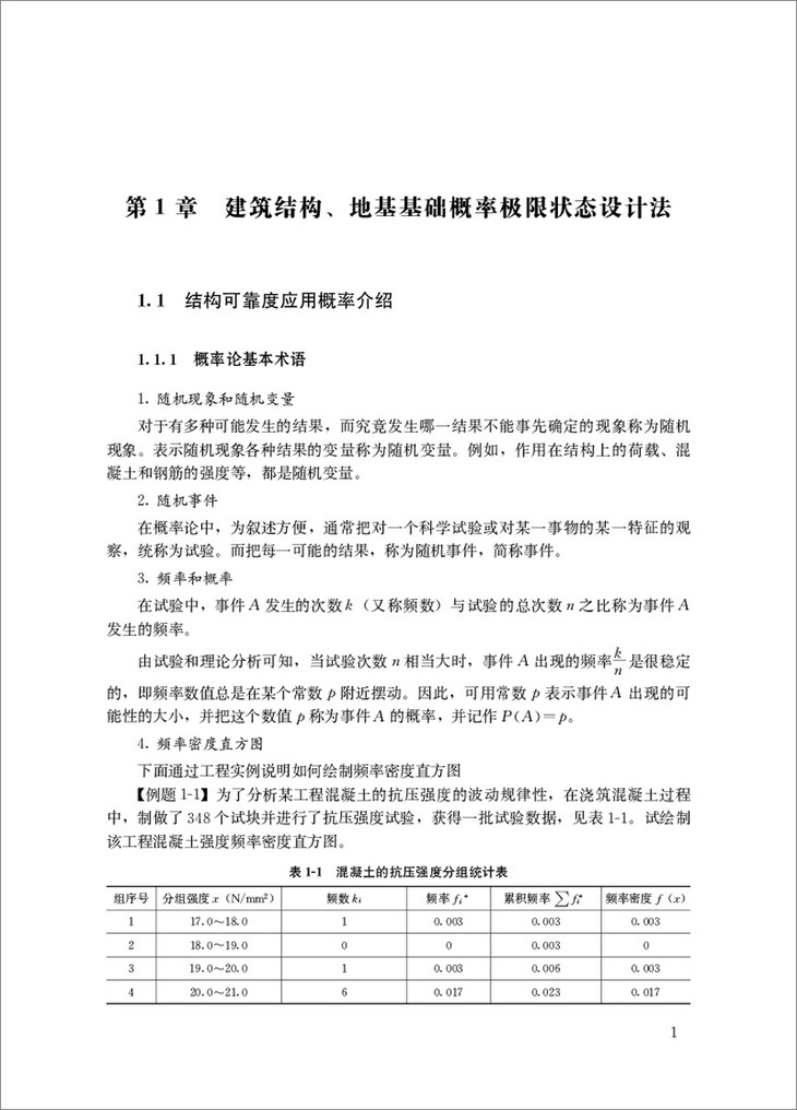 第1章 建筑结构、地基基础概率极限状态设计法。在这一章里,试图以较少的篇幅简要地介绍《建筑结构可靠度设计统一标准》(GB50068—2001)采用以概率为基础的概率极限状态设计法的内容、基本概念。这是学习工程结构的必要基础,也是预防工程事故发生不可或缺的知识。