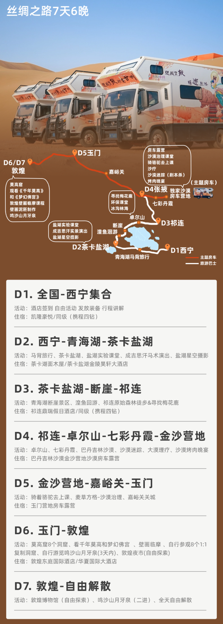 住宿:D1西宁万枫酒店/凯隆豪悦/同级(携程四钻)、D2茶卡湖面木屋/天空壹号酒店/同级(携程四钻)、D3祁连鼎瑞假日酒店/同级(携程四钻)、D4巴丹吉林金沙湾沙漠营地房车露营、D5玉门营地房车露营、D6敦煌东庭国际酒店/敦煌宾馆/同级(携程四钻)。