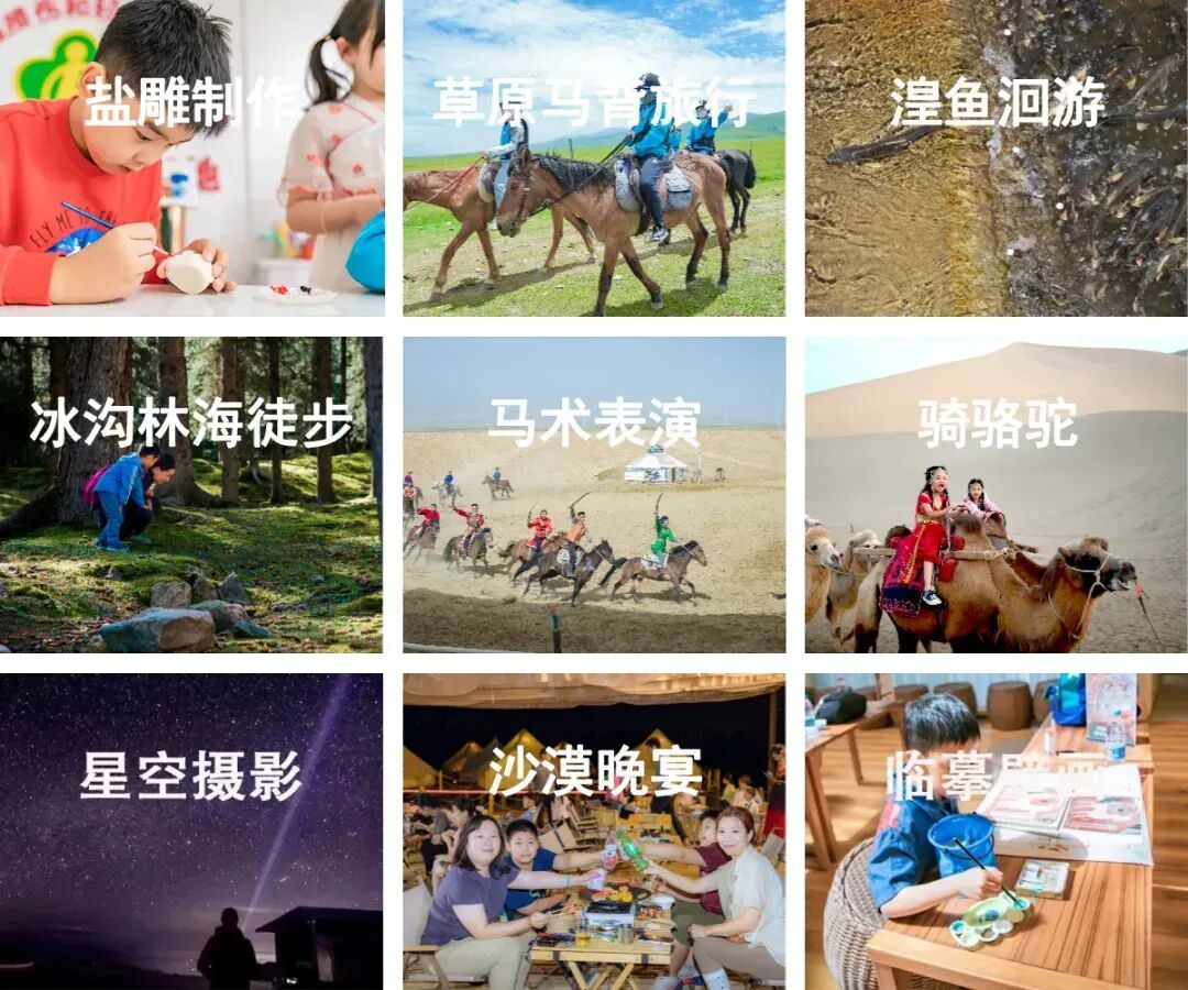 体验:青海湖马背旅行、盐湖实验课堂、成吉思汗马术实景演出(如遇恶劣天气影响,室外项目存在一定危险性,景区取消则自动取消该项目,请大家理解)、盐湖星空摄影(如遇恶劣天气影响,室外星空项目则自动取消,请大家理解)、沙漠挑战赛、骑着骆驼去上课、沙漠治理-麦草方格、看莫高环球影幕数字电影《千年莫高》和《梦幻佛宫》 (30天内报名未抢到A类门票的家庭则无法体验莫高环球影幕数字电影项目)、敦煌壁画临摩等行程所涉及体验活动。