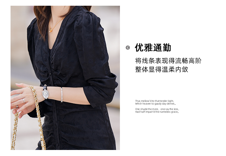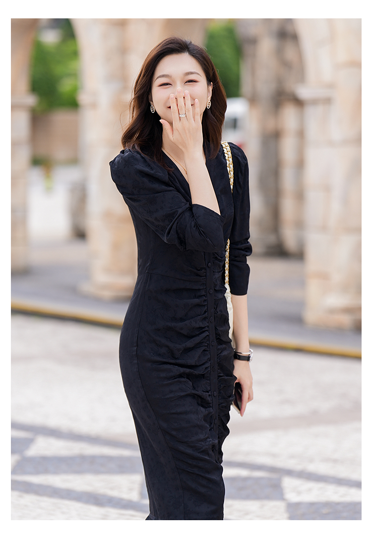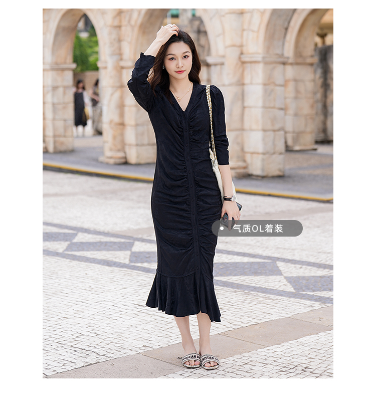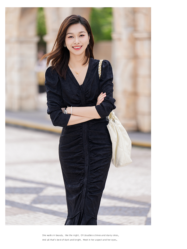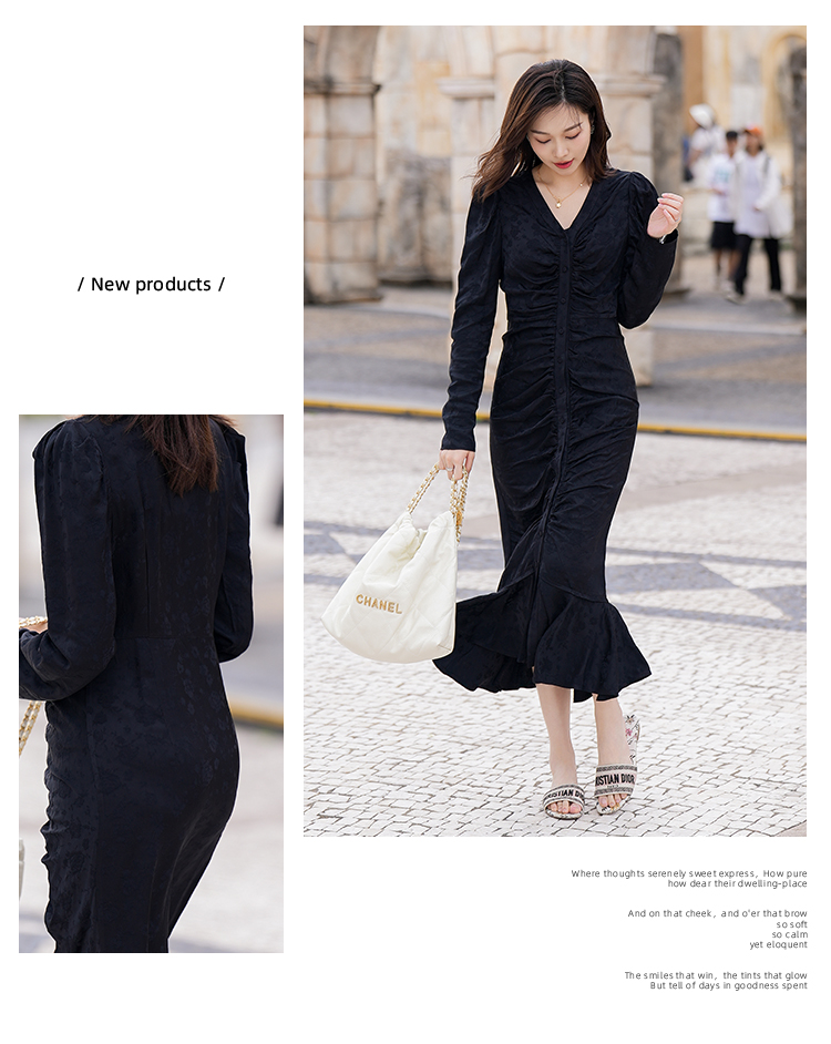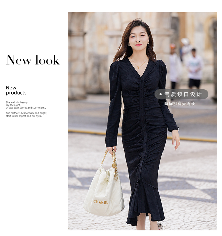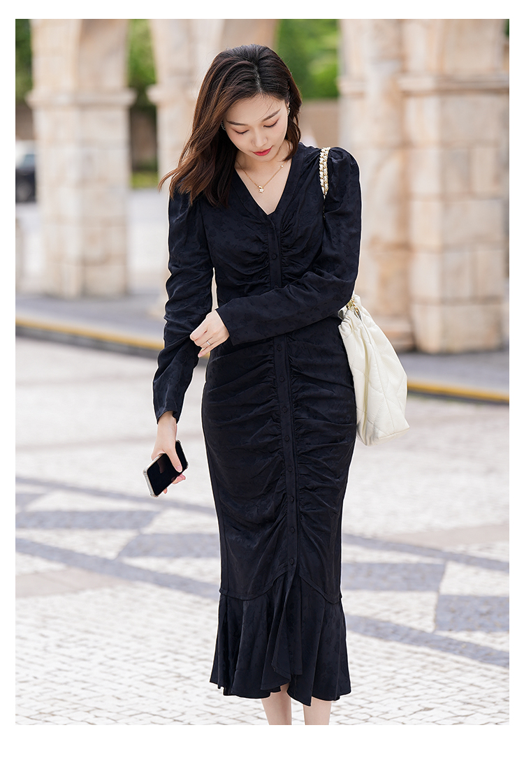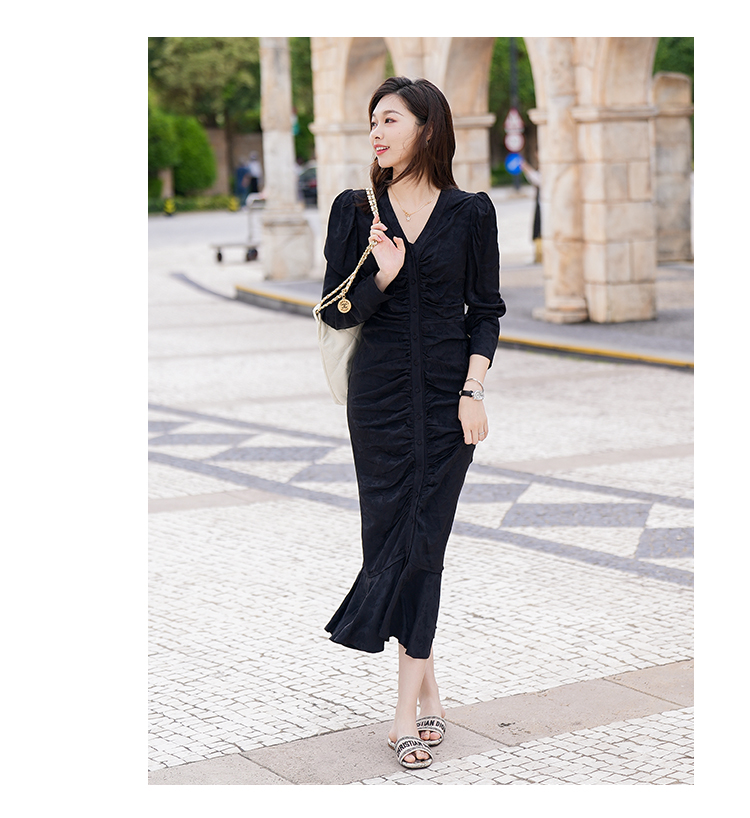 国风系列 黑色泡泡袖褶皱连衣裙女夏季新款收腹鱼尾裙