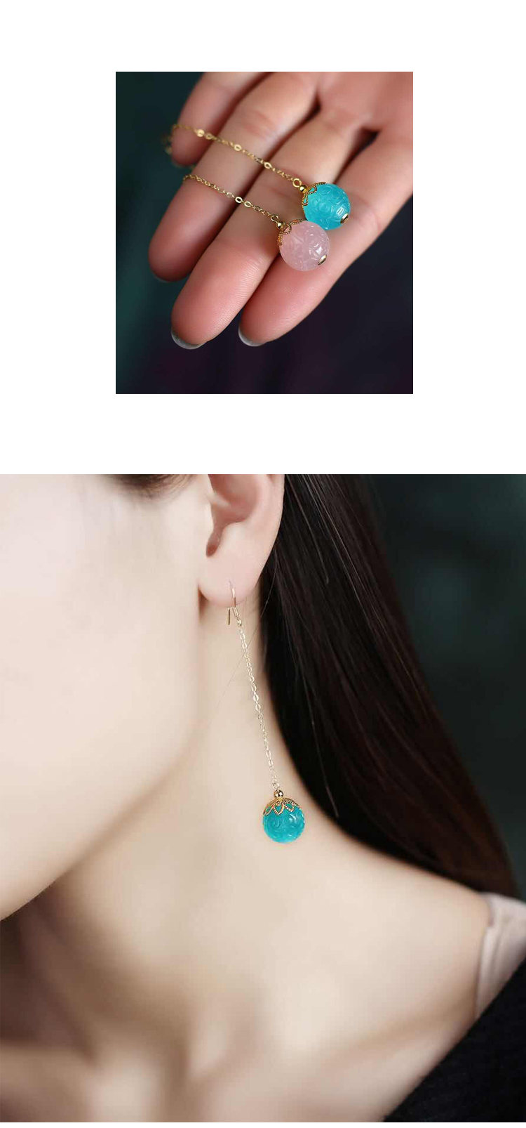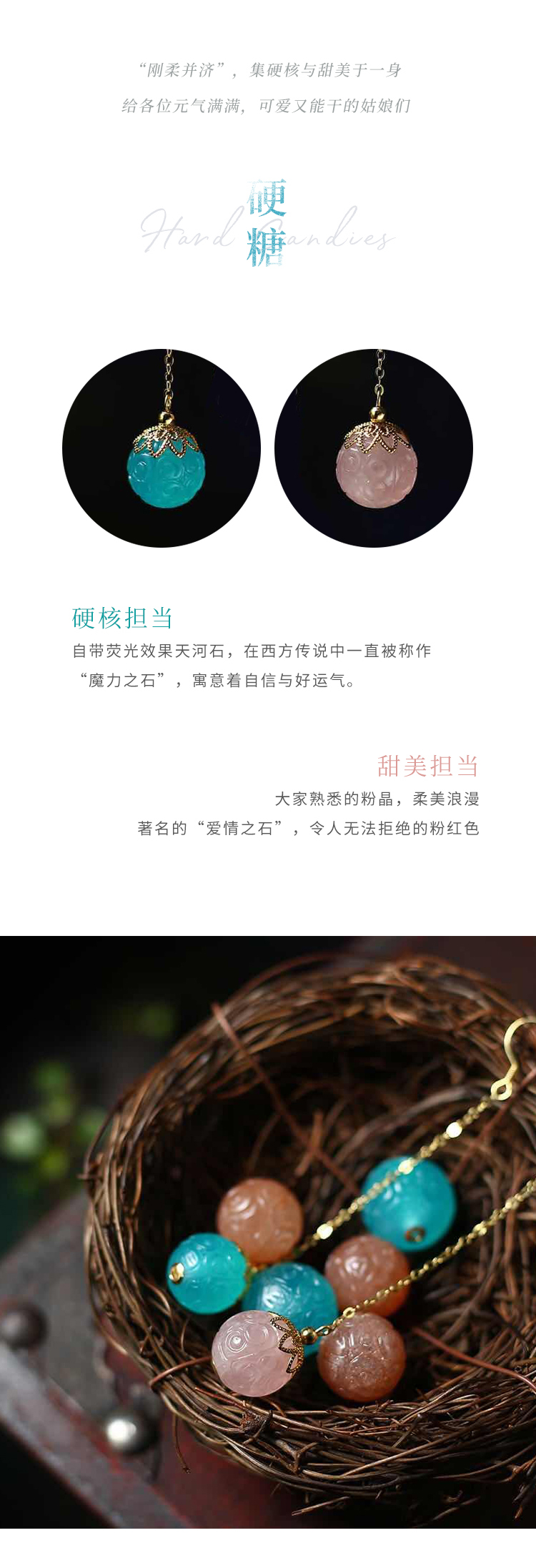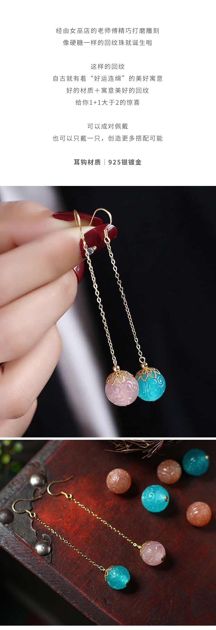 元气硬糖*双色设计天河石粉晶回纹珠老银耳饰
