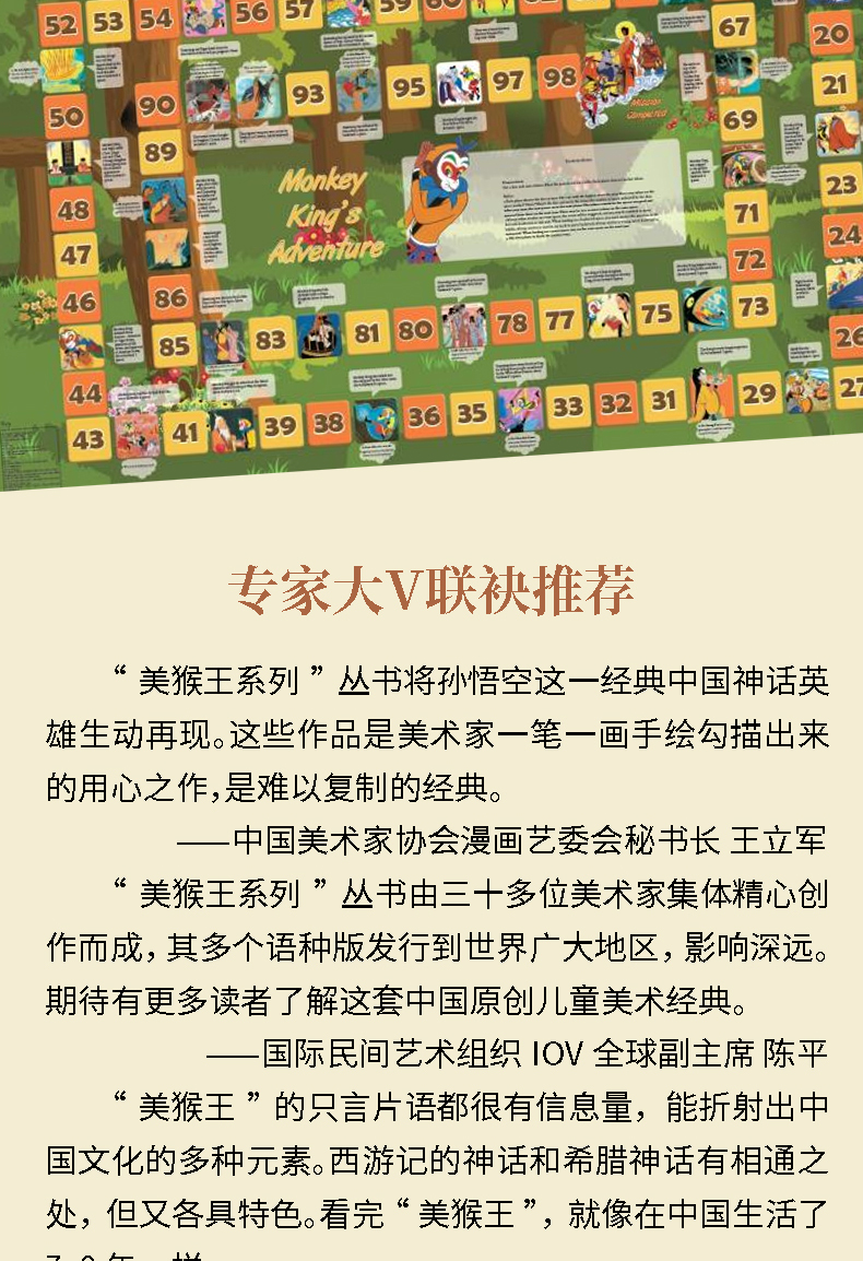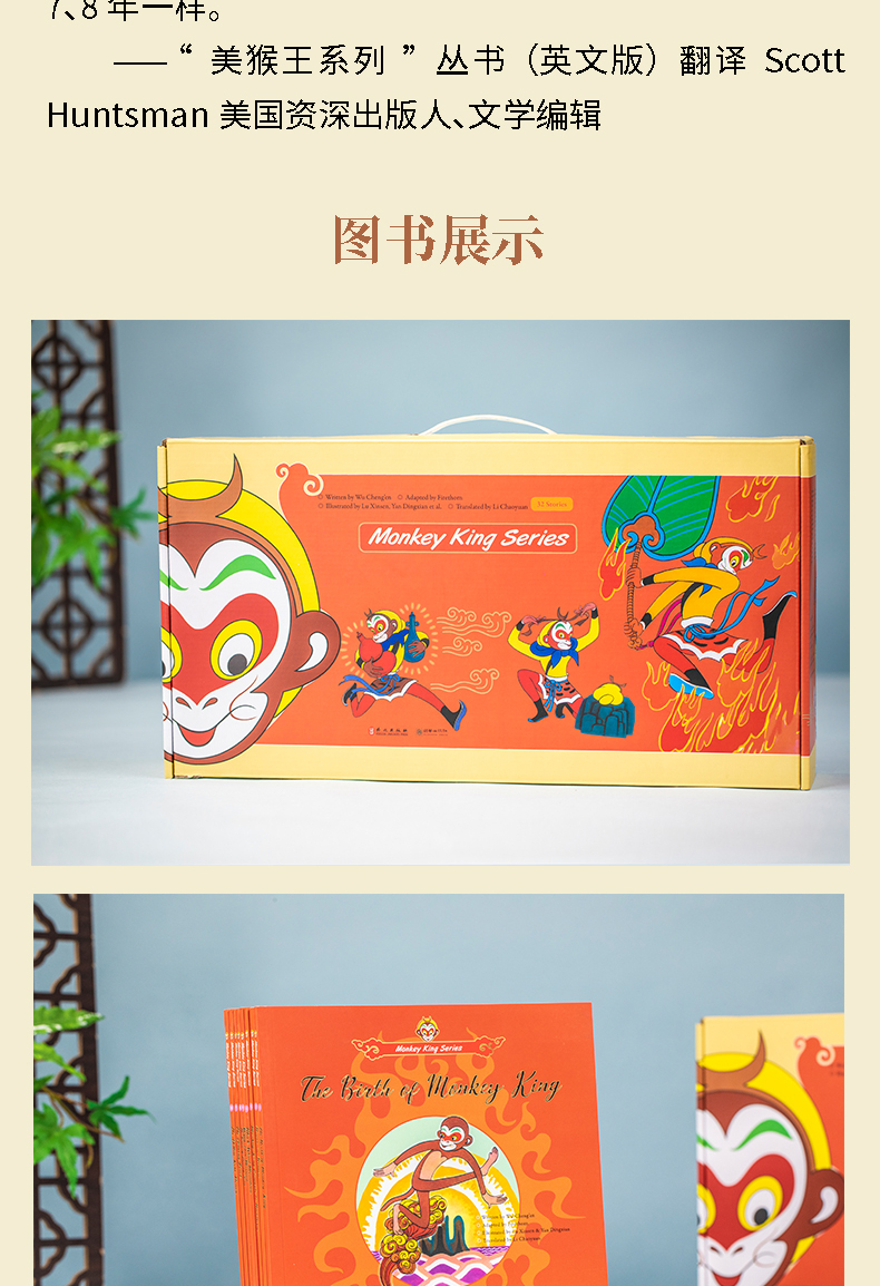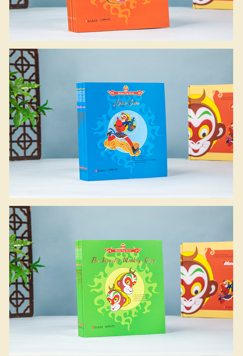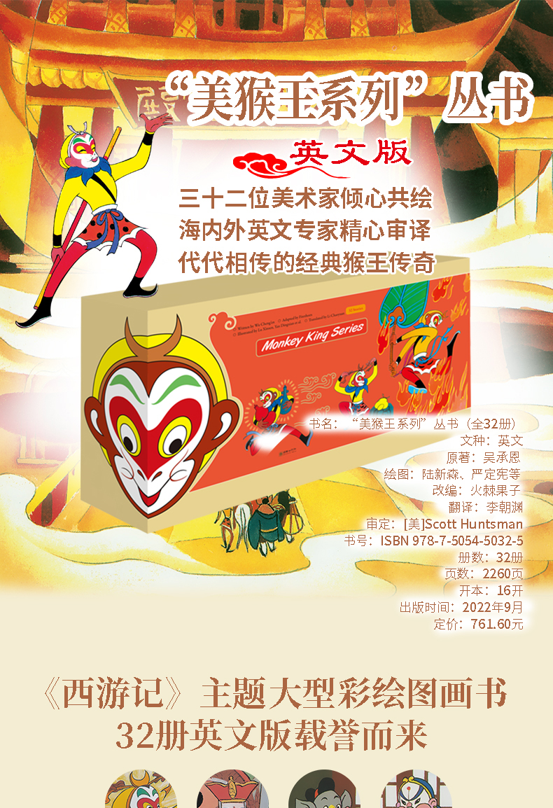 “美猴王系列”丛书(32册,英文版)自《美猴王系列·猴王出世》开始,至《美猴王系列·取回真经》止,包括“大闹天宫”“悟空归正”“猪八戒做女婿”“勇擒红孩儿”“真假美猴王”“三调芭蕉扇”“扫平假西天”“盘丝洞”“无底洞”等广大读者耳熟能详的故事,涵盖了九九八十一难的全部主要情节。