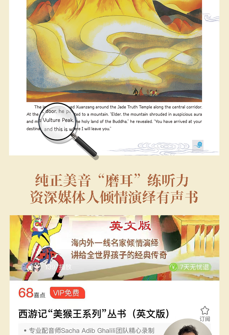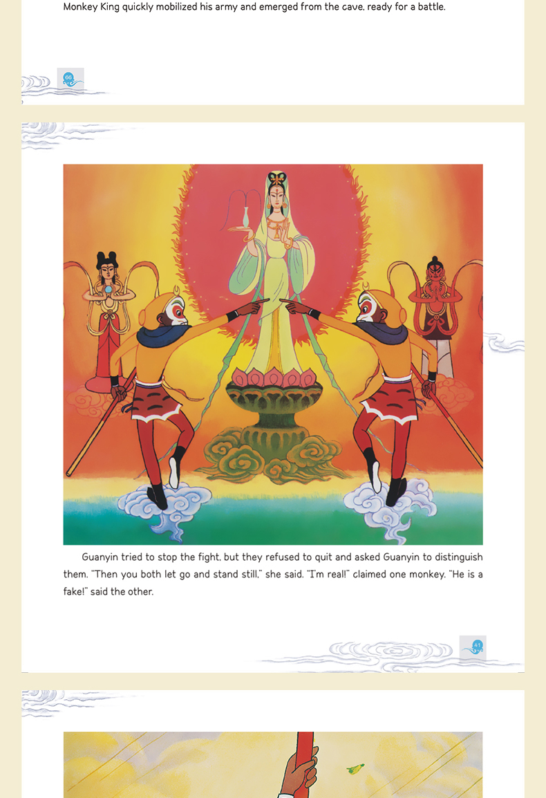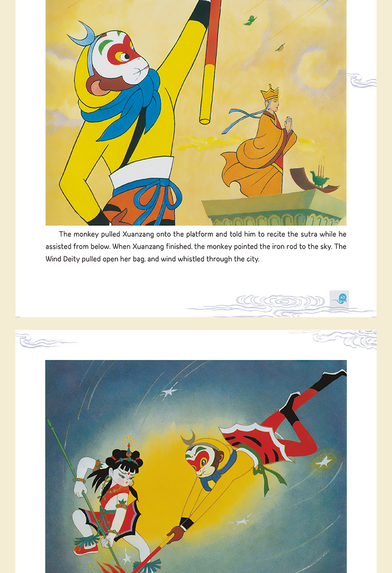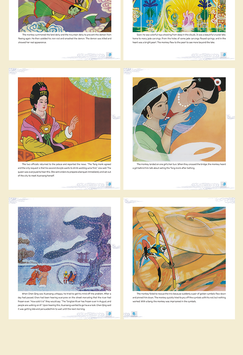 “美猴王系列”丛书(32册,英文版)自《美猴王系列·猴王出世》开始,至《美猴王系列·取回真经》止,包括“大闹天宫”“悟空归正”“猪八戒做女婿”“勇擒红孩儿”“真假美猴王”“三调芭蕉扇”“扫平假西天”“盘丝洞”“无底洞”等广大读者耳熟能详的故事,涵盖了九九八十一难的全部主要情节。