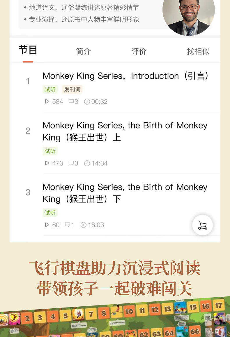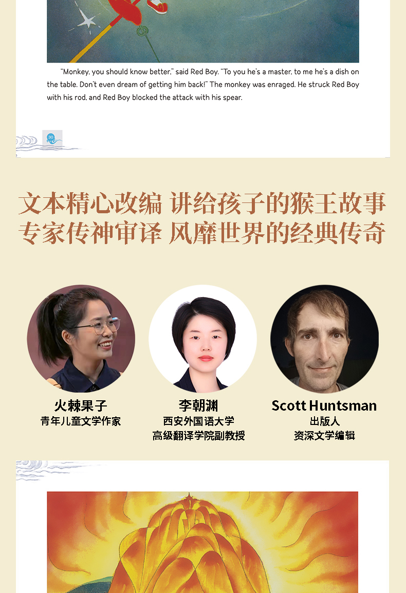 本书基于朝华出版社“美猴王系列”丛书(中文版)翻译改编而成,原系列丛书改编自我国“四大名著”之一的《西游记》,汇集了陆新森、严定宪、周大光等30余位知名美术家自1980年代起精心绘制的《西游记》主题系列图画作品,少年儿童文学作家火棘果子担任文字作者,在保留原著精华主干的基础上,结合少儿读者阅读需求,进行生动精彩的改编,是我国儿童文学和美术事业的代表作品之一。全套图书由资深英文专家翻译审定,确保译文地道流畅,贴近英文读者的阅读与表达习惯。