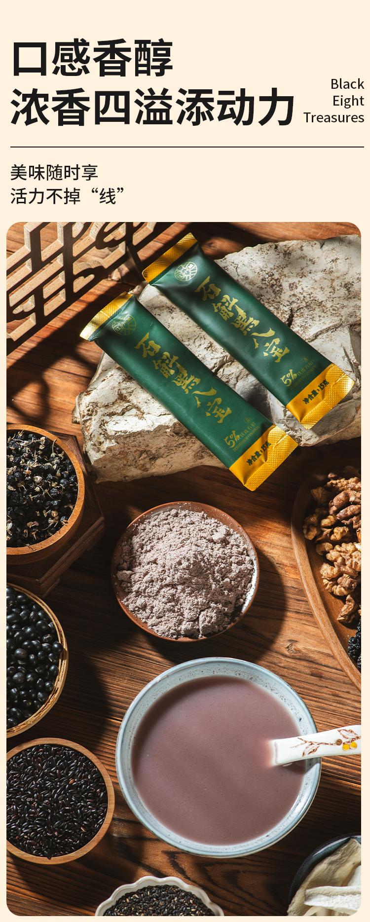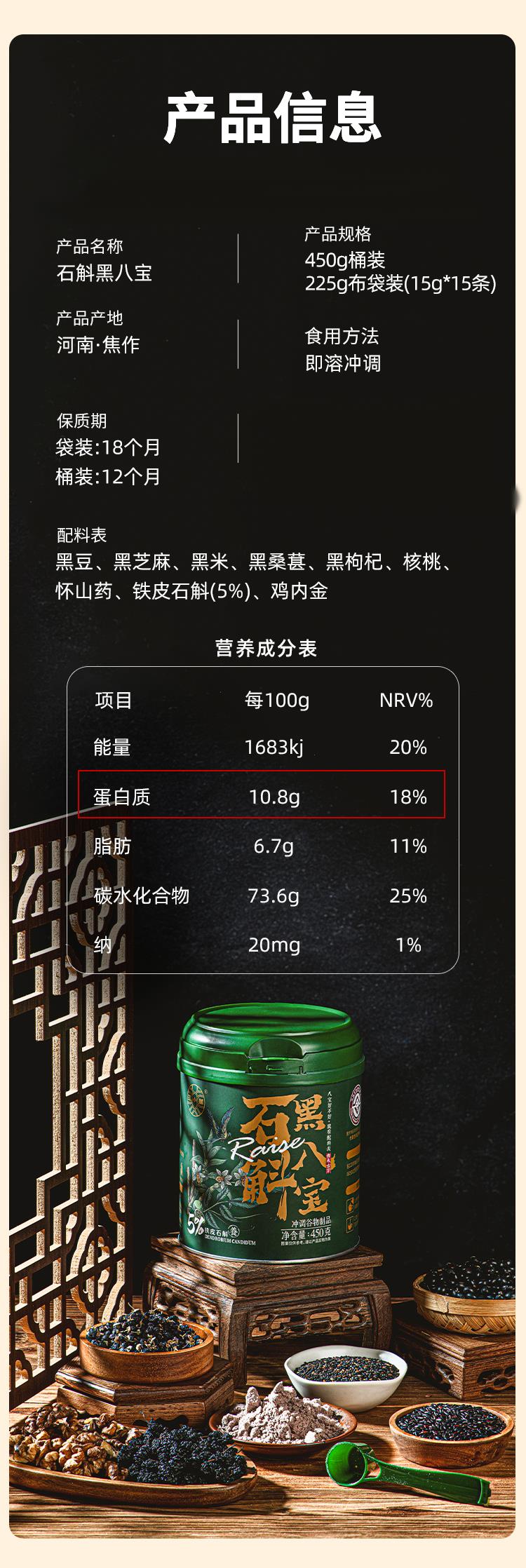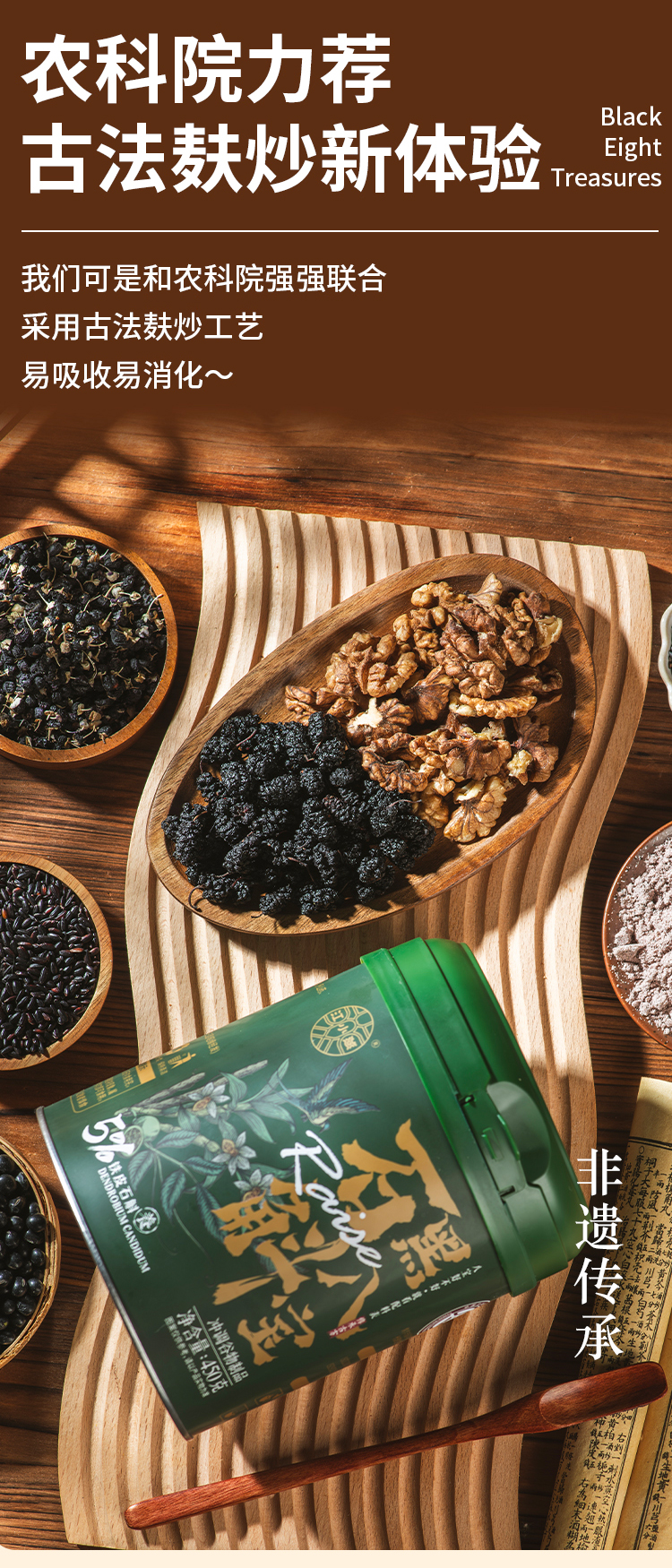 【配料表】黑豆、黑芝麻、黑米、黑桑葚、黑枸杞、核桃、怀山药、铁皮石斛(5%)、鸡内金