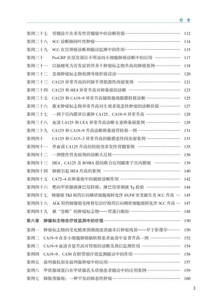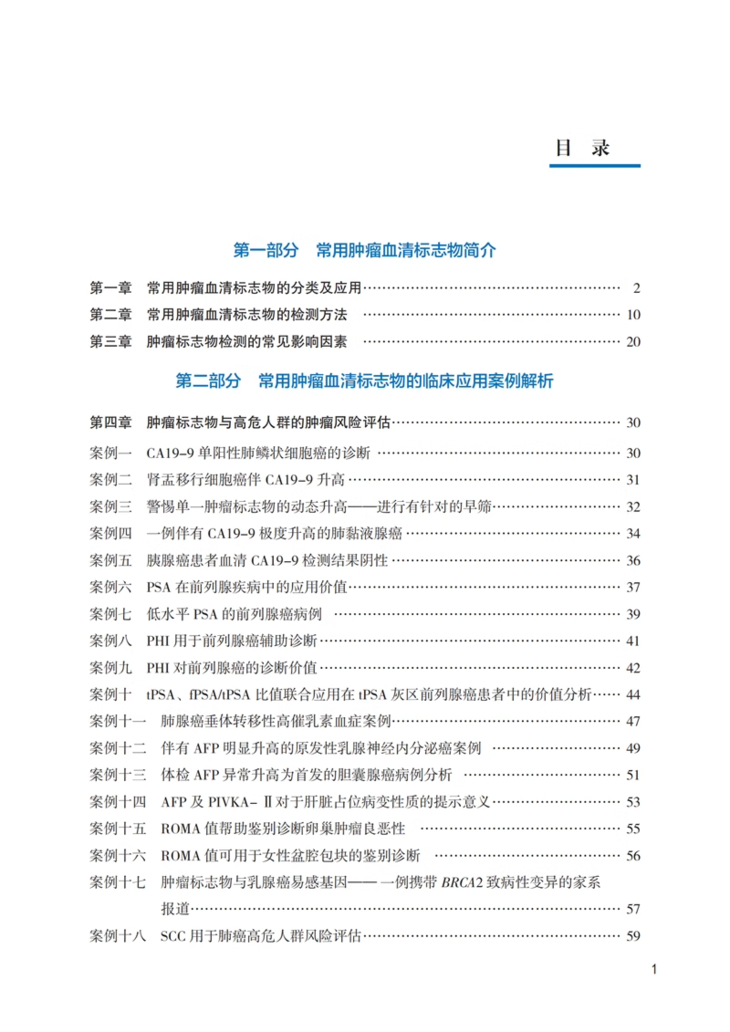 全书第一部分介绍常用肿瘤血清标志物的分类及应用、检测方法、检测影响因素,概述了肿瘤标志物的基本状况。第二部分展现了124例常用肿瘤血清标志物的临床应用案例,分别从肿瘤标志物与高危人群的肿瘤风险评估、在诊断及鉴别诊断中的价值、在疗效监测中的价值、在预后随访中的价值方面遴选案例,主要体现肿瘤标志物的临床实用价值。第三部分展现了146例常用肿瘤血清标志物特殊案例解析,分别从诊疗操作、药物、生理状况、良性疾病、检测平台、血液中其他干扰物质对肿瘤标志物检测结果影响的精选案例,主要展示不同因素对肿瘤标志物结果的影响。