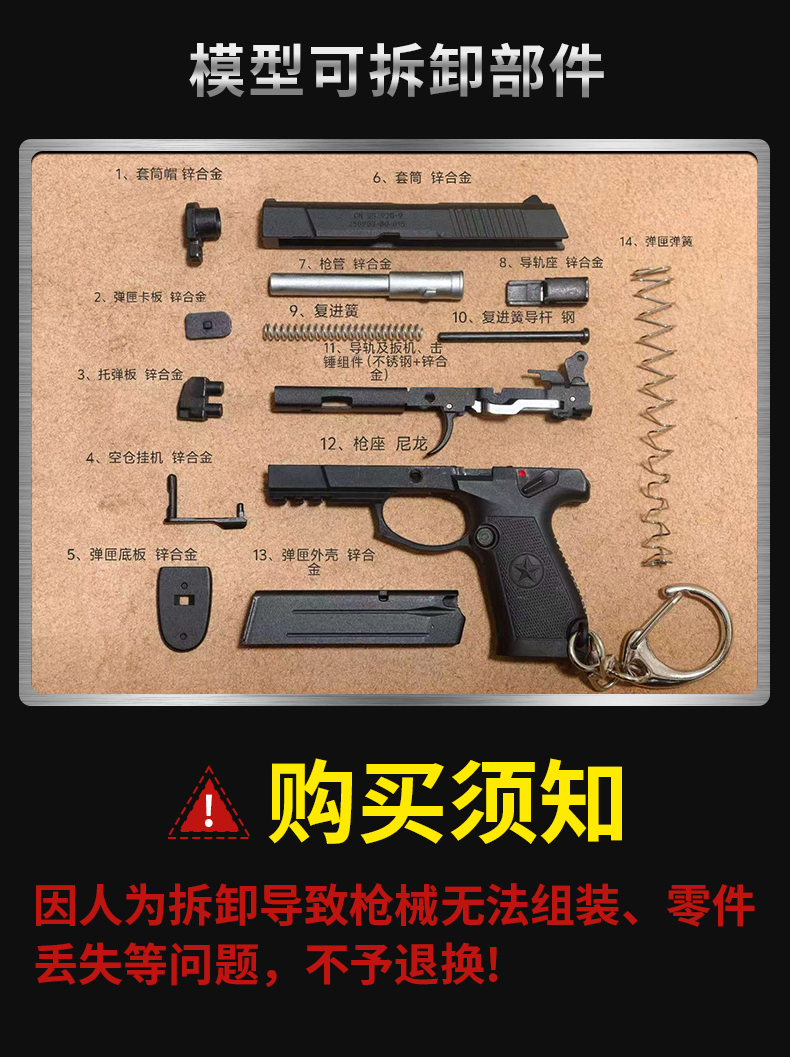 2、关于组装、拆卸问题:由于零部件较小,拆卸时一定要注意别丢失,因人为拆卸导致枪械无法组装、零部件丢失等问题,不予退换,也无法单独补发零件哦,望知悉!