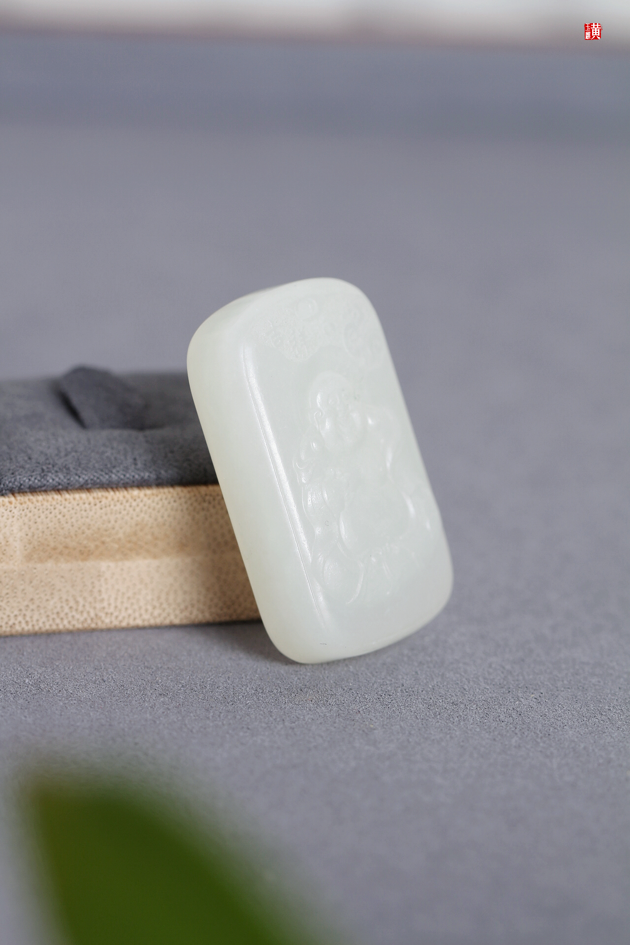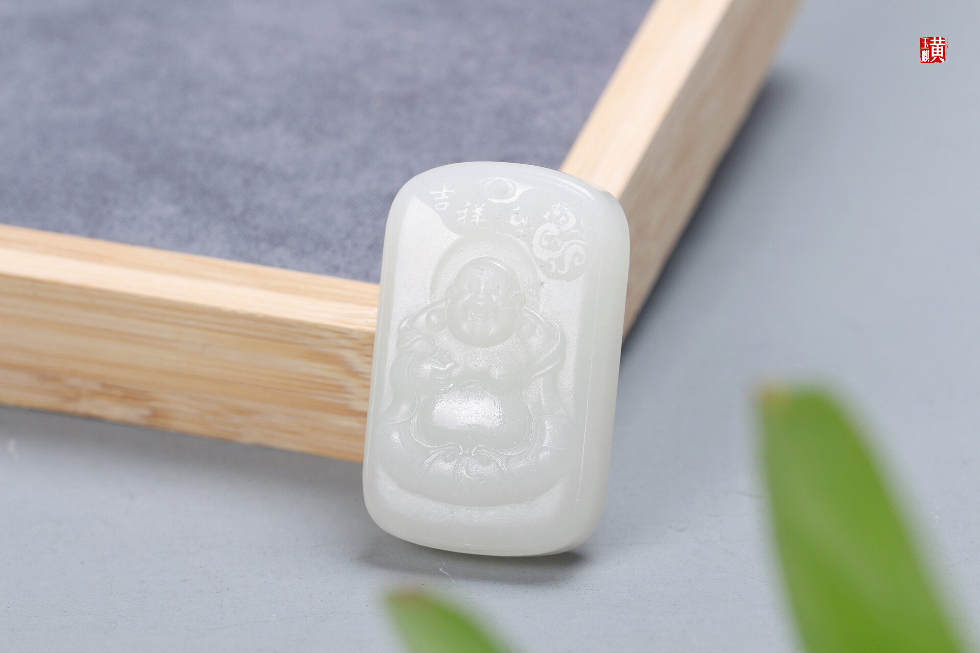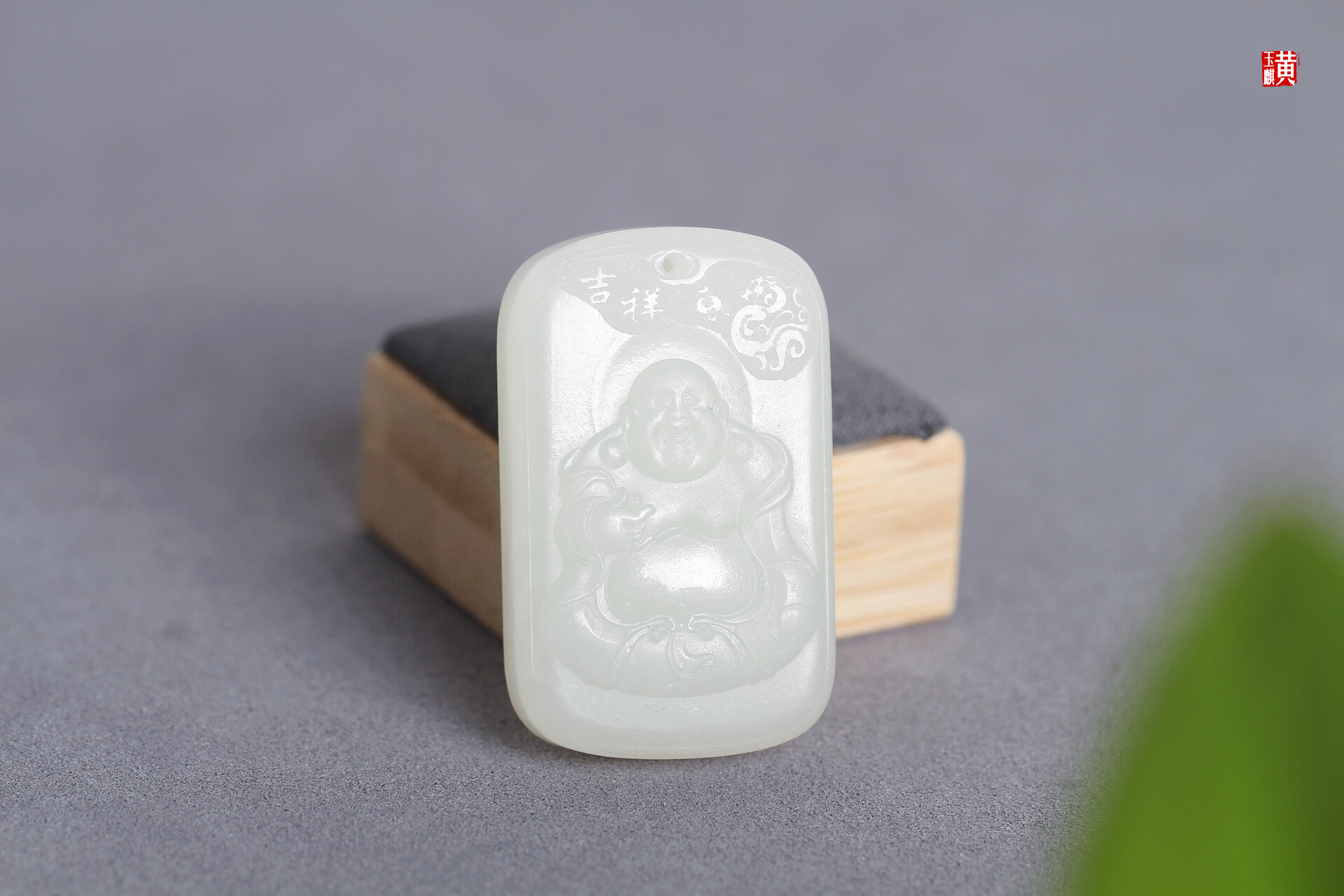 和田白玉【欢喜弥勒佛】吊坠, 配精美挂绳