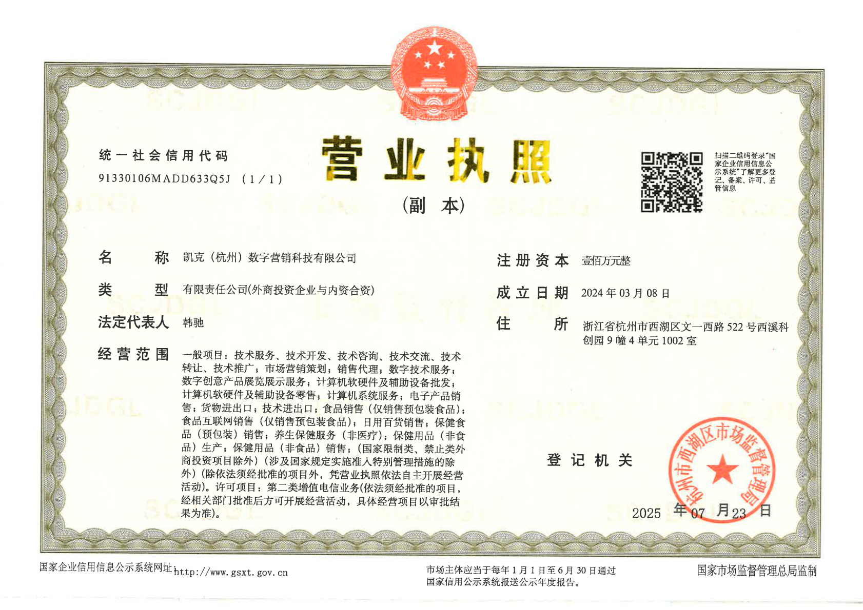 营业执照为产品经营者信息,产品的内容、经营、服务均由凯克(杭州)数字营销科技有限公司提供。