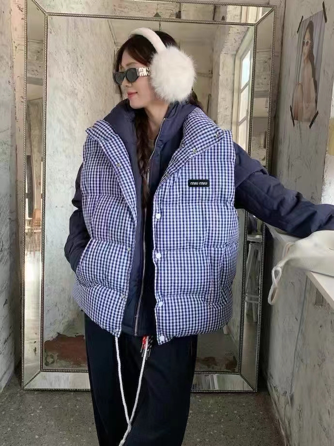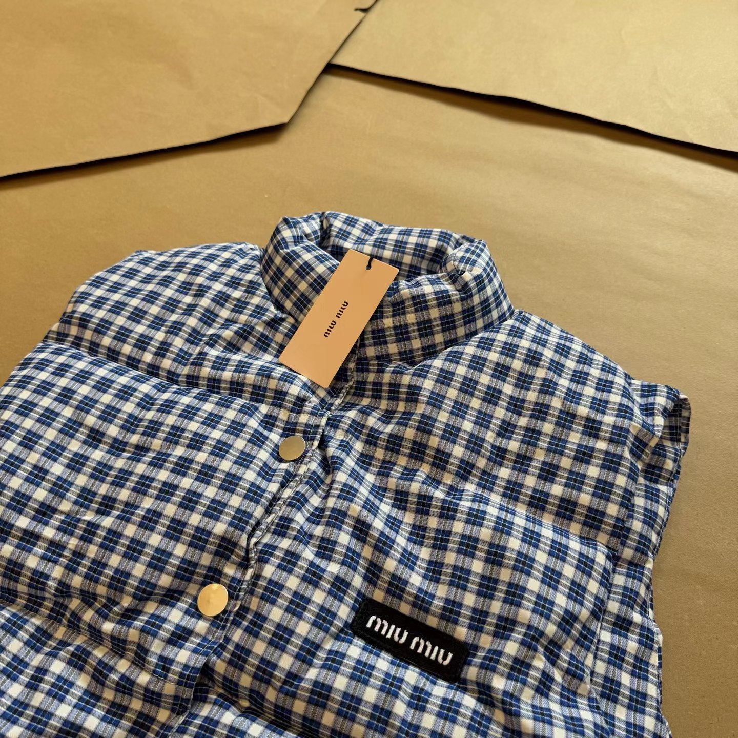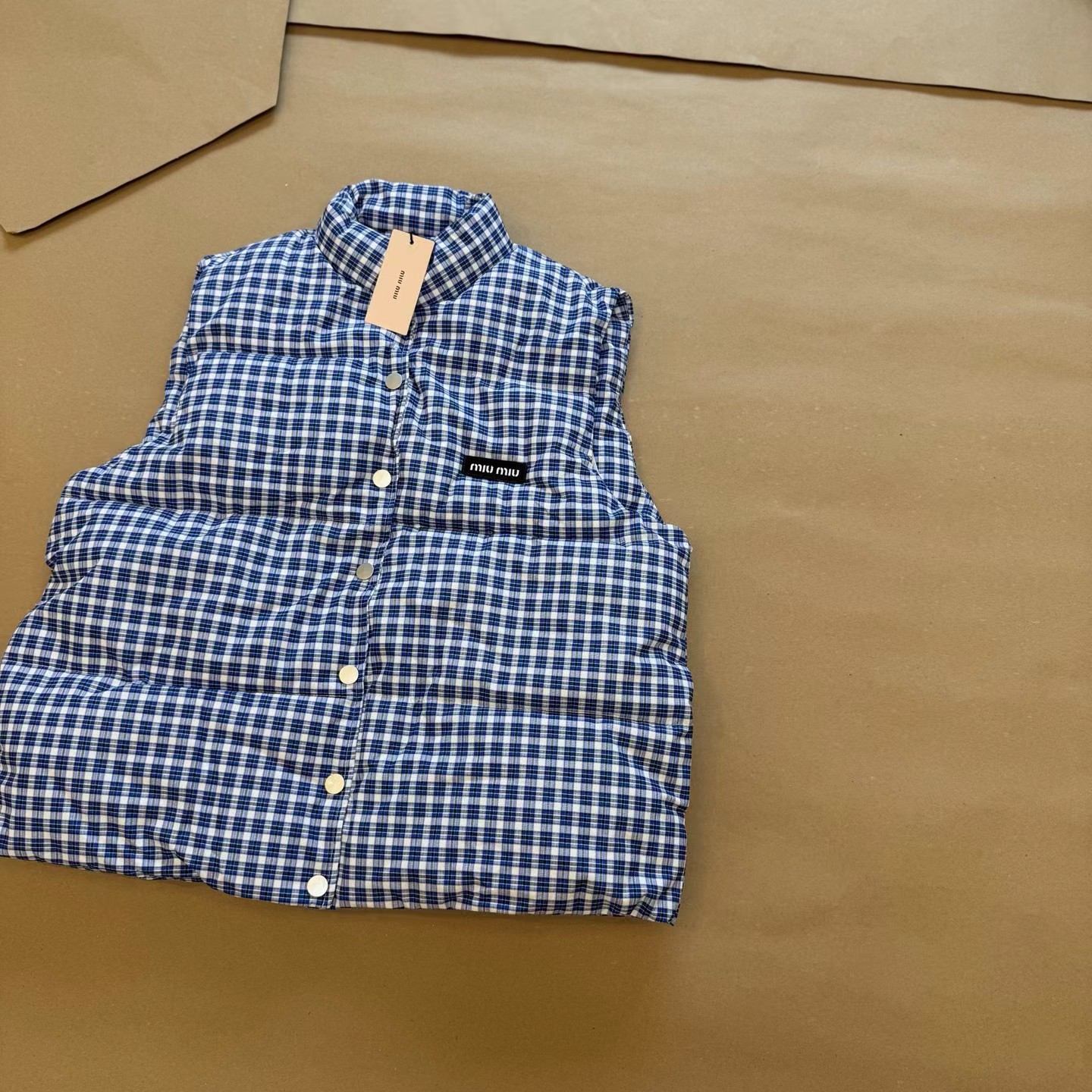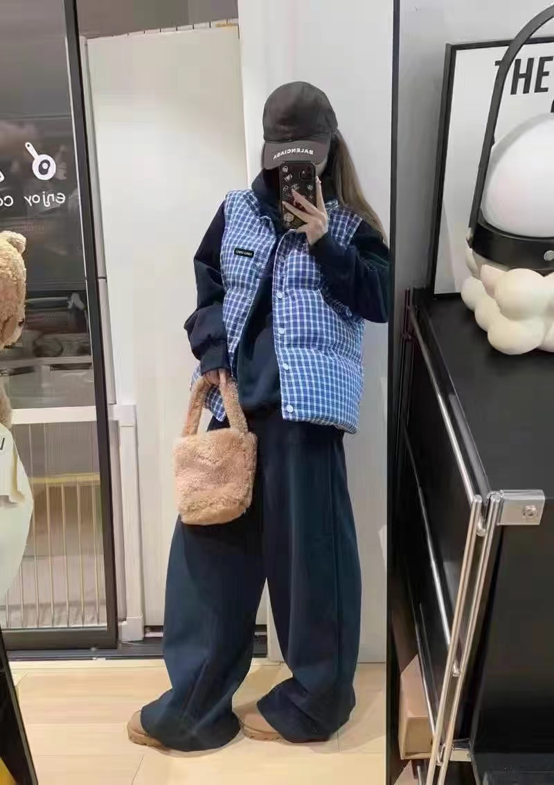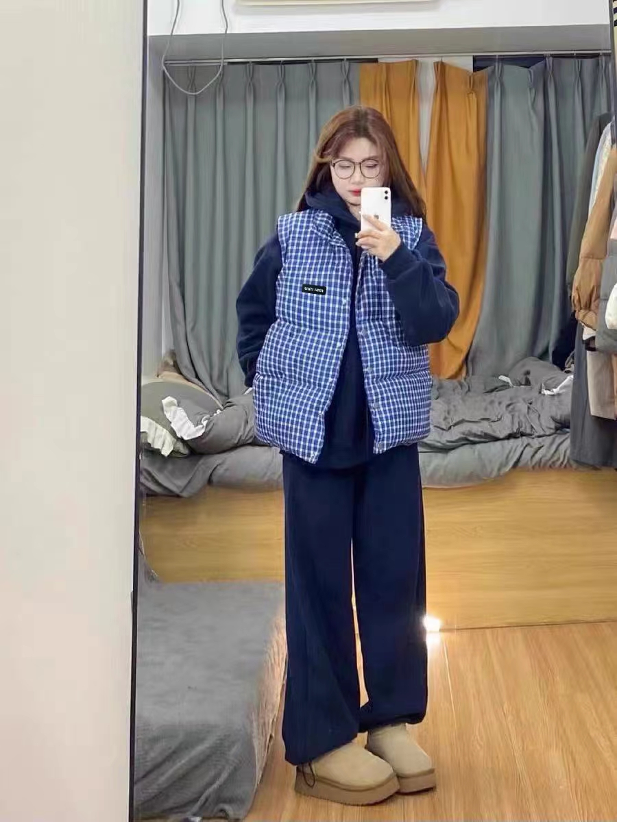 25Fw 蓝色格纹无袖高领马甲背心棉服