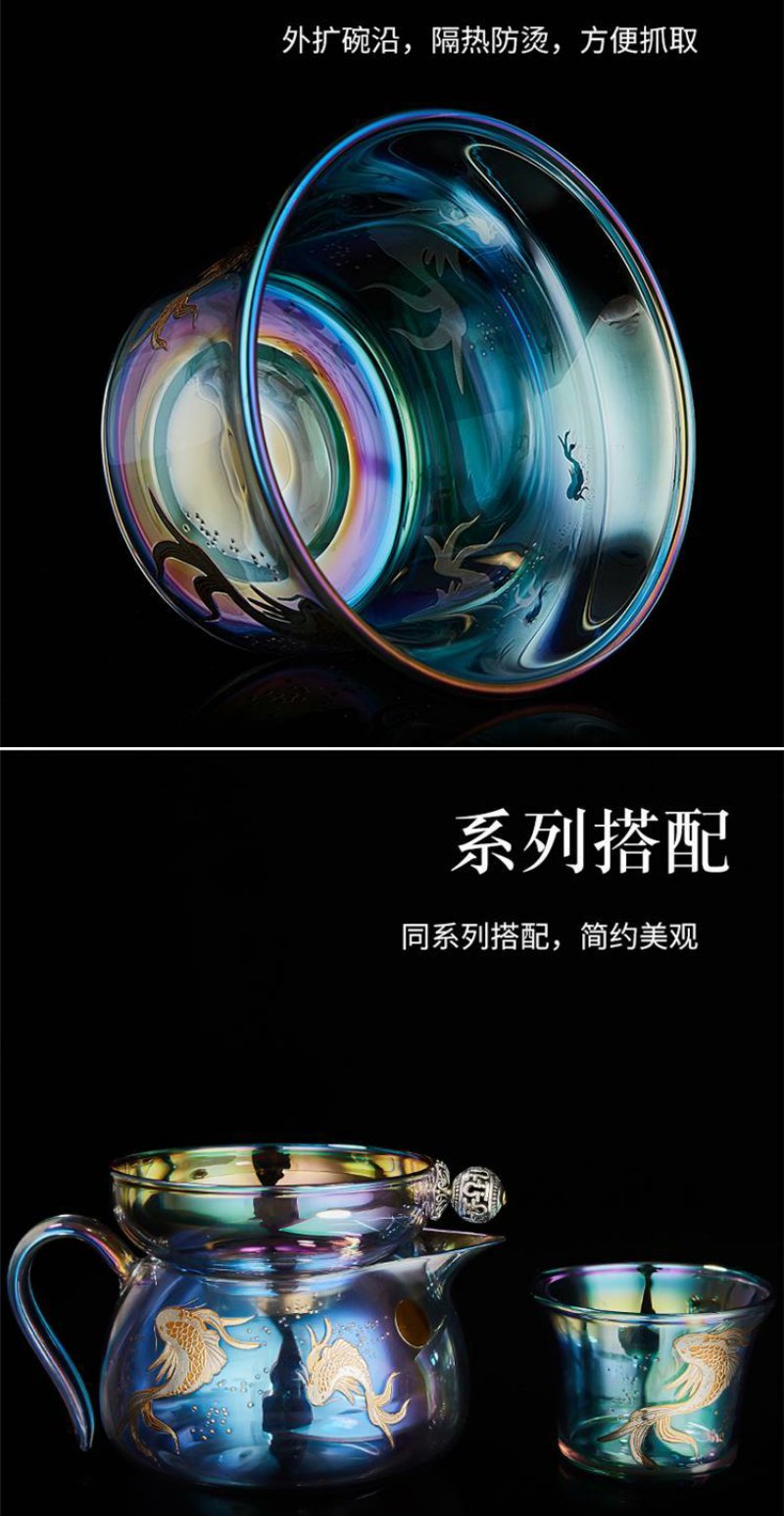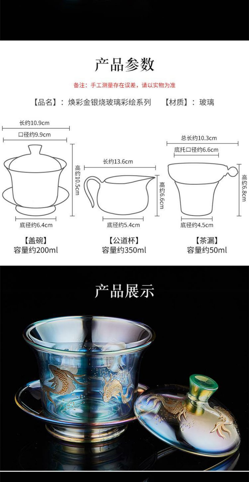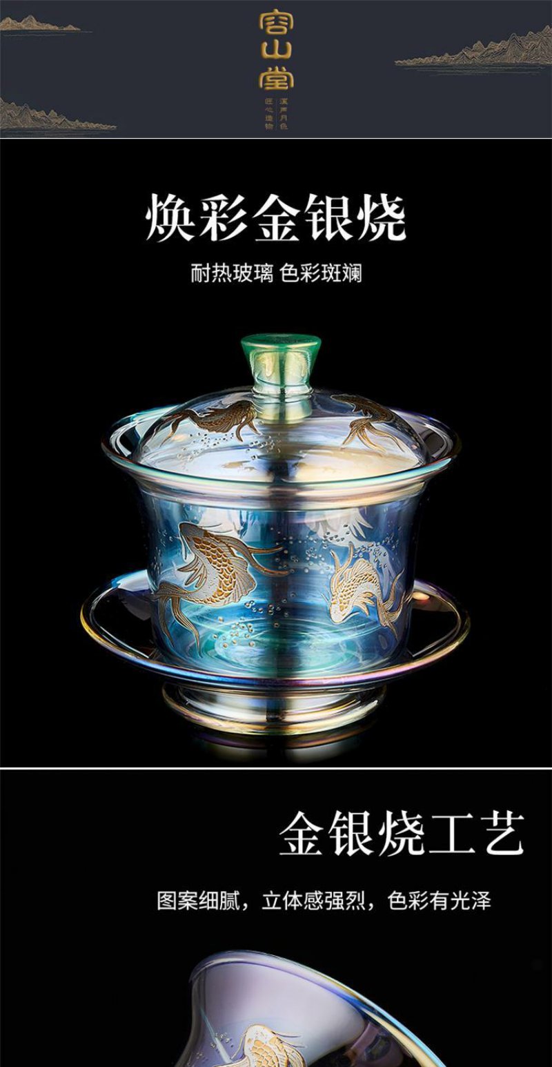 容山堂焕彩金银烧玻璃盖碗耐热加厚三才茶碗泡茶杯公道杯茶漏套装