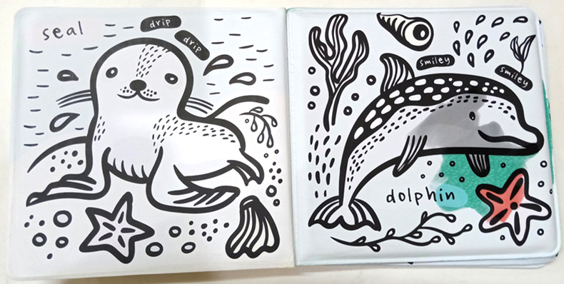 各种有趣的水生物、配上简单的单词、吸引着宝宝的注意,不知不觉就洗完啦!