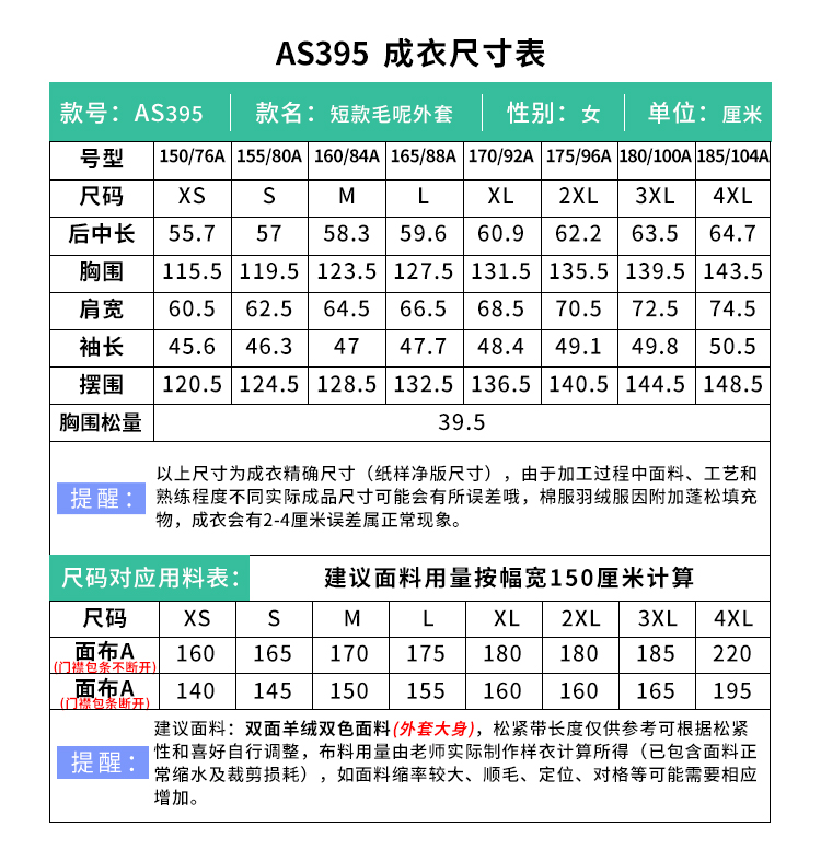 裁缝学苑AS395双面呢羊毛大衣纸样女装复古小个子短款毛呢外套样板
