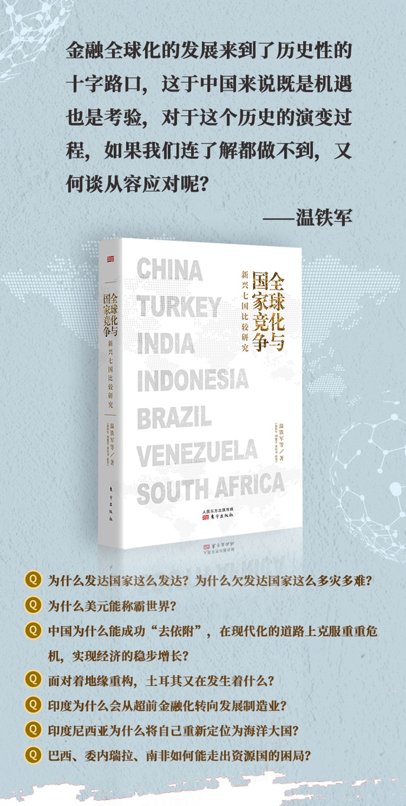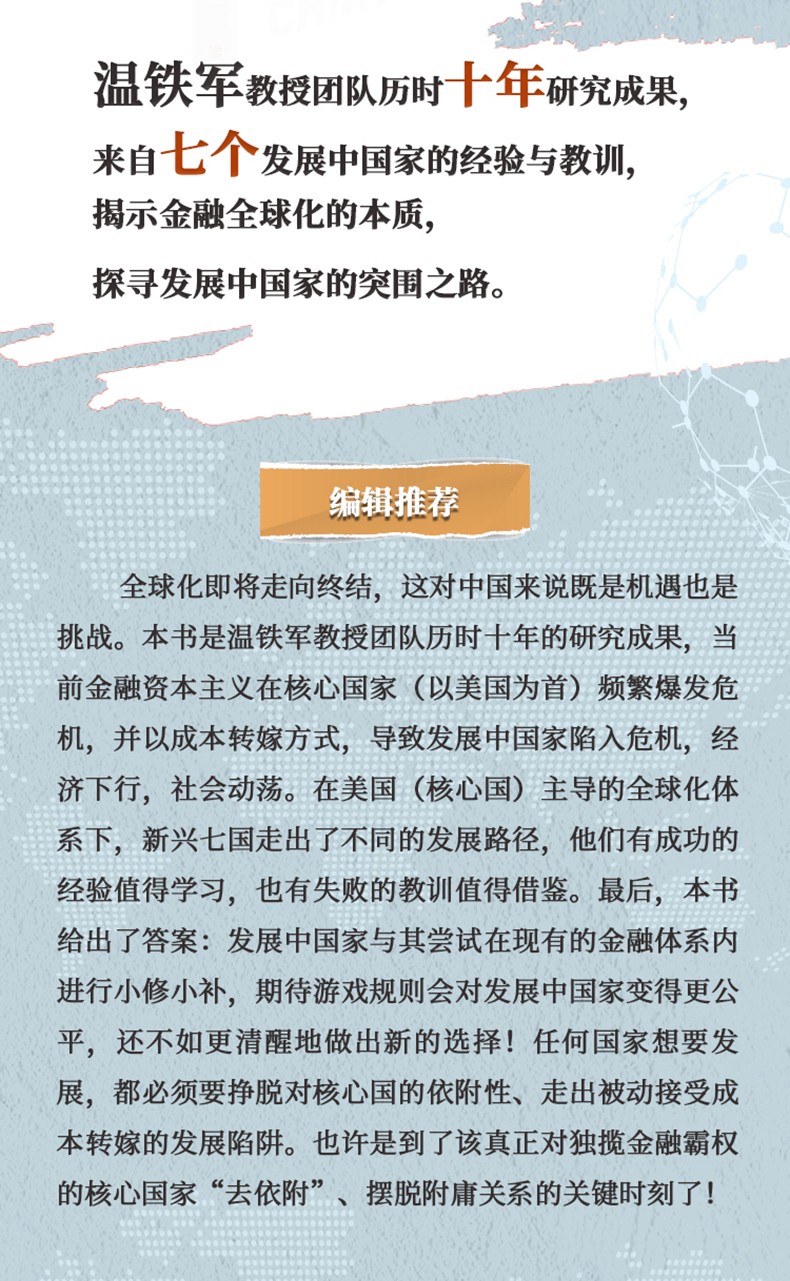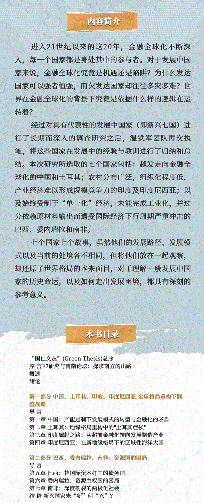 经过对具有代表性的发展中国家(即新兴七国)进行了长期而深入的调查研究之后,温铁军团队再次执笔,将这些国家在发展中的经验与教训进行了归纳和总结。本次研究所选取的七个国家包括:越发走向金融全球化的中国和土耳其;农村分布广泛,组织化程度低,产业经济难以形成规模竞争力的印度及印度尼西亚;以及始终受制于“单一化”经济,未能完成工业化,并过分依赖原材料输出而遭受国际经济下行周期严重冲击的巴西、委内瑞拉和南非。