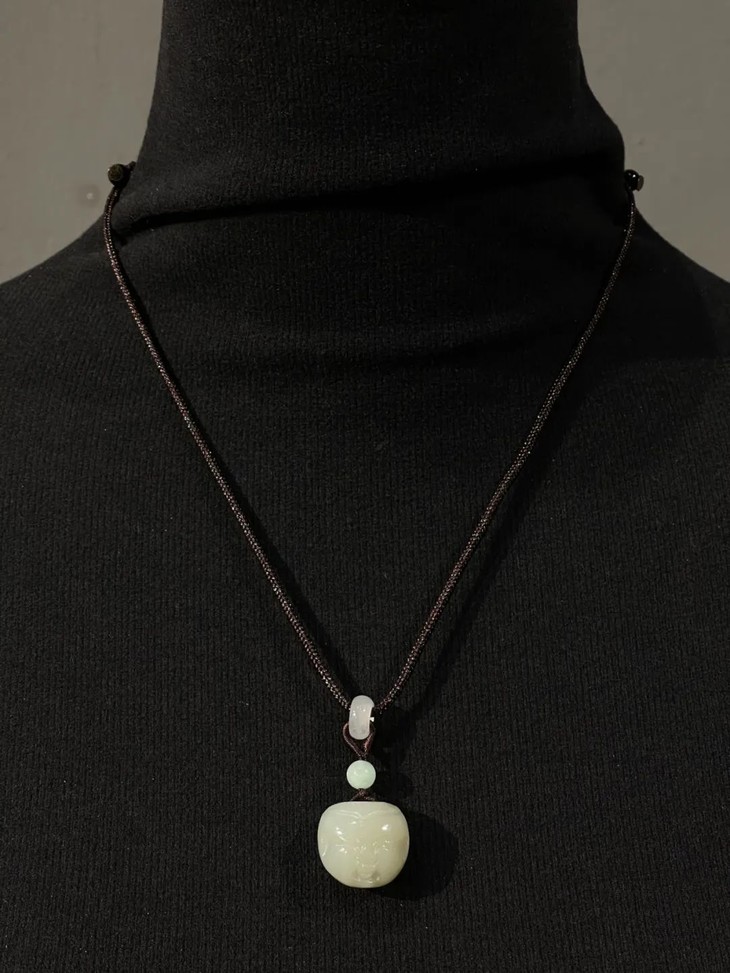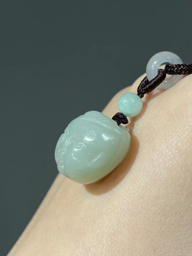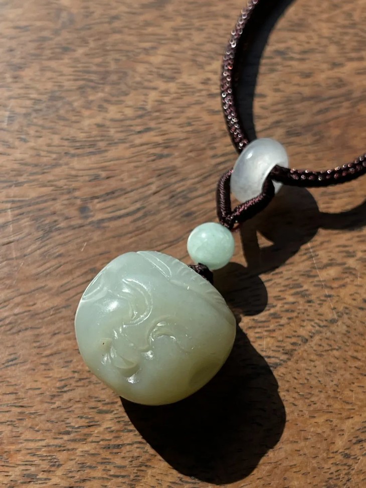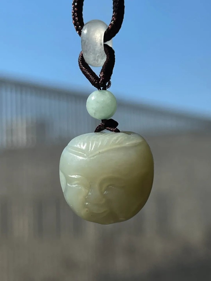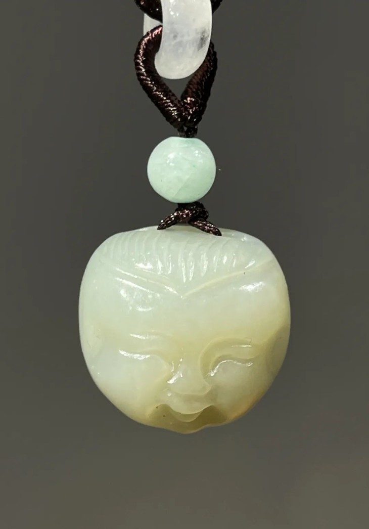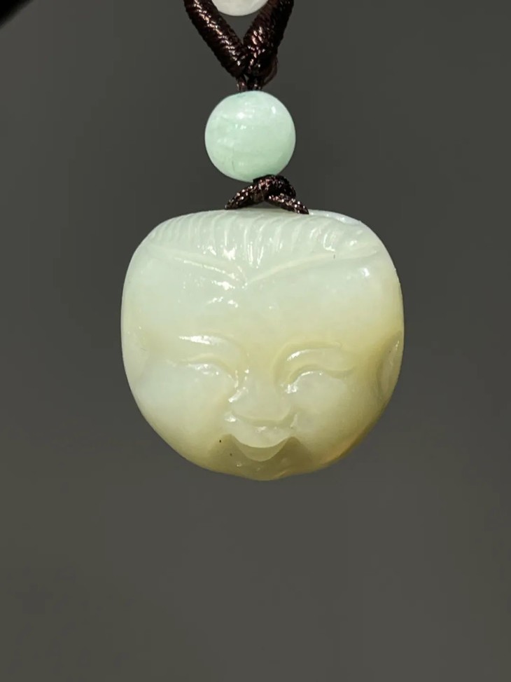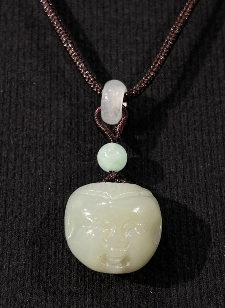 此和田白玉雕戏曲人物头像,塑形构图生动自然,形式典雅贵气,玉質好、雕刻精美,皮壳包浆醇厚,上方钻两孔穿绳结成绳结项链,入手即可佩戴。此和田白玉雕戏曲人物头像,除边沿微小磕碰外,保持完好无损。