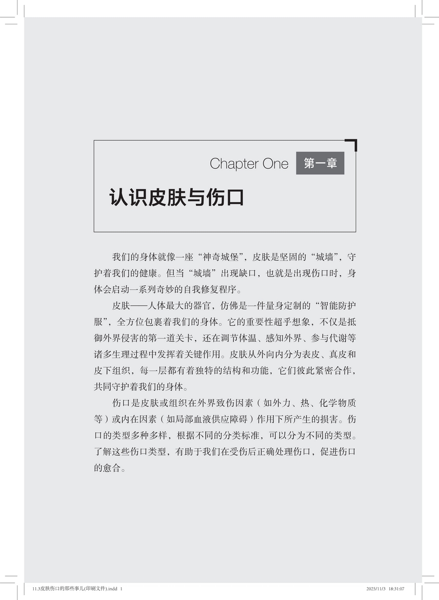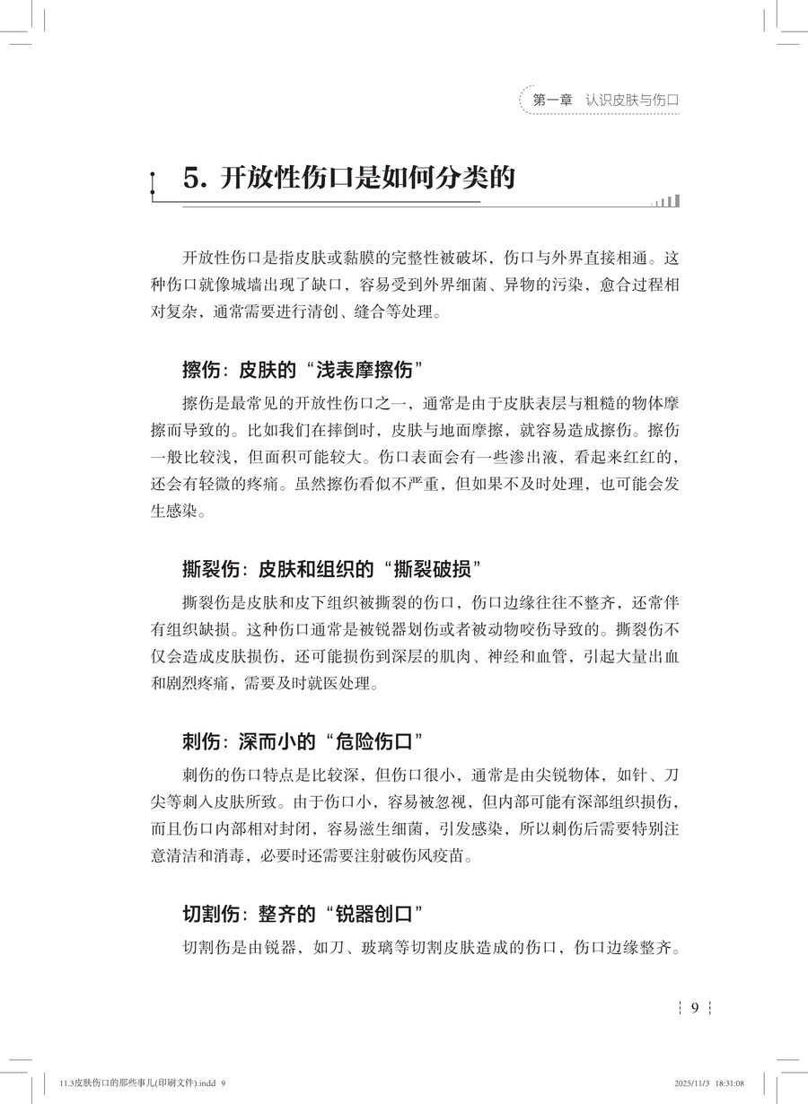 随着人们健康意识的不断提升,对皮肤健康的关注也日益增加。皮肤作为人体最大的器官,不仅承载着保护身体的重任,也是个人形象的重要体现。然而,生活中难免会遇到各种意外伤害,导致皮肤出现伤口。如何正确处理这些伤口,促进愈合,减少疤痕形成,成为了许多人关心的问题。本书旨在通过通俗易懂的语言,系统介绍皮肤伤口的基本知识、处理方法、护理技巧以及预防措施,帮助读者在家中就能科学应对皮肤伤口问题,为广大读者提供一份实用、贴心的健康指南。