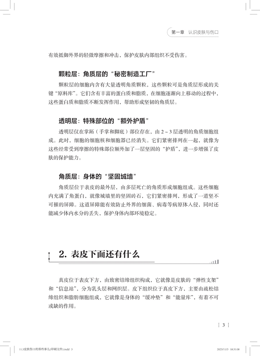 本书的编写初衷,是希望将专业的医学知识转化为通俗易懂的实用指南。无论是家庭常见的轻微创伤,还是糖尿病患者的慢性伤口,都能从中找到针对性的解决方案。我们特别关注老年人、儿童、运动员等特殊群体的需求,也强调了心理情绪对愈合的影响因为伤口的康复不仅是生理过程,更是一场身心合一的修复之旅。每个人的身体都具备令人惊叹的自愈能力,而正确的护理方法能让这种能力发挥到极致。愿这本书成为您和家人在面对伤口时的可靠伙伴,让科学的知识守护健康,让理性的行动化解危机。生命的第一道防线,值得我们用心呵护!《皮肤伤口的那些事儿》编写组2025年10月
