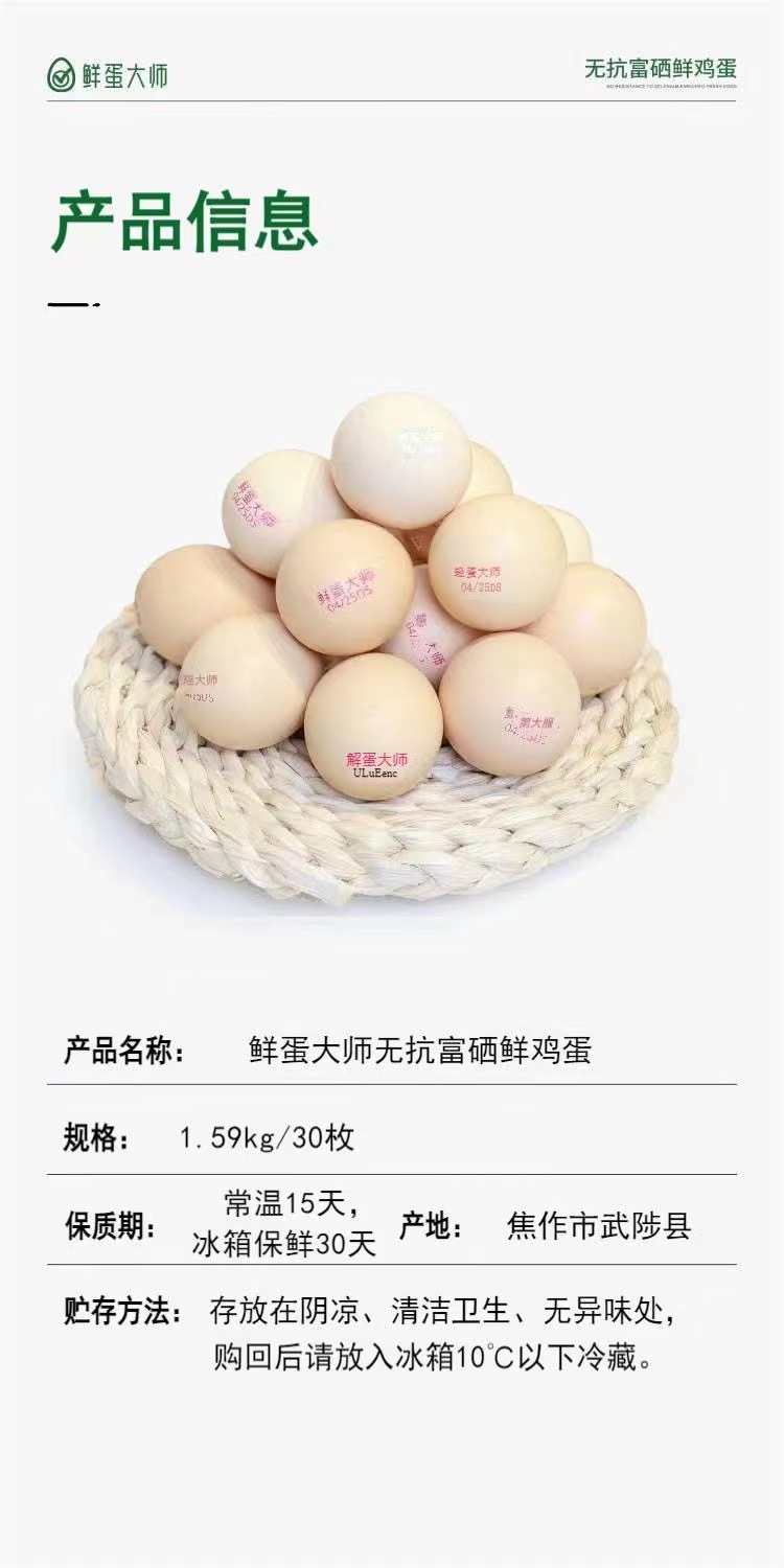 | 【品名】鲜蛋大师无抗富硒鲜鸡蛋 【规格】30枚装(单枚约50g) 【产地】河南焦作 【发货地】河南郑州 【发货快递】德邦 【不发货区域】新疆、西藏、港澳台不发货 【补运费地区】黑龙江、甘肃、吉林、辽宁、贵州+1元,云南、宁夏、内蒙、青海、海南+2元 【发货时效】48小时,周末节假日顺延 |