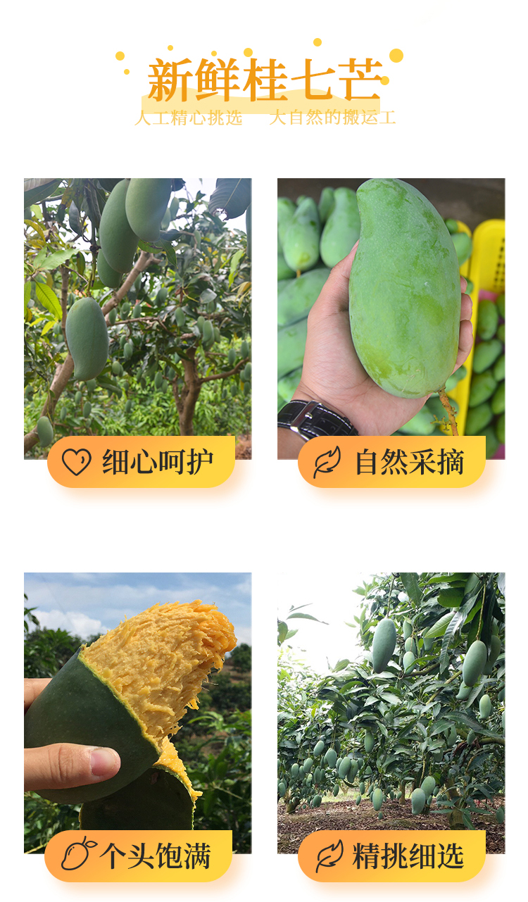 1.芒果发货为7-8分成熟的果,手指按压果肉变软即可食用,收到未成熟请放纸箱继续存放,熟后芒果口感更佳,熟后才可放入冰箱冷藏嗷!
