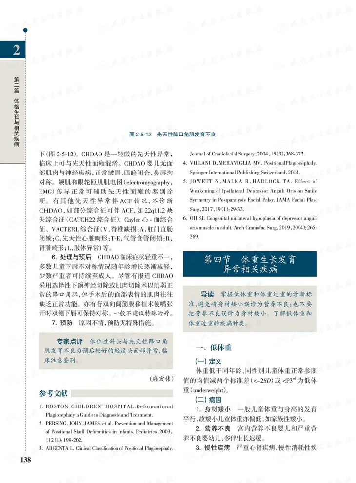 全书共7篇34章,在上一版基础上,补充新知识、新技术,从临床需要出发,内容全面、丰富讲述儿童保健临床实际内容。基础理论与临床实践相结合,设立儿童保健学总论,体格生长与相关疾病,体格生长评价,神经、心理、行为发育与相关疾病,常见遗传性疾病诊断与鉴别,儿童营养、环境与健康,疾病预防等7篇,增加部分新章节,神经系统发育部分补充口腔运动敏感发育、大小便控制神经系统发育与功能鉴别,以及婴幼儿手势发育;内分泌常见疾病(甲状腺功能减退症与儿童糖尿病),功能性腹泻等;补充临床常见症状、体征鉴别,如斜头、枕秃、先天性降口角肌发育不良(歪嘴)、先天性束带综合征、扁平足、生长痛、舌系带短缩等;营养部分补充人乳喂养评估,人乳铁、维生素D、维生素K含量低的原因,婴儿期不宜食用蜂蜜,不必额外食用糖、盐,婴儿引入新食物时需避免发生高铁血红蛋白血症、胡萝卜血症等新内容,以飨读者。丰富的知识量,引人入胜、页页精彩,读来都会有满满的收获,是儿科医生、儿内科医生、儿童保健医生不可多得的案头佳作。