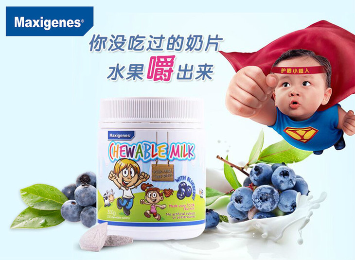 Maxigenes 美可卓 蓝莓味咀嚼奶片(护眼补钙)由纯天然蓝莓萃取物与100%纯正高品质的澳洲牛奶组成。让您食用简单 并享受到新鲜牛奶香味与蓝莓果。