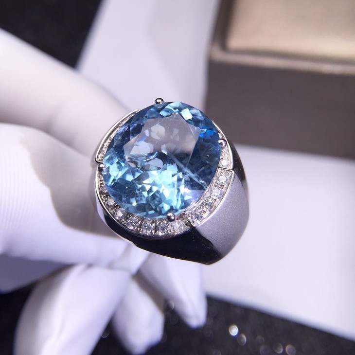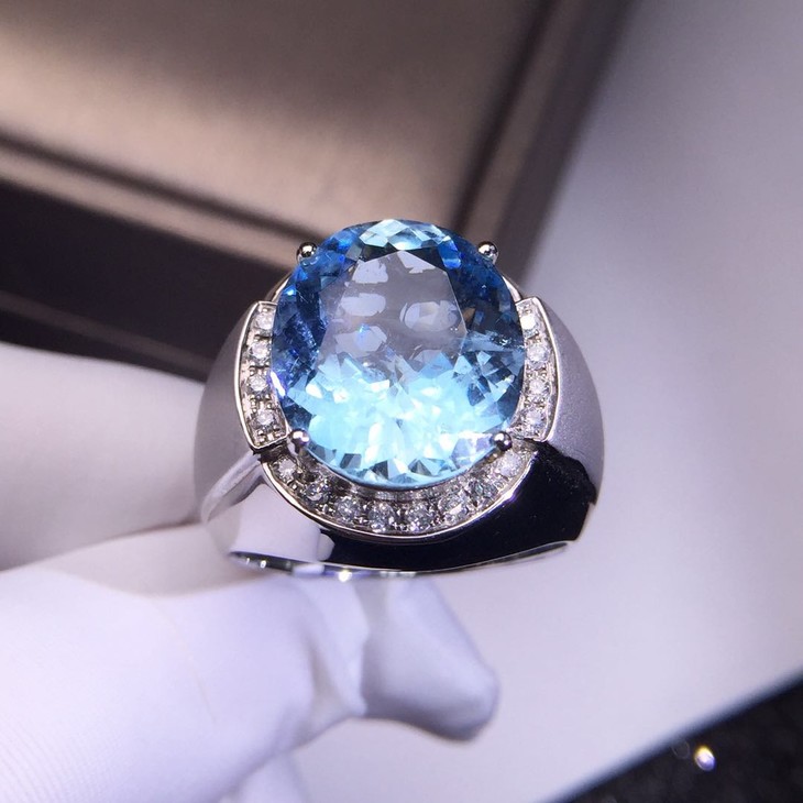 【56512】独家定制款海蓝宝男戒一枚,重达9.7克拉,18K金重金镶嵌,淡淡的蓝色,如海水般纯净浩瀚,清新可人,净度高,大台面,刻面切割,给人无尽的舒适之感,使人陷入无尽的眷恋。尺寸16.1*13.6mm,主石9.7克拉,钻石24颗,总重19.44g,圈口22,结缘价27600
