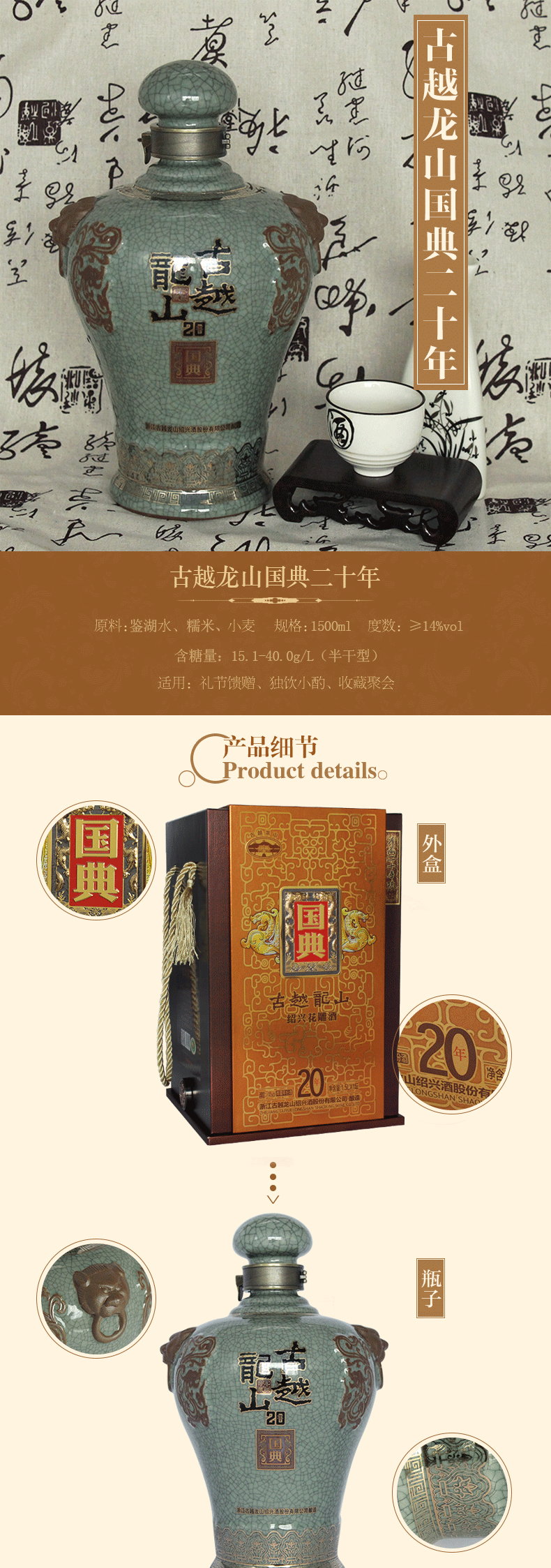 绍兴黄酒 古越龙山国典20年 花雕酒 1.5L青瓷礼盒