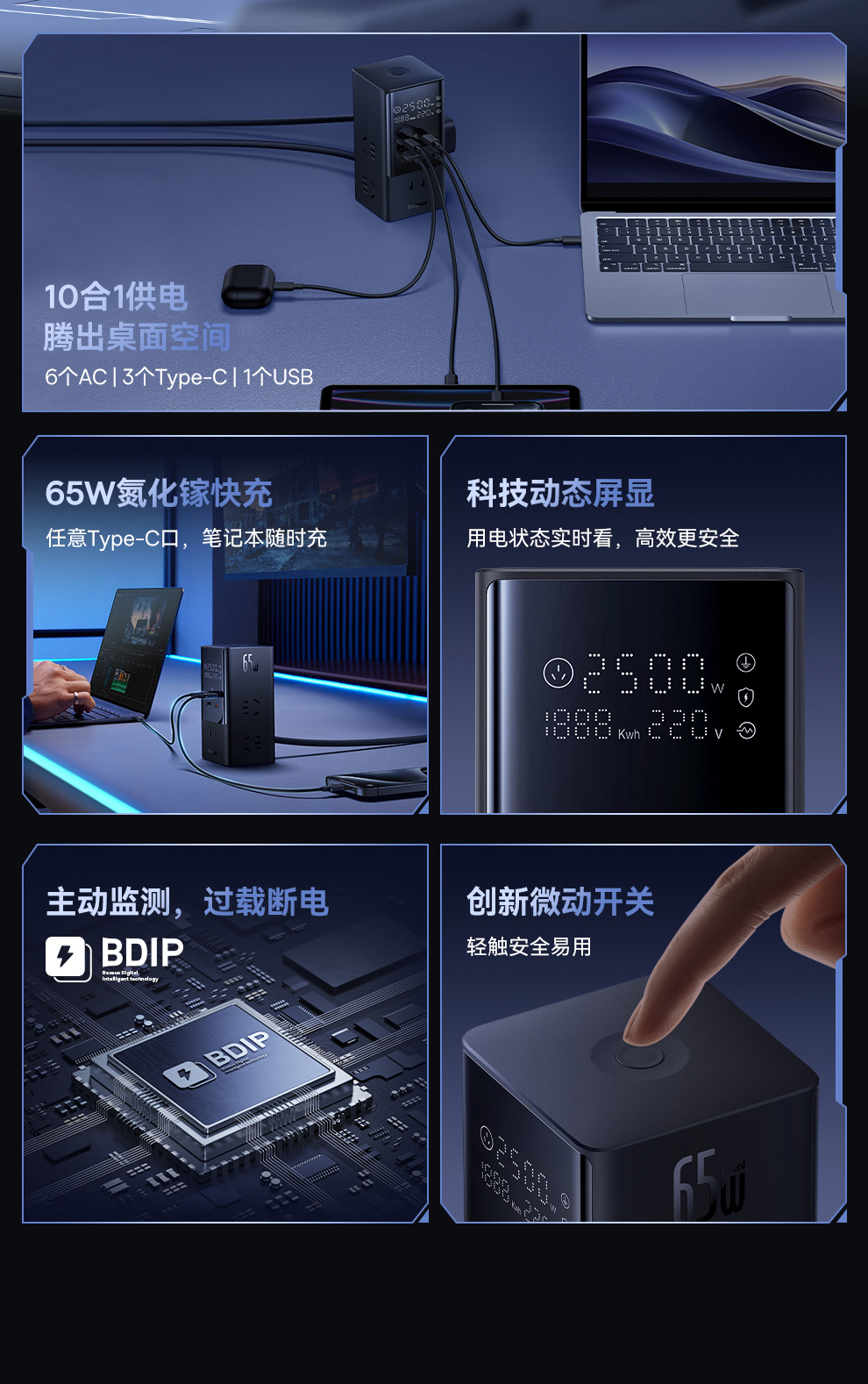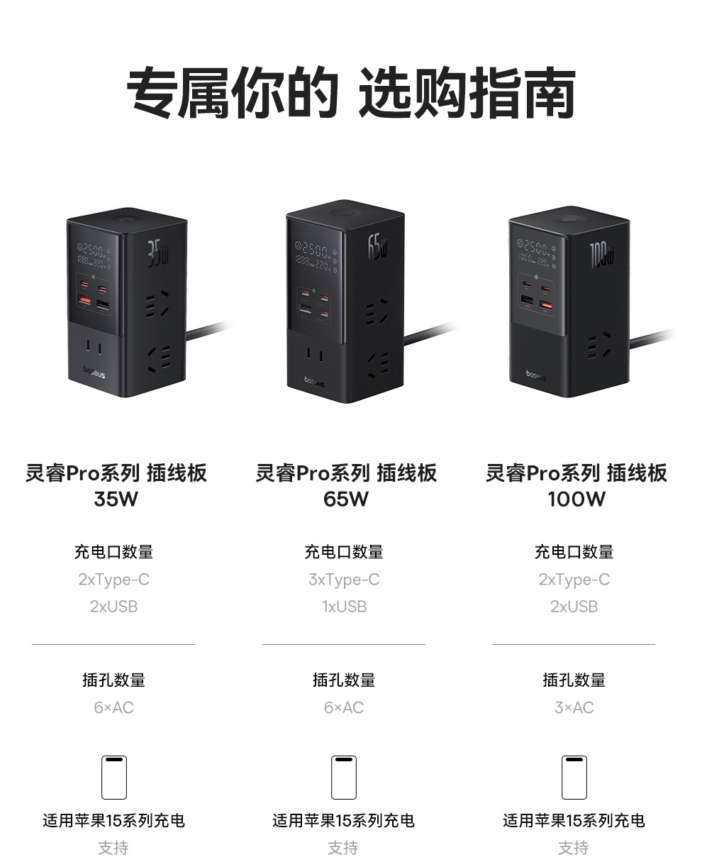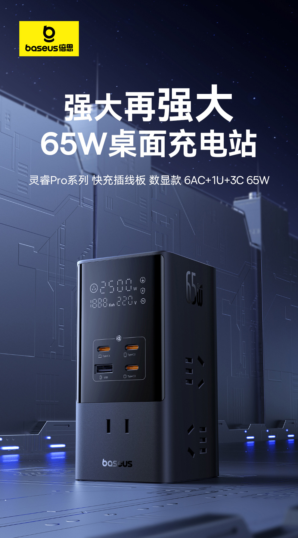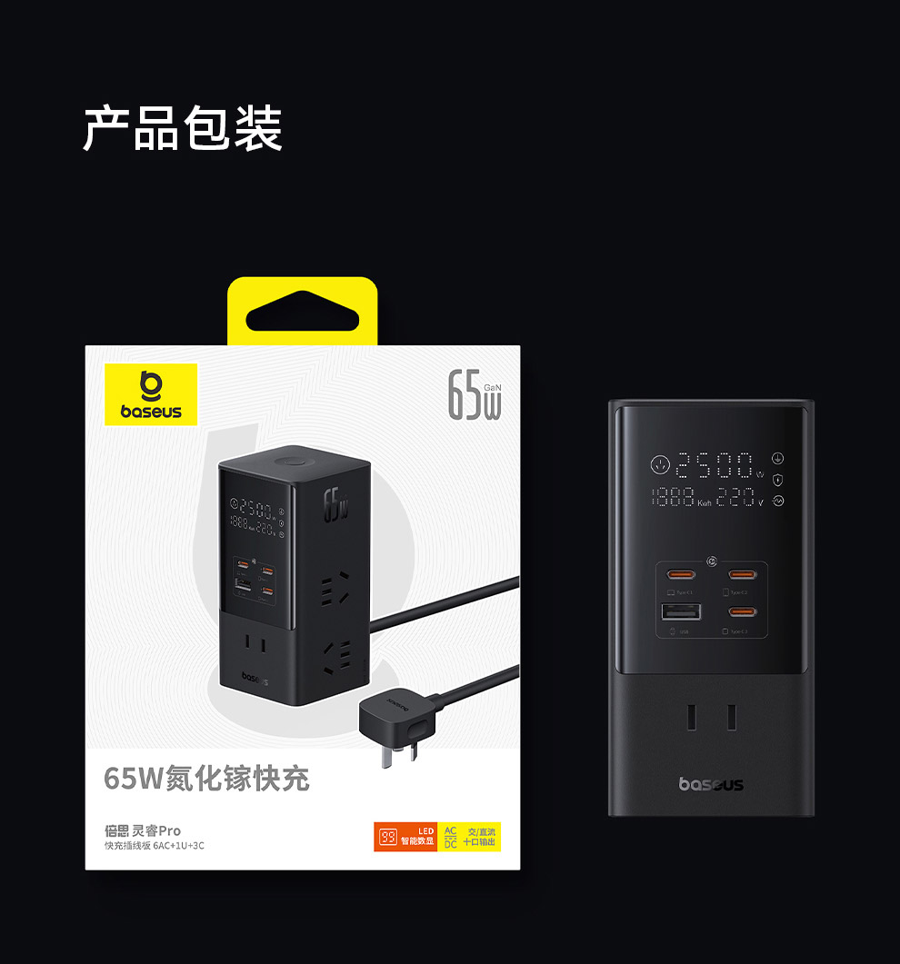 倍思 灵睿Pro系列 快充插线板 数显款 6AC+1U+3C 65W