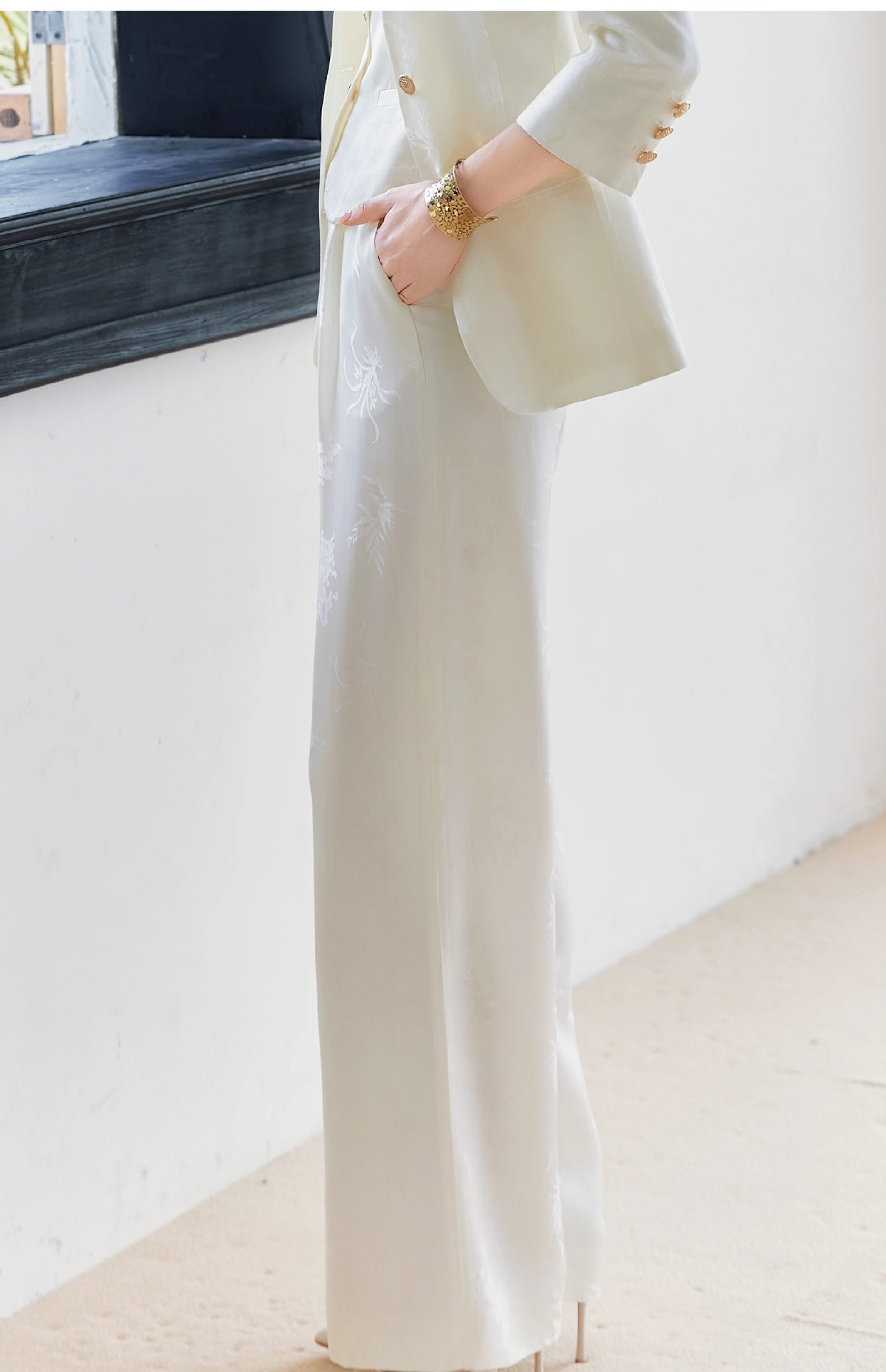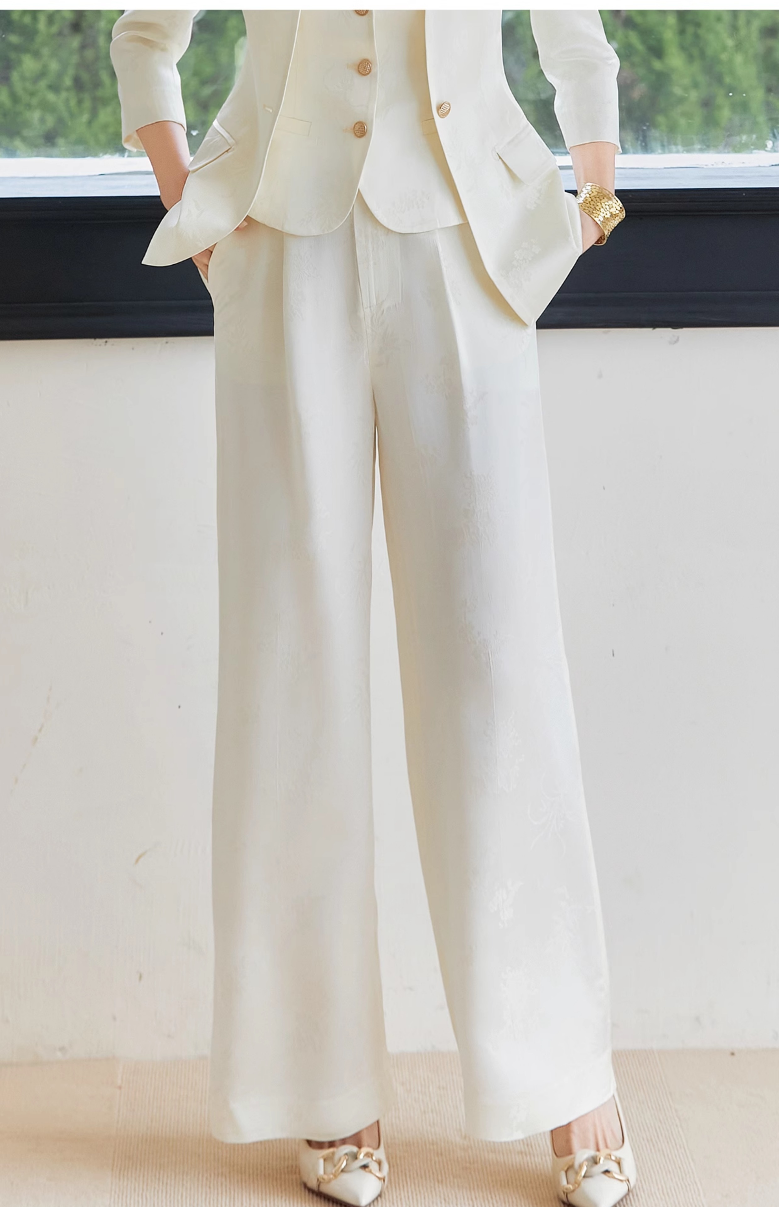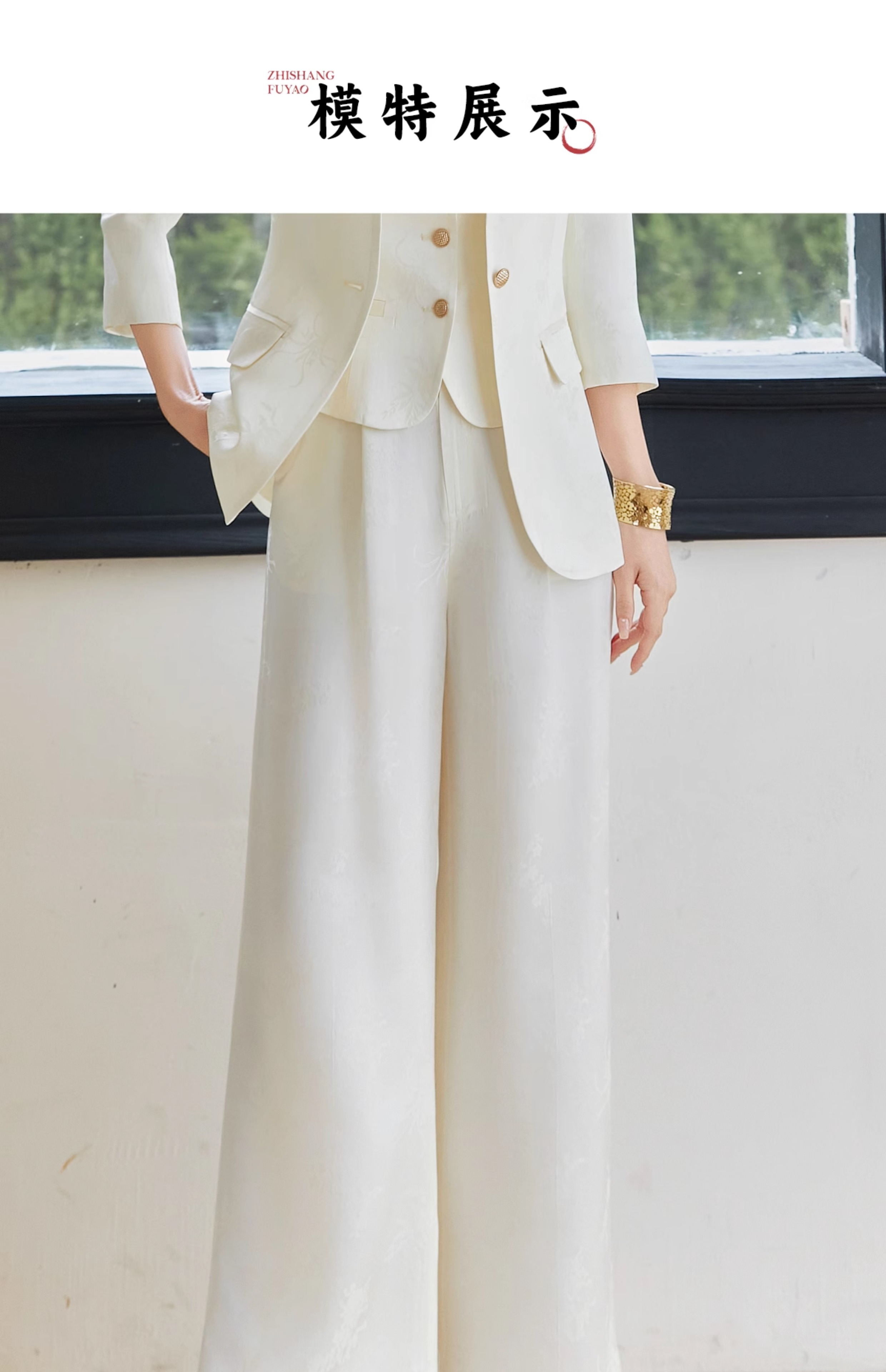 FUYAO扶摇 醋酸提花直筒裤女2025春新款国风休闲裤杏色垂感阔腿裤