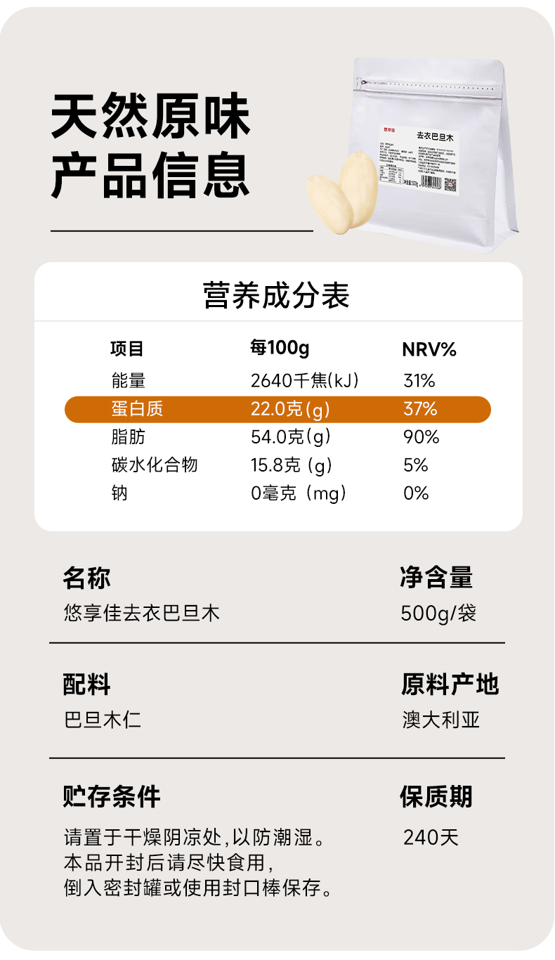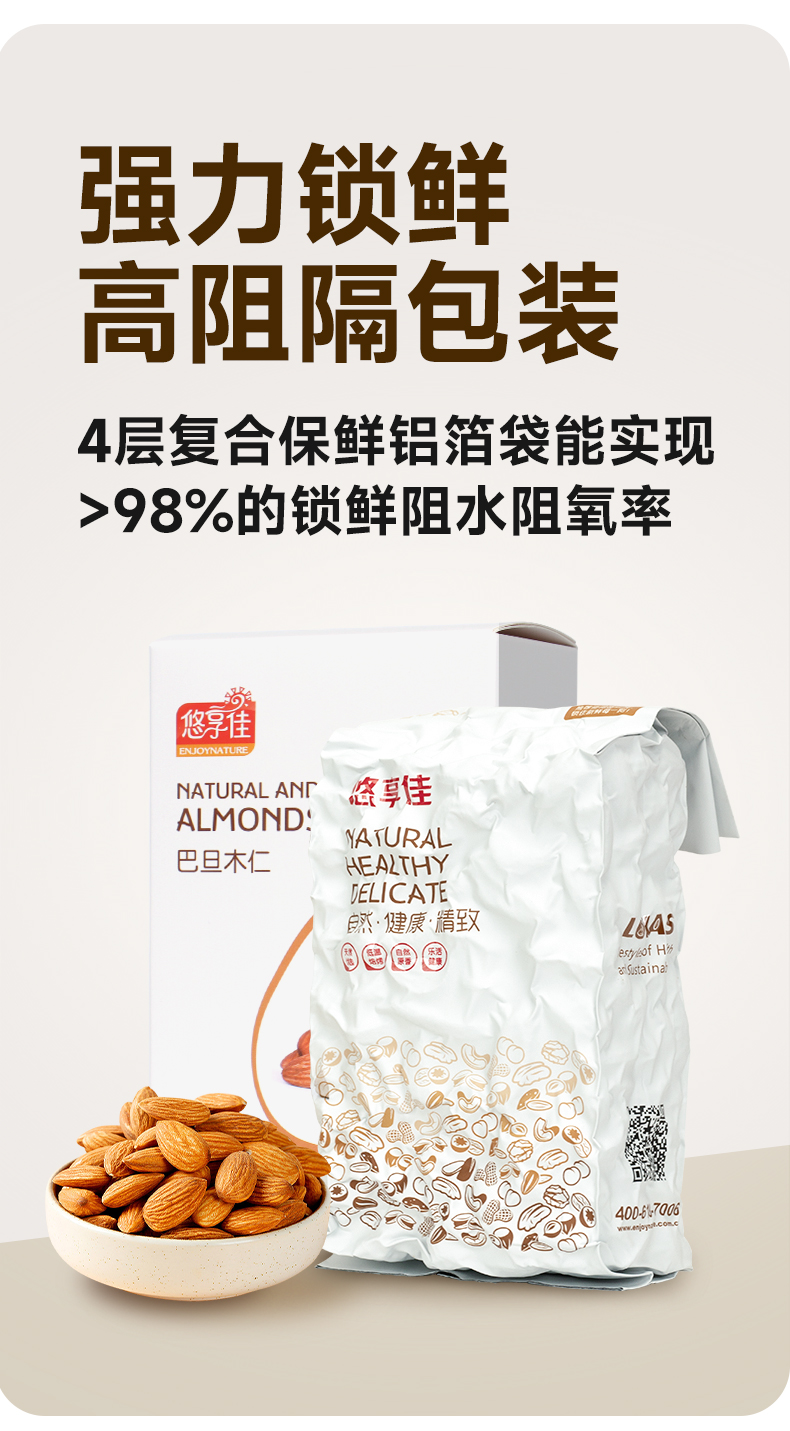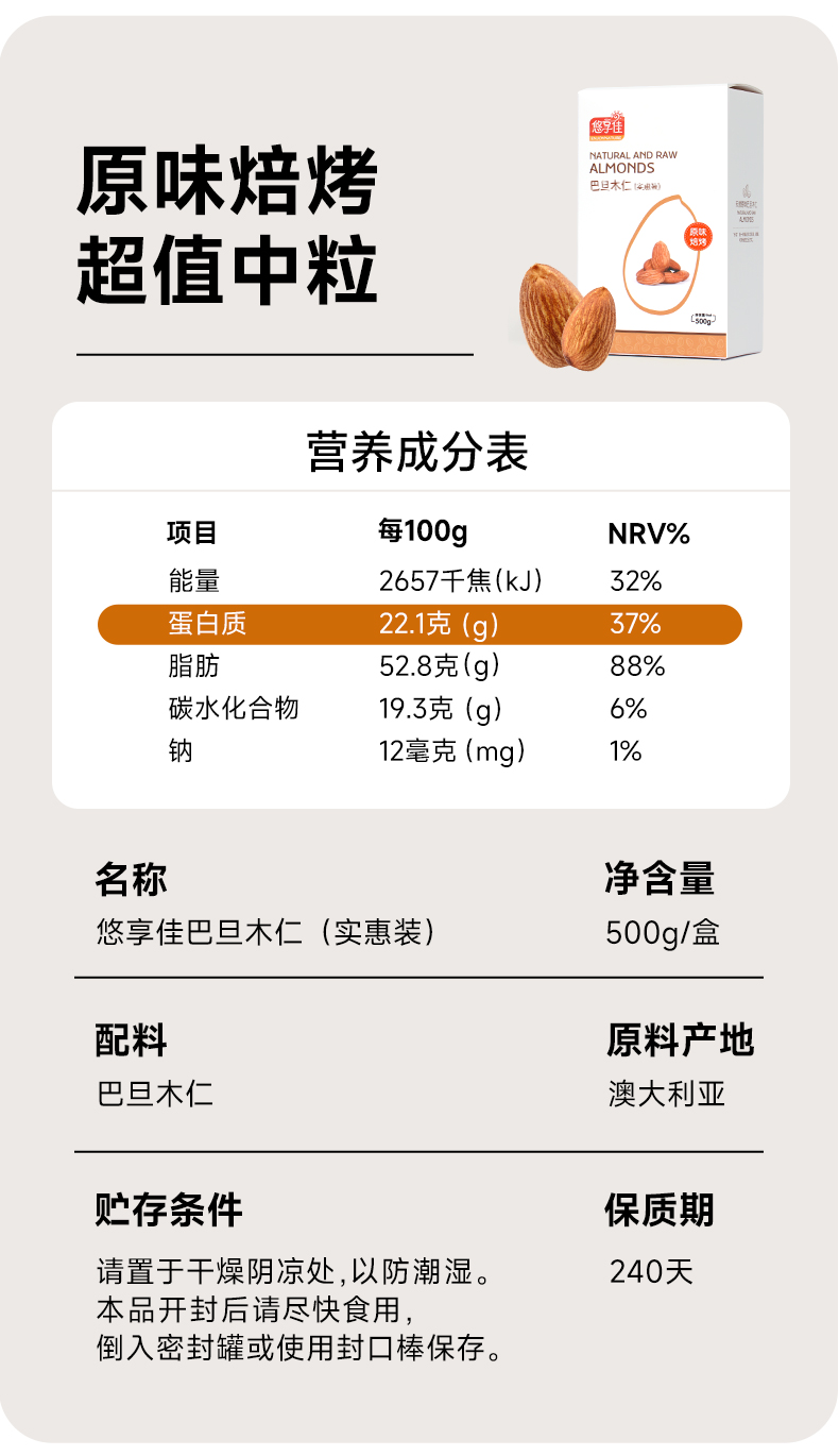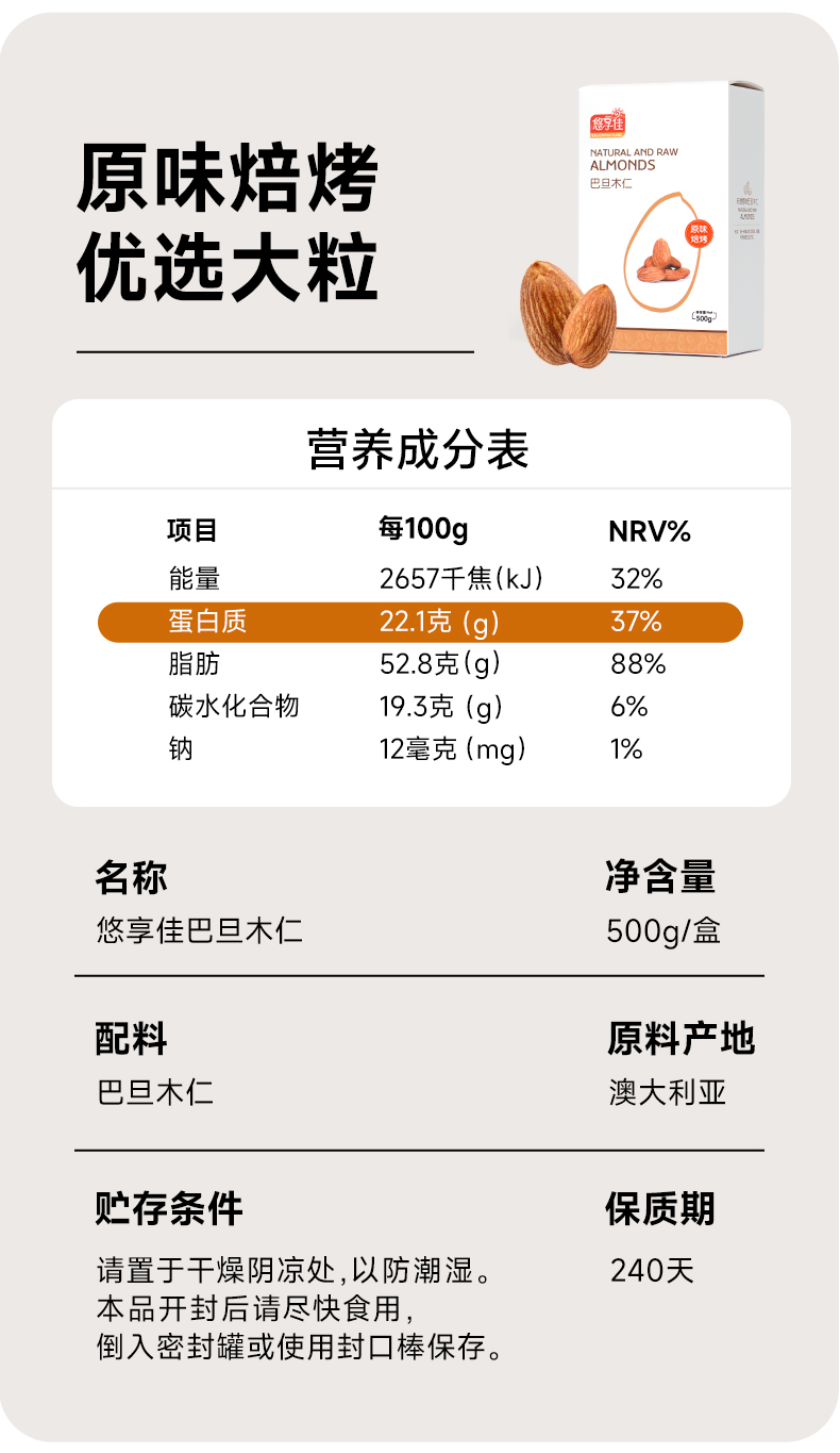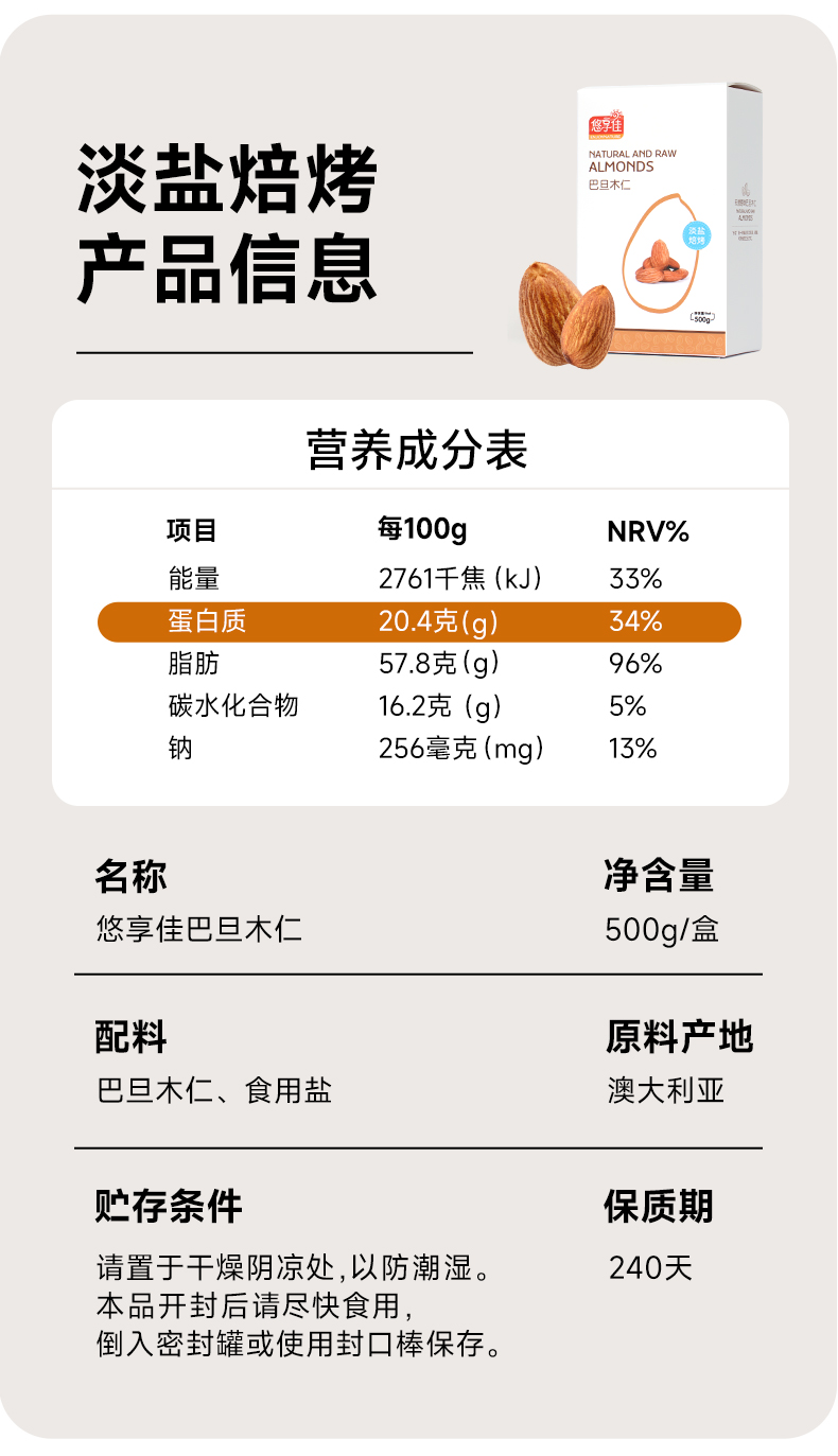 【悠享佳】悠享佳巴旦木仁500g原味盐焗孕妇零食扁桃仁烘焙烤炒货生熟干坚果