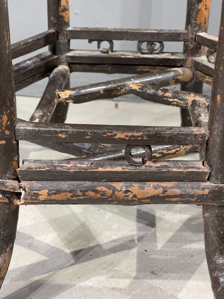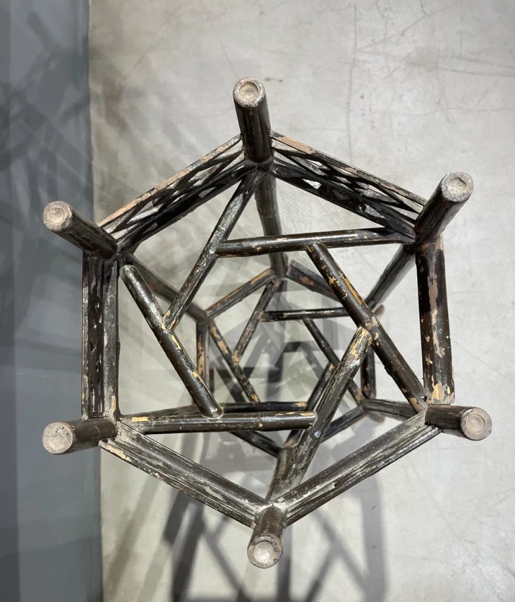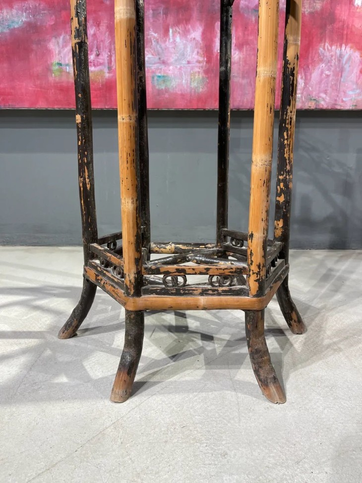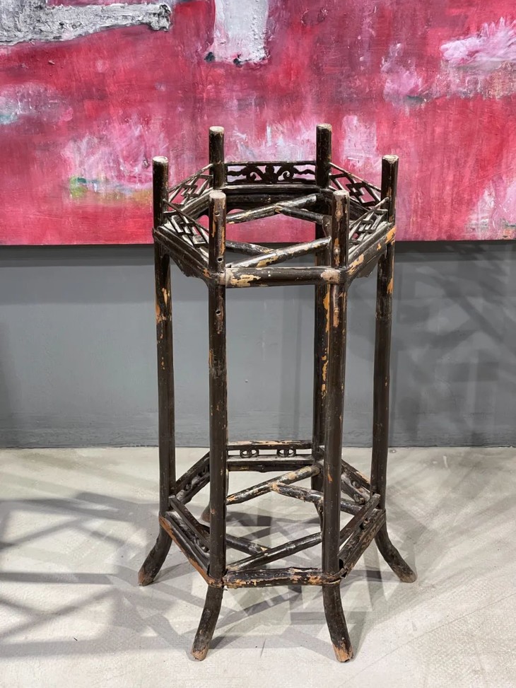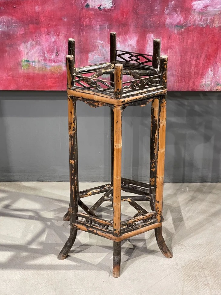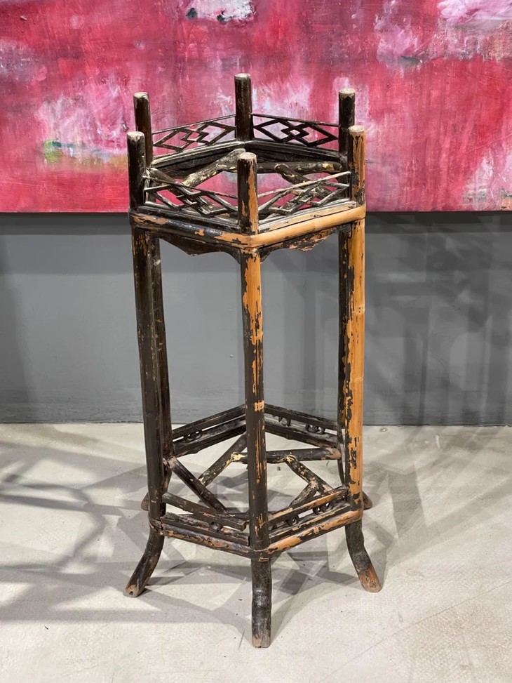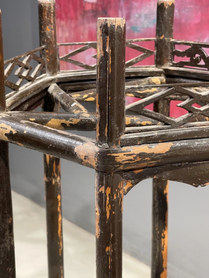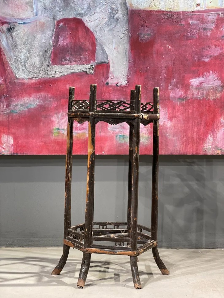 这是一件以竹筒构筑而成的老文房六方灯笼型水盆架,以天然江南孟宗竹竿精心构筑而成的传统明式家具风格六方灯笼型水盆架,是典型明清文人品味的书房或是富贵人家的经典实用家具,用于置放洗手盆的架子。此竹竿构筑六方灯笼型水盆架,以天然孟宗竹竿构筑而成,传统榫卯与竹钉建构,未使用铁钉、铁线或是黏胶结合,尽显古代竹制家具的精湛工艺。孟宗竹自然斑纹如行云流水,表面斑驳黑漆,老包浆醇厚,色泽金黄柔美,非常美丽,是文房里用于置放洗手盆的架子,取材天然竹材打造简约大气的造型,整体设计微妙精准,全然以手工编制构筑而成,实用器具却如此讲究,令人耳目一新。此竹竿构筑用于置放洗手盆的架子,如图所示,上层一方隔栏丢失,老黑漆斑驳脱落,边沿细微磕碰与表面细微磨痕、以及某些竹筒龟裂与榫卯略松动外,保存完好无损,竹表面包浆皮壳温润细腻。此竹制六方灯笼型水盆架年代久远,是民国时期或更早之文人书房或是茶室的竹制洗手水盆架。尺寸:高:81厘米; 长:49厘米,宽:43厘米,重量:2.05千克