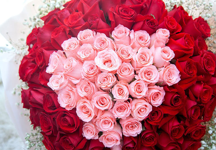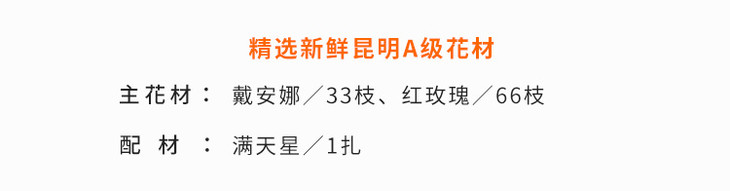 材料 33枝戴安娜粉玫瑰、66枝卡罗拉红玫瑰、10枝满天星