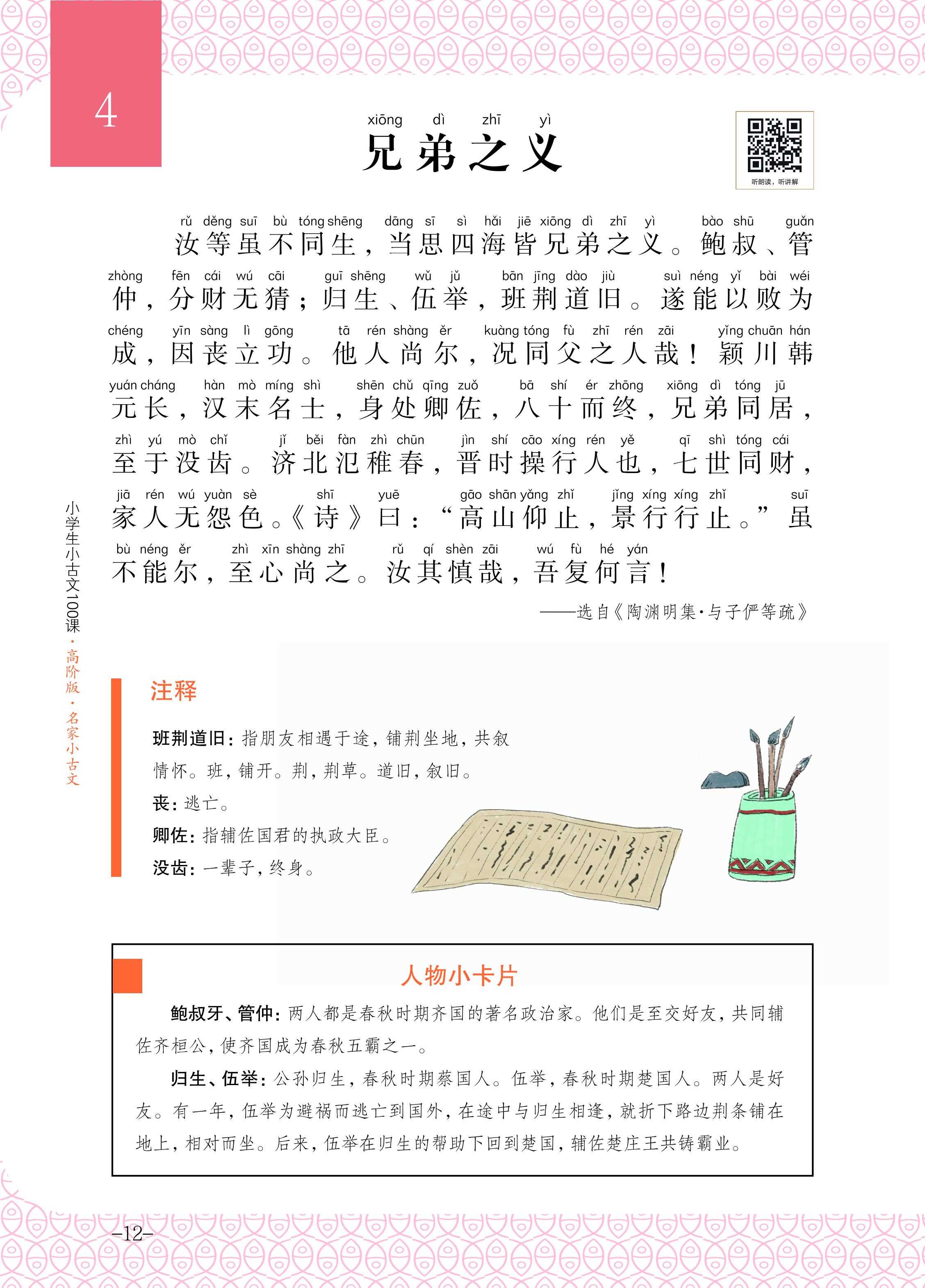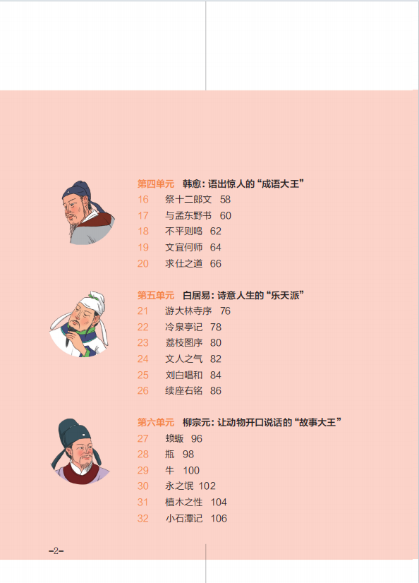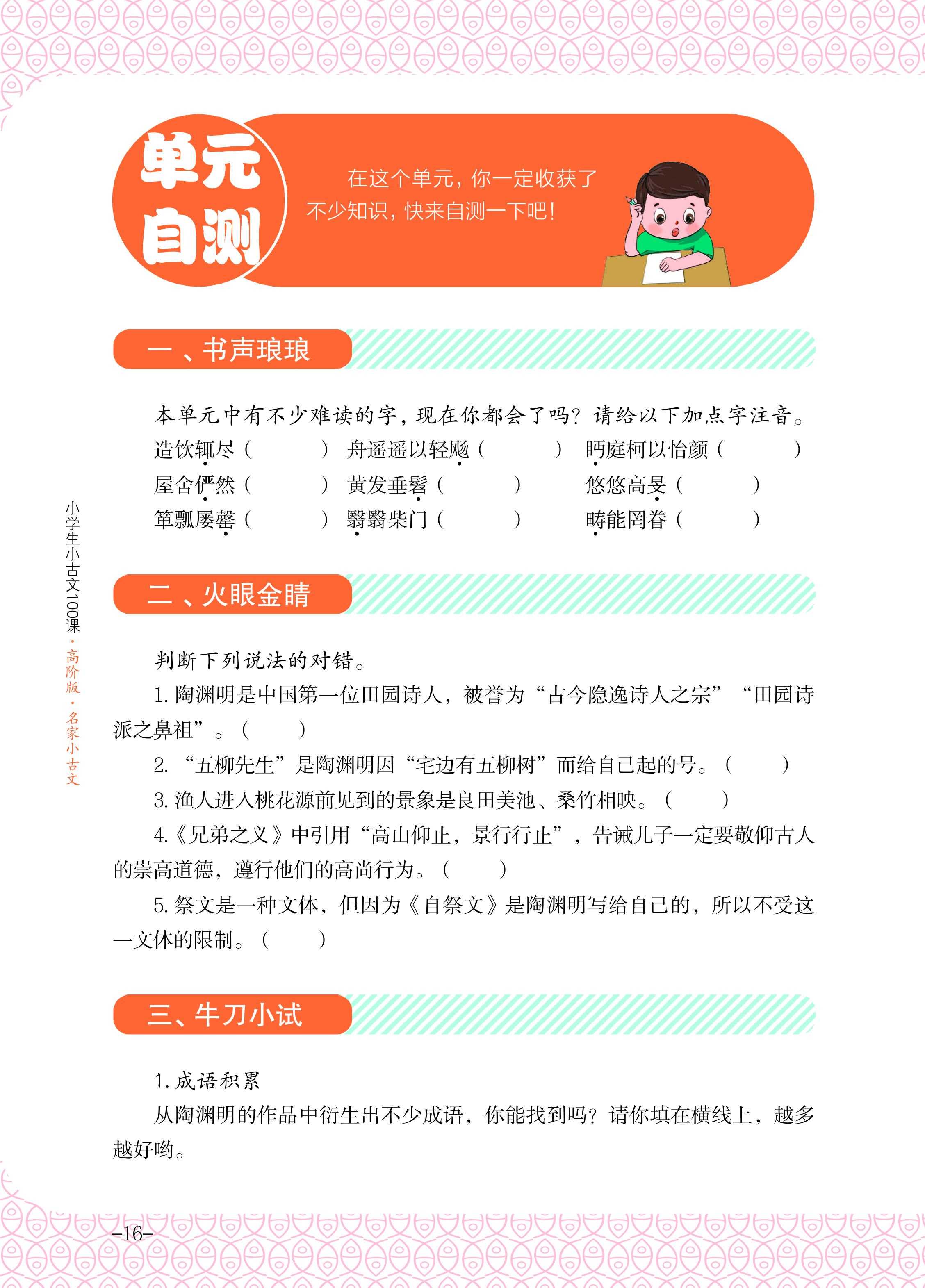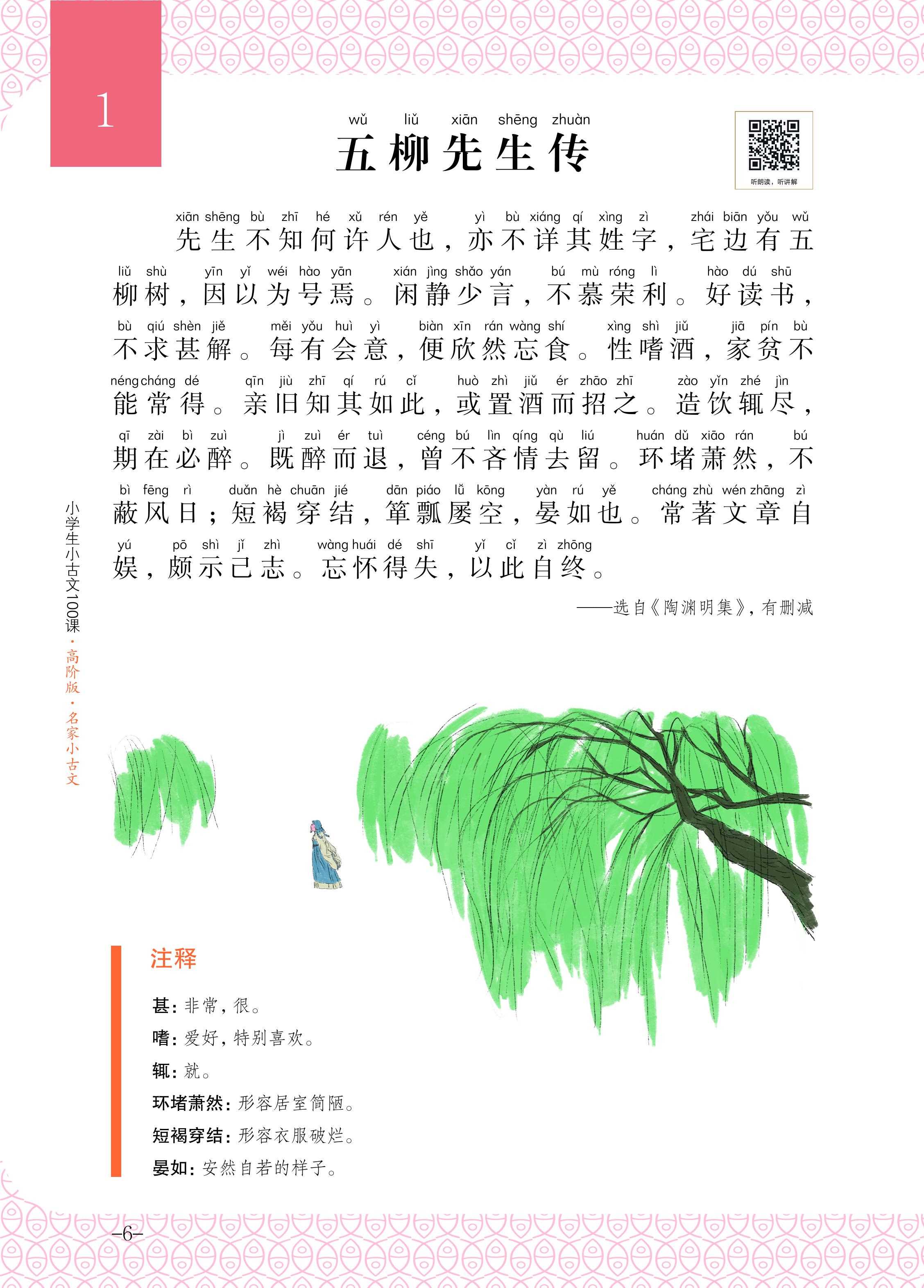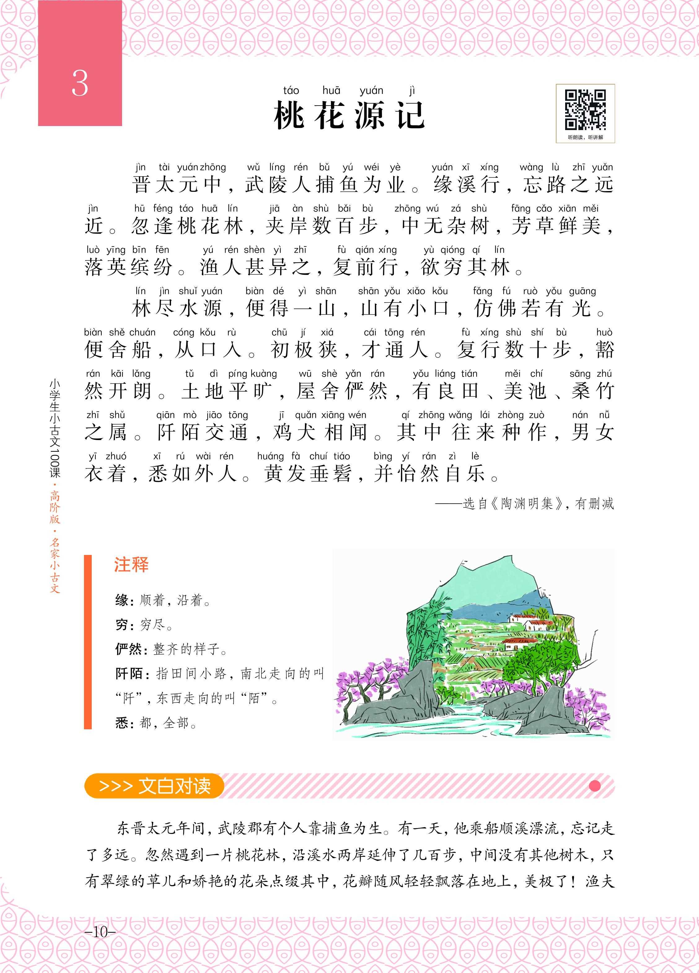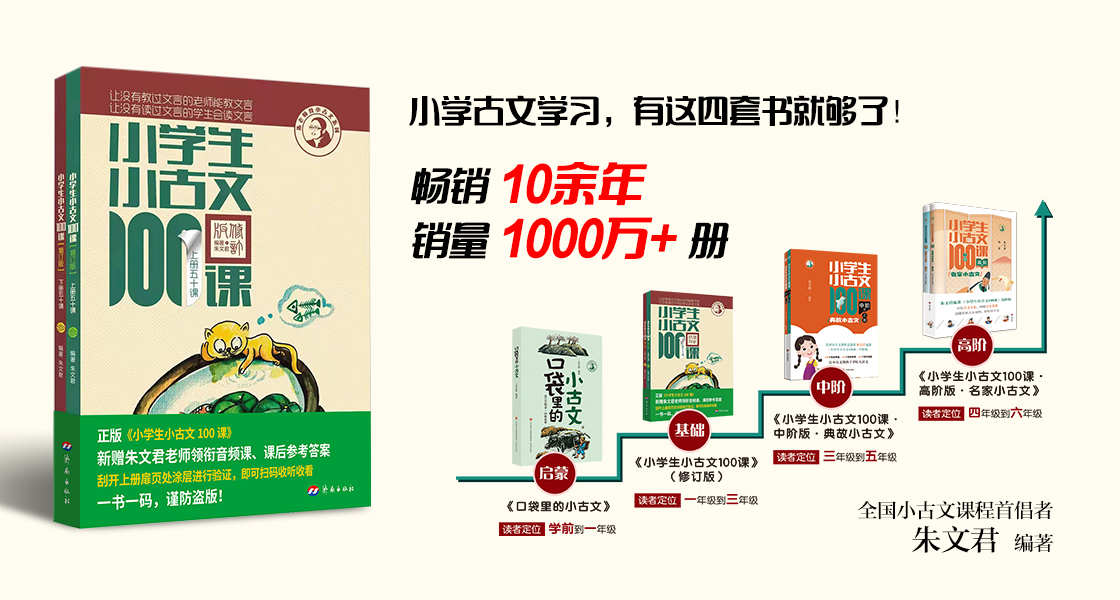 读完《小学生小古文100课》,读什么?趁热打铁来读名家名篇!小古文课程首倡者、千万级销量作者朱文君老师新作《小学生小古文100课高阶版名家小古文》专为五、六年级小学生量身打造。本书共上下两册,精选了陶渊明、李白、韩愈、白居易、柳宗元、欧阳修、苏轼、苏洵、苏辙、王安石等17位古文大家的99篇古文名篇,独创连环画式的人物生平介绍,将人物传奇故事与人物作品双线结合,让孩子全面、立体地认识更接地气的古文大家,亲其人,信其言,与古文大家交朋友,有共鸣,从而使阅读更容易、学习更系统,不知不觉打牢小学文言基础,奠基中学文言学习。